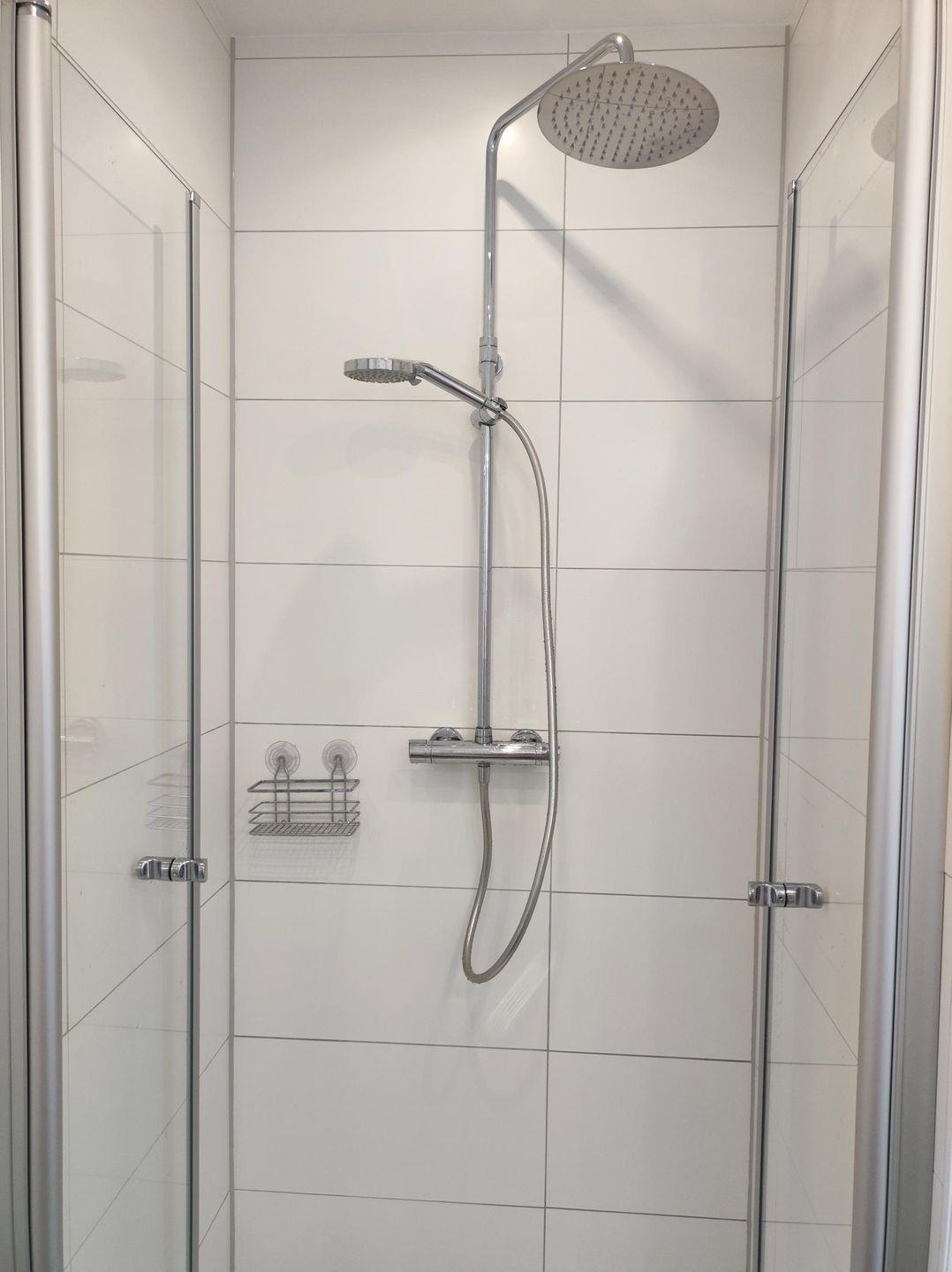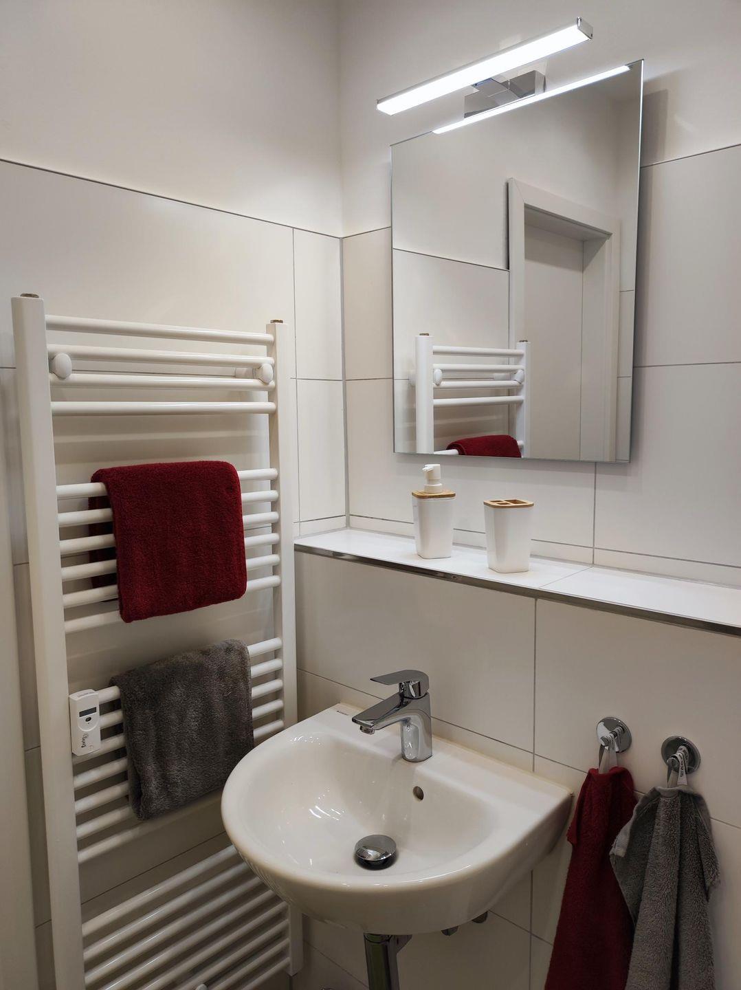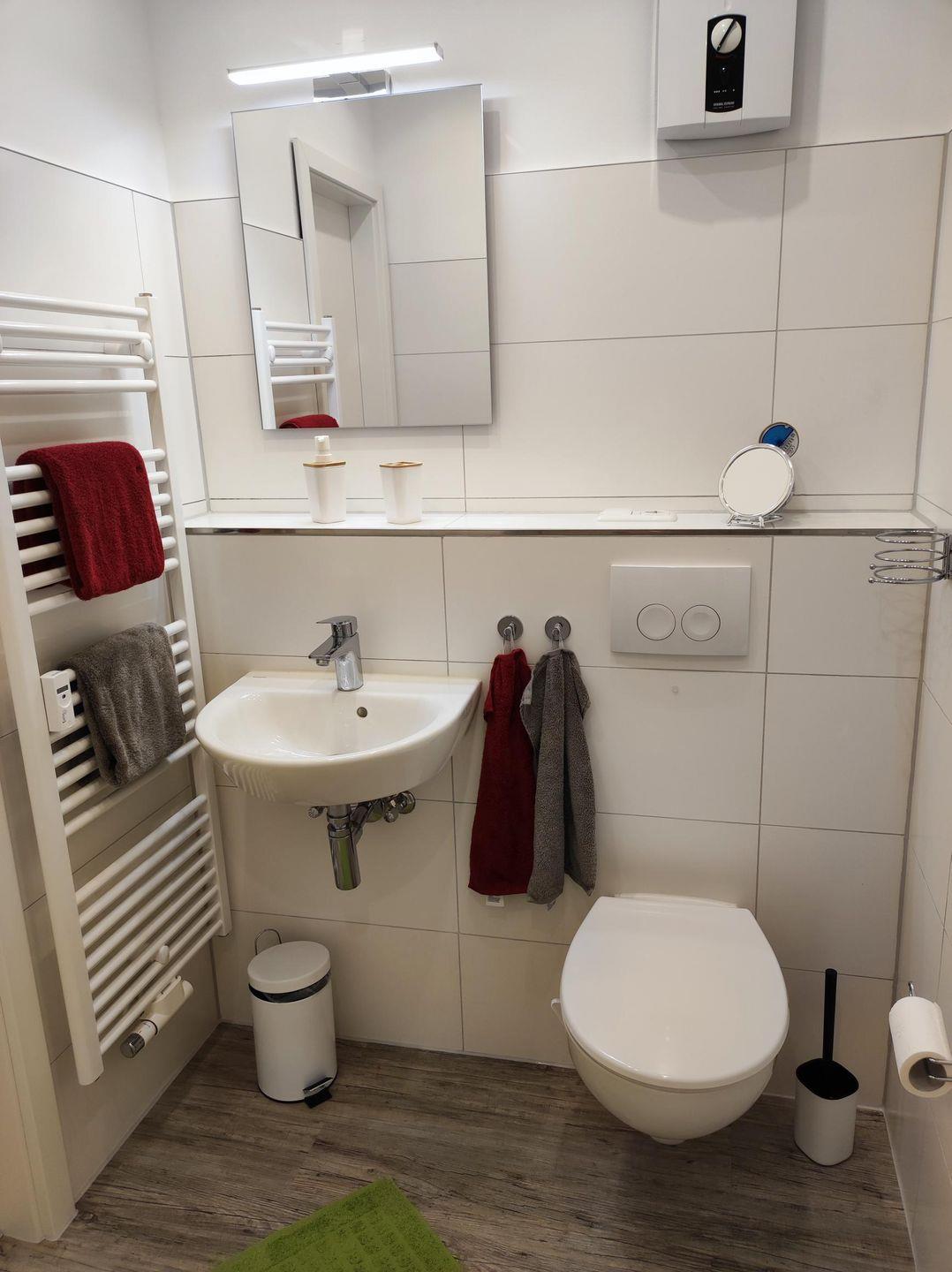Das neue, hell geflieste Bad verfügt über eine besonders geräumige Dusche mit Glaswänden und extra flachem Einstieg. Handtuchheizkörper, Steckdosen sowie ein beleuchteter Spiegel sind weitere Annehmlichkeiten, die Ihnen dieses Duschbad im Urlaub bietet.