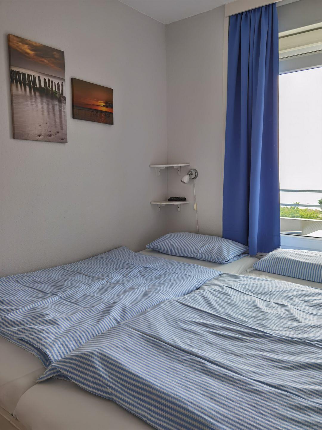 In dem separaten Schlafzimmer mit Ausblick auf den gesamten Südstrand mit Promenade und einem zweiten TV befindet sich ein Doppelbett und ein Kleiderschrank. Die Besonderheit an dieser Wohnung ist die gute Aufteilung und die Verfügbarkeit von noch zwei weiteren Schlafzimmern. Ein Schlafbereich hält ein Etagenbett vor und das zweite Schlafzimmer verfügt über ein Einzelbett.