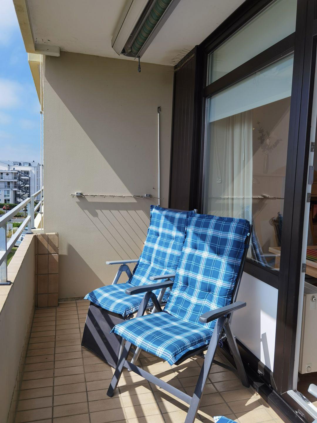 Vom Südbalkon genießen Sie aus dem 4. Stock den direkten, atemberaubenden Blick auf das glitzernde Meer zu Ihren Füßen. Gemütliche Hochlehner mit Polsterauflagen und ein Tisch laden zum Entspannen, Krafttanken und Sonnen ein.