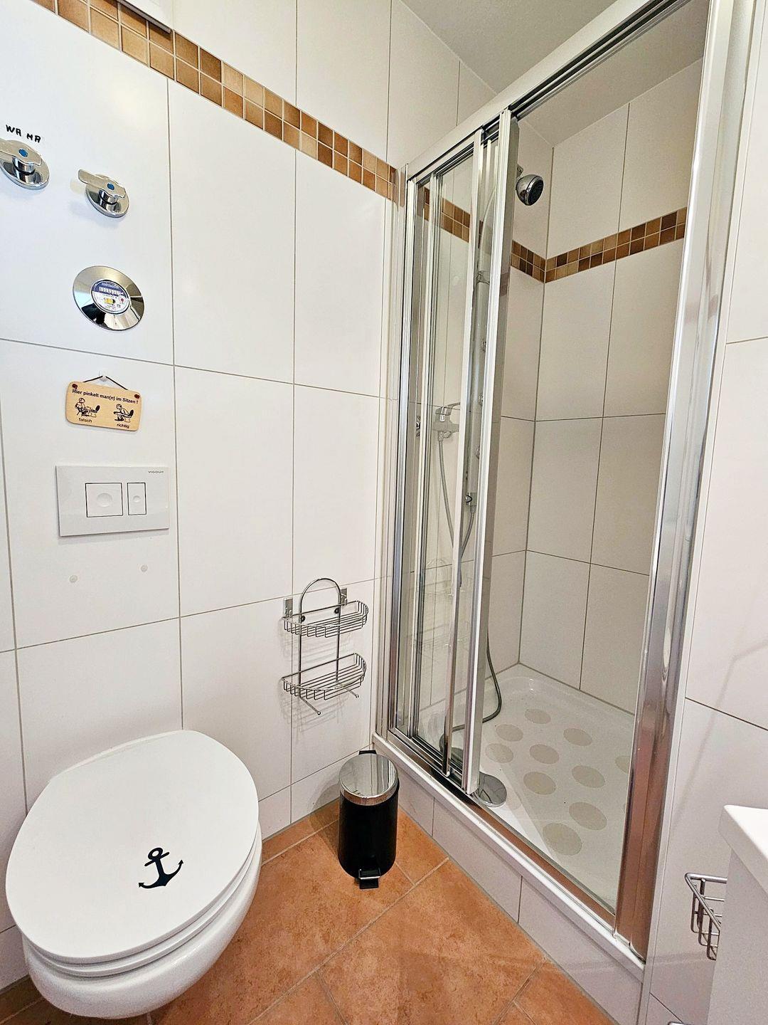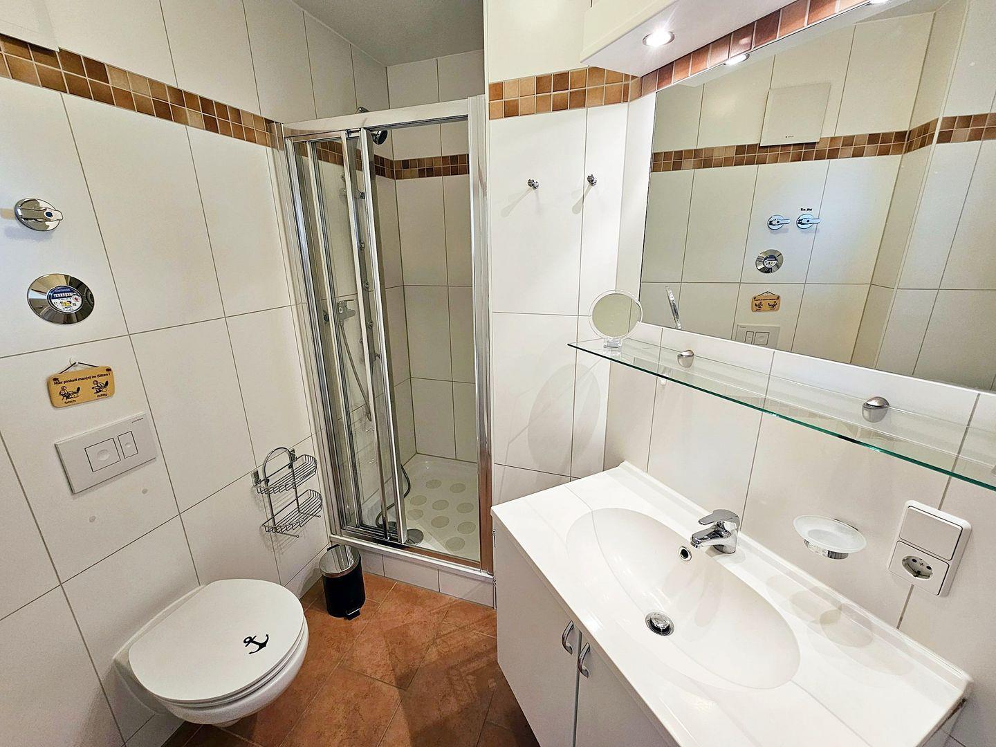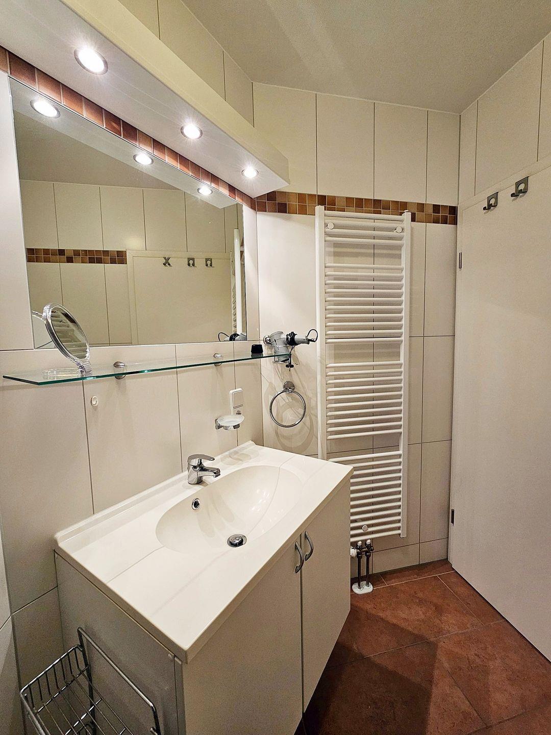 Im Badezimmer steht eine Dusche mit fester Duschwand, WC, Waschbecken mit beleuchtetem Spiegel und Unterschrank sowie ein Handtuchheizkörper bereit. Hier steht Ihnen auch eine Waschmaschine bei Bedarf zur Verfügung.