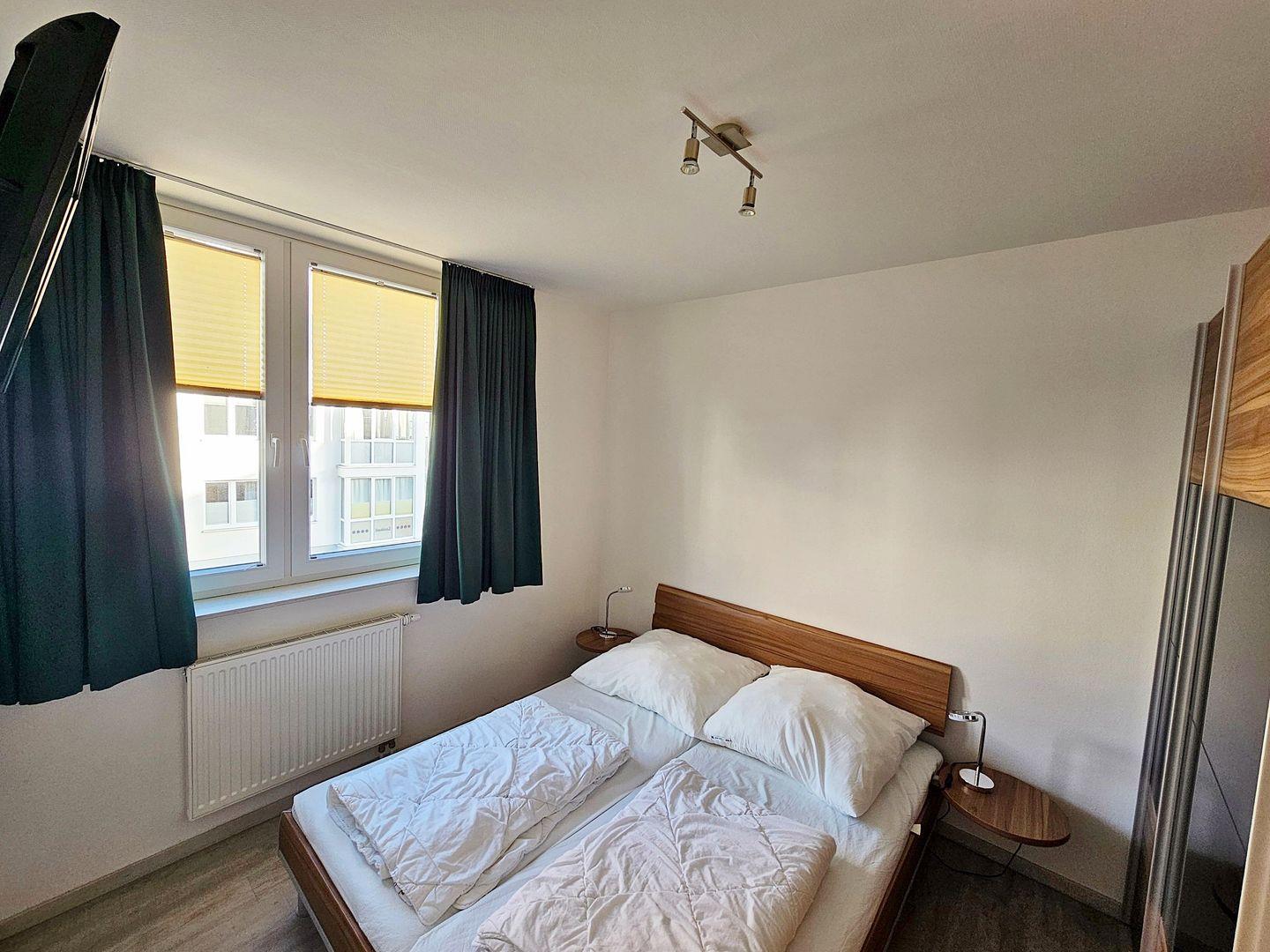 Im weiteren Schlafzimmer bietet ein großes Doppelbett (2*80*200cm) Platz für ruhige Nächte und ein großer Kleiderschrank viel Stauraum für Ihre Urlaubsgarderobe. Ein weiterer TV ist hier ebenfalls vorhanden. Die Fenster der Schlafzimmer sind durch Plissees und Vorhänge zu verdunkeln.