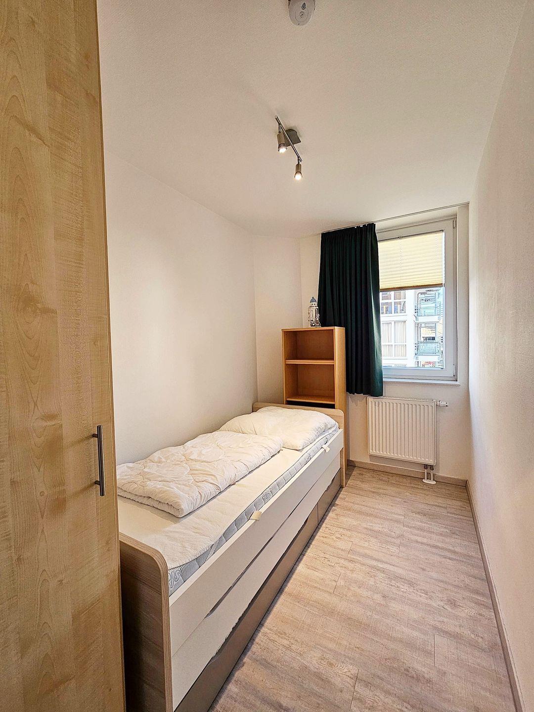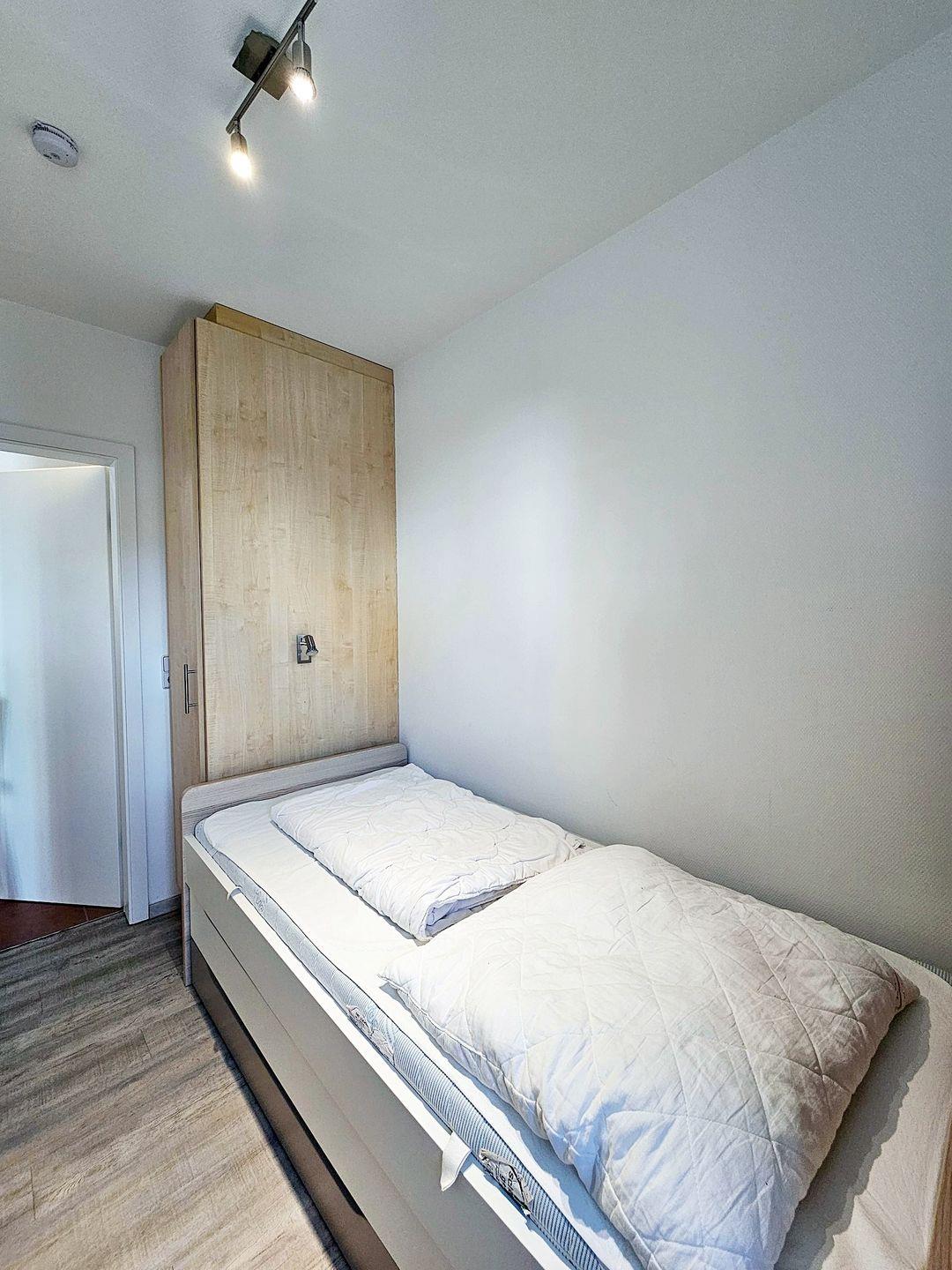 Im ersten Schlafzimmer finden bis zu zwei Gäste in einem Einzelbett sowie auf der ausziehbaren zweiten Schlafgelegenheit ein entspannendes Nachtlager. Ein Schrank für Ihren Kofferinhalt steht hier ebenfalls bereit.