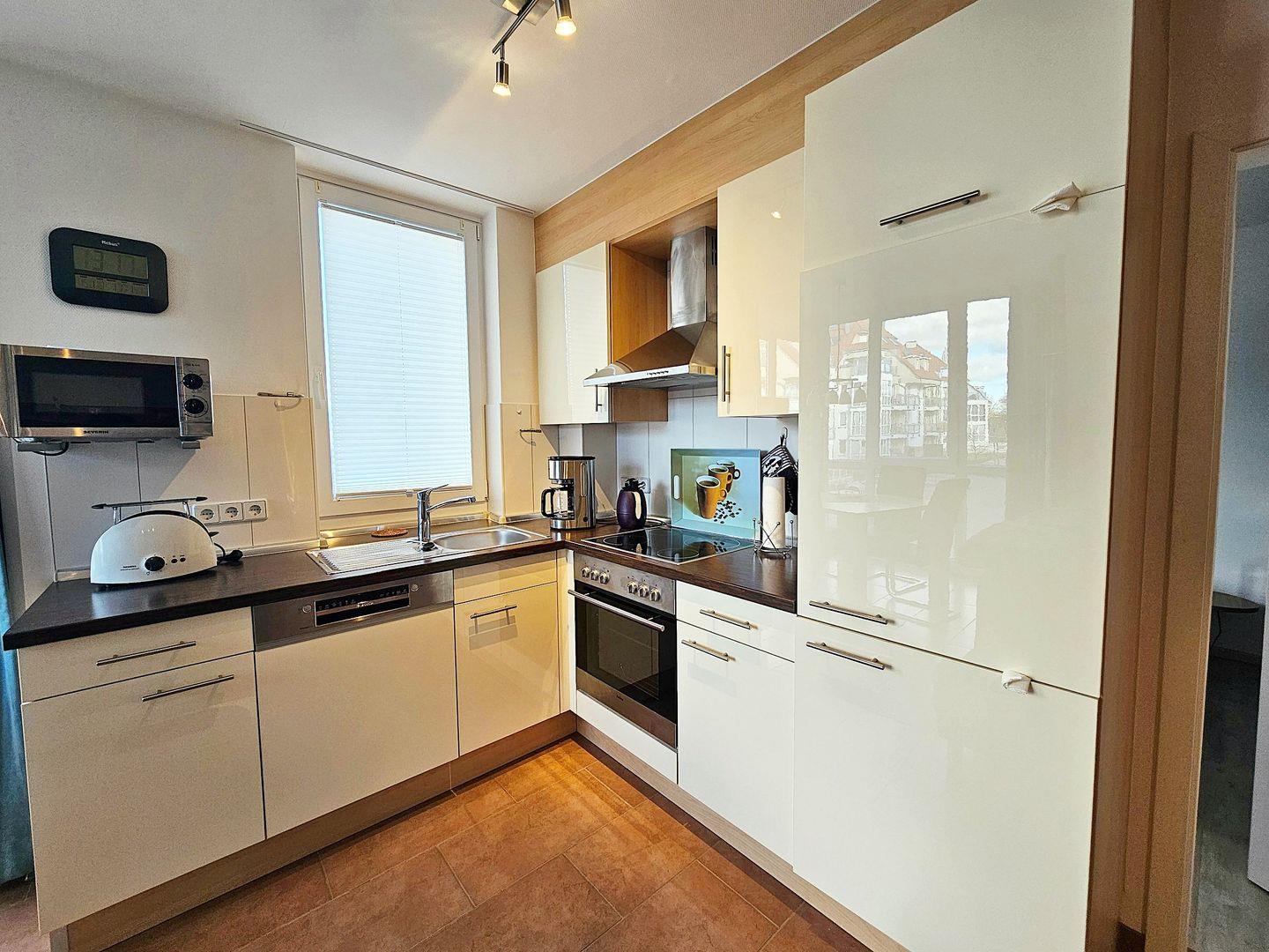 Die zum Wohnzimmer offene Einbauküche wurde umfassend mit großem Kühlschrank, separatem Gefrierschrank, Backofen, 4-Feld-Ceranherd, Microwelle, Geschirrspüler und allen nützlichen Küchenutensilien und Geschirr ausgestattet. Am angrenzenden, hellen Esstisch können Sie die gemeinsamen Mahlzeiten genießen. Von hier können Sie auch ein Stückchen Meer sehen und oftmals auch hören!