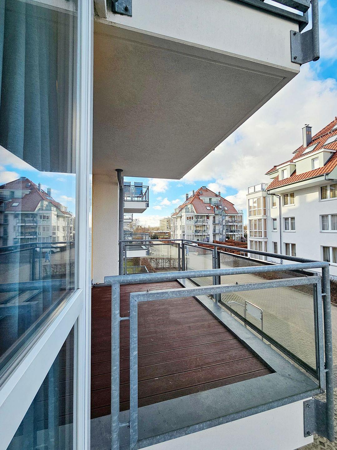 Der möblierte, geräumige und überdachte Balkon bietet eine tolle Location für sonnige, gemeinsame Abendessen und gute Gespräche.