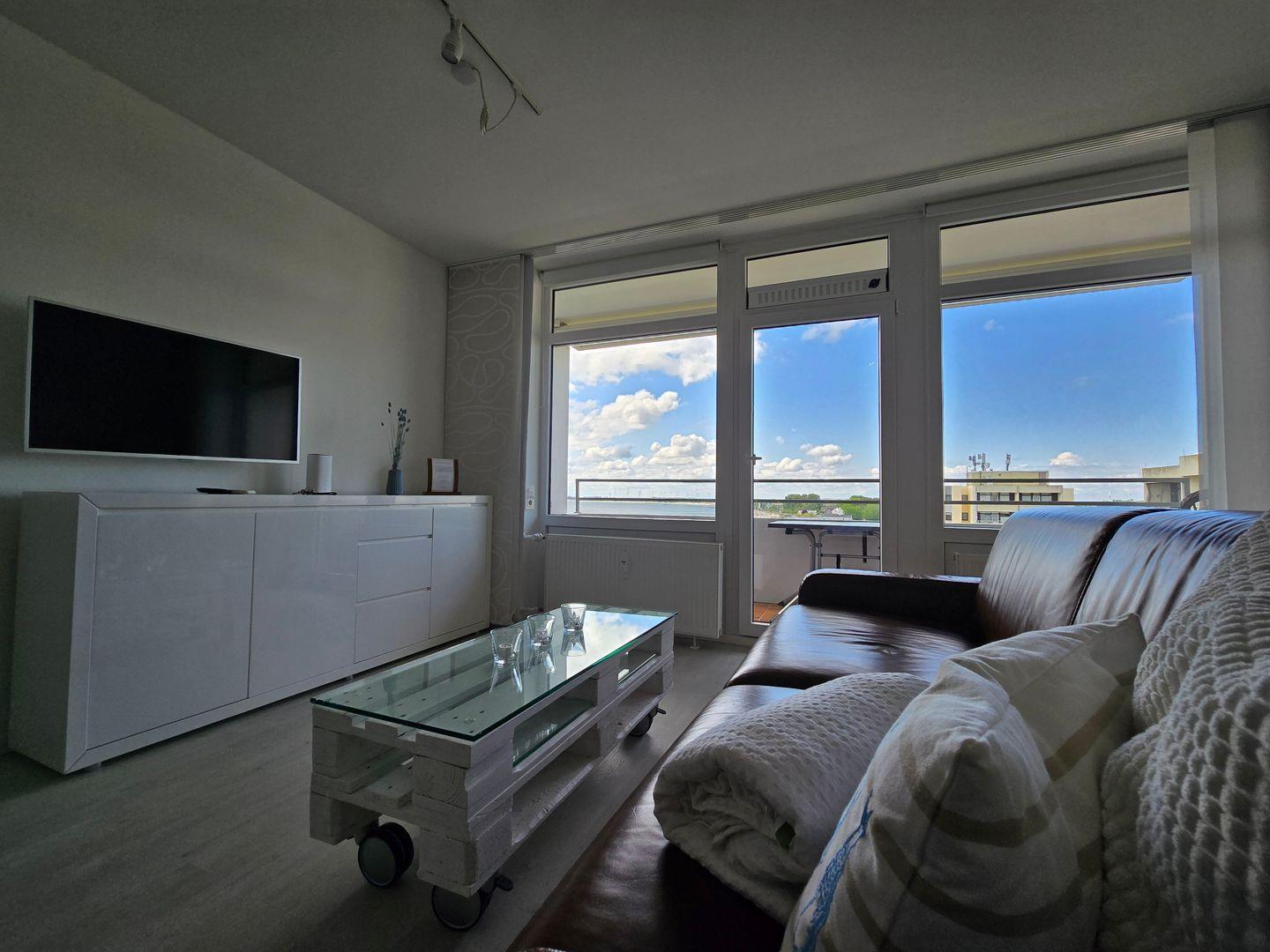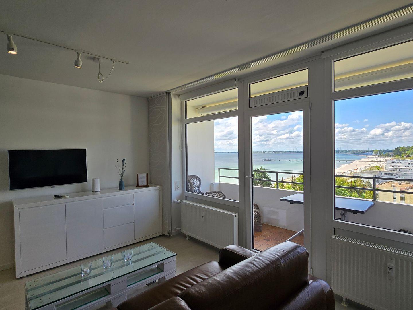 Im Wohnbereich wartet ein gemütliches Sofa mit tollem Blick auf die Ostsee auf Sie. Der große Flachbildfernseher bietet Unterhaltung und wurde oberhalb eines geräumigen Sideboards angebracht. Der runde Essplatz lädt ebenfalls zum Verweilen ein. Hier lassen sich entspannt ihre zubereiteten Mahlzeiten einnehmen.