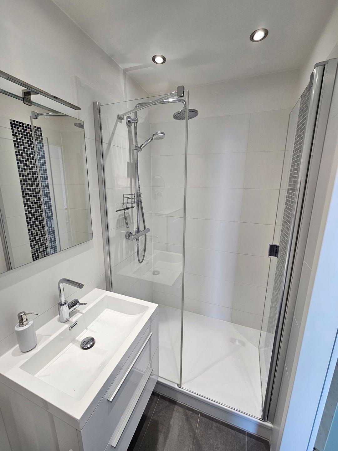 Das neue, hell geflieste Bad verfügt über eine besonders geräumige Dusche mit Glaswänden und flachem Einstieg. Handtuchheizkörper, Steckdosen, ein Waschbeckenunterschrank mit Schubladen sowie ein beleuchteter Spiegel sind weitere Annehmlichkeiten die Ihnen dieses Duschbad im Urlaub bietet.
