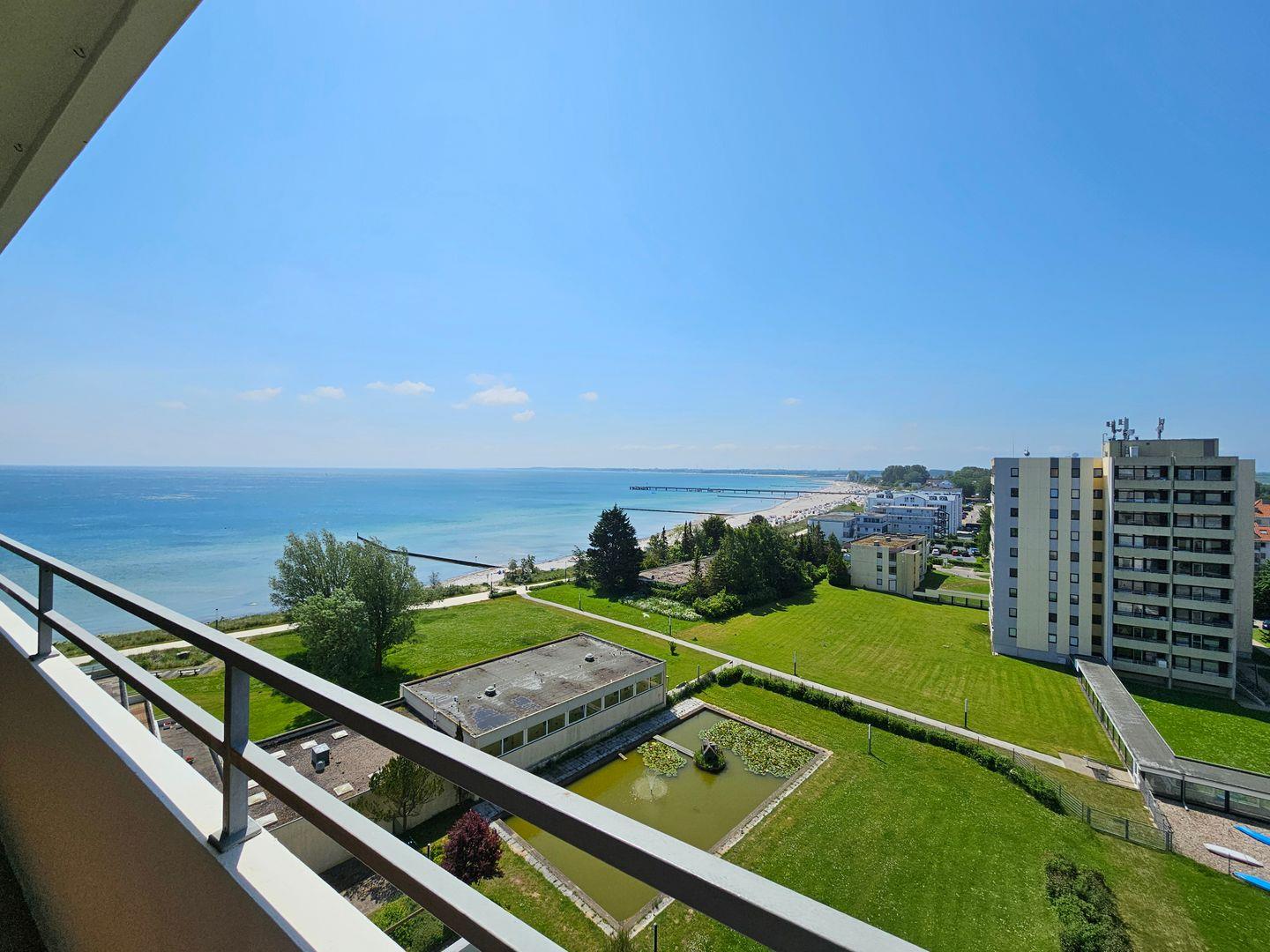 Vom süd-west ausgerichteten möblierten Balkon mit herrlichem Ausblick über den gesamten Südstrand, die Promenade und das Meer genießen Sie die Sonne von mittags bis abends. Eine Markise bietet Ihnen hier einen hervorragenden Sonnenschutz.