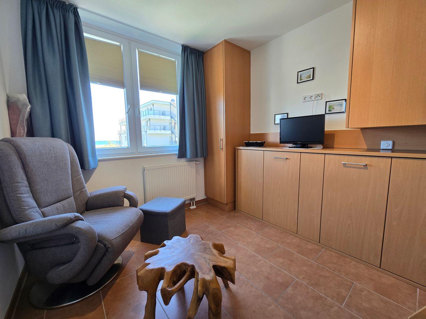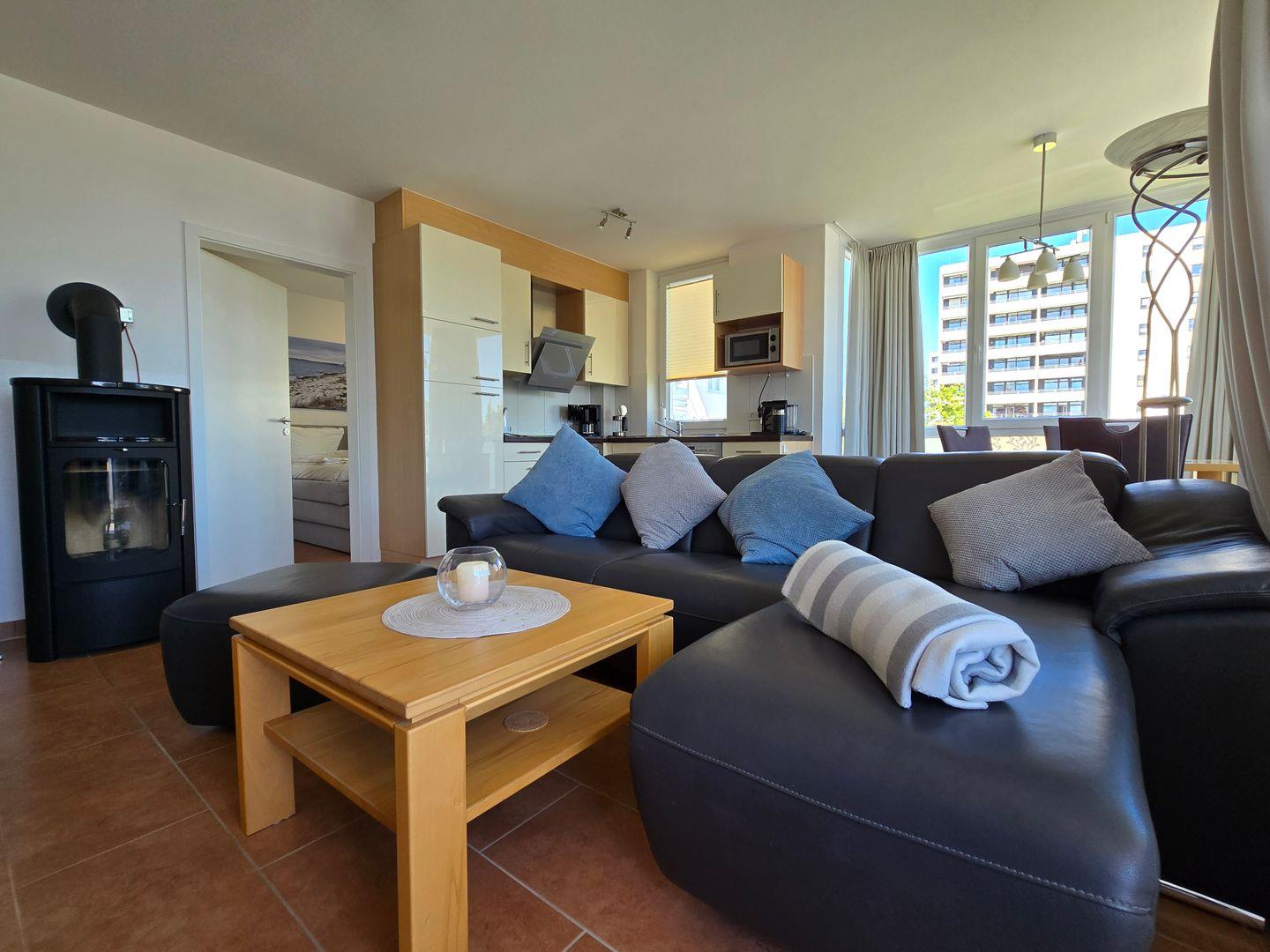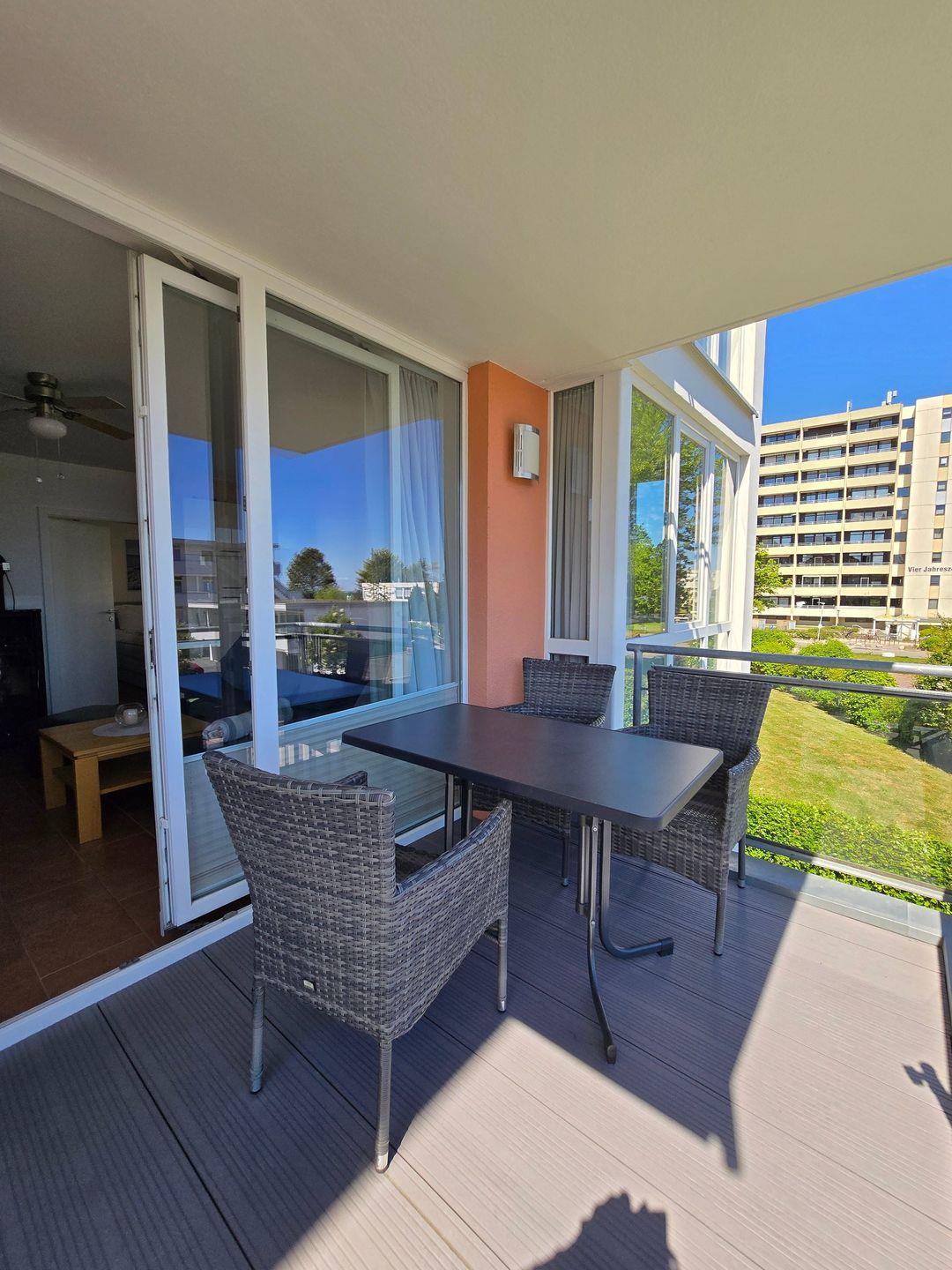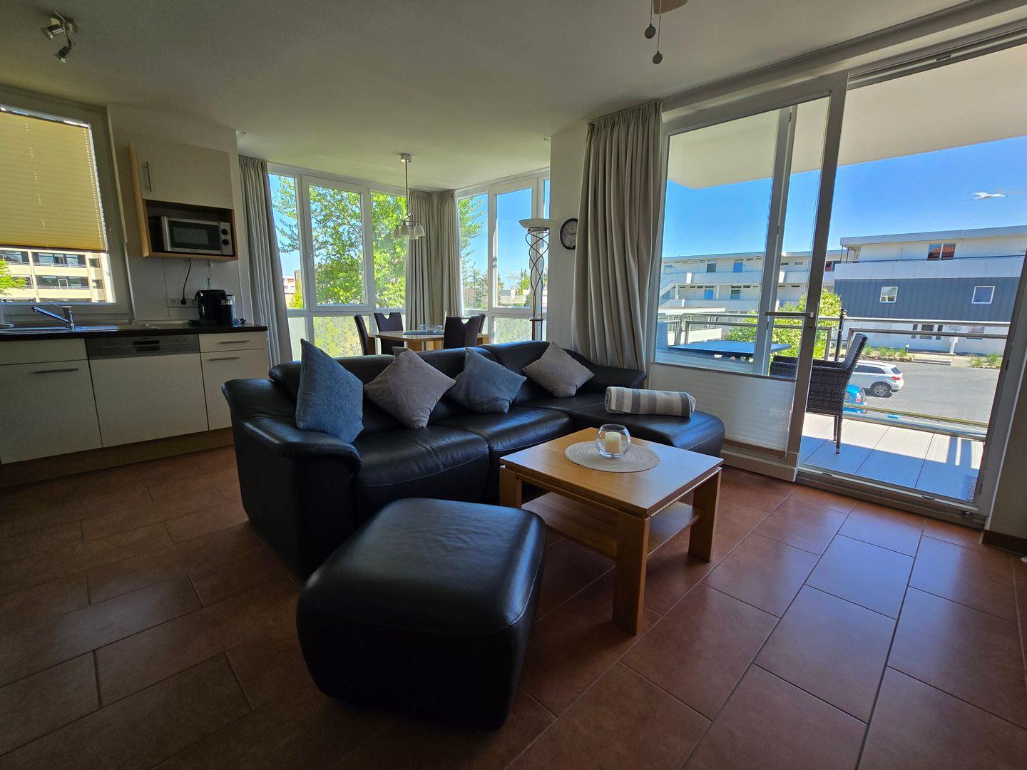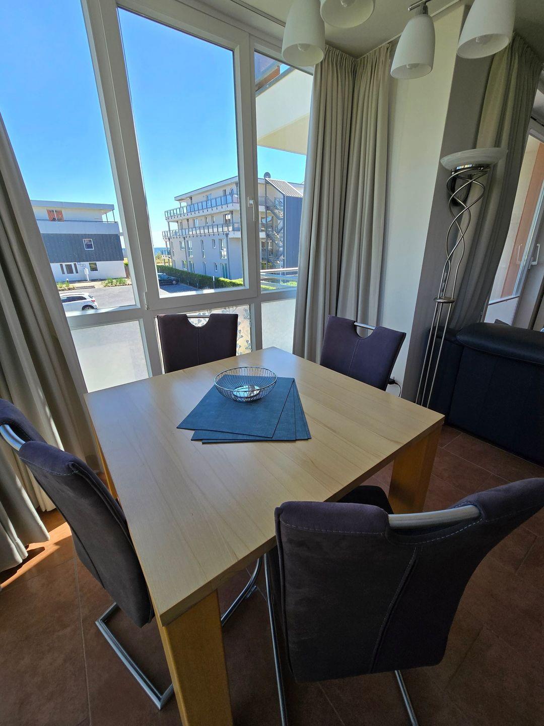 Die Wohnung empfängt Sie im Flur mit einem hellen, offenen Wohn-/Koch- und Essbereich und begeistert mit großzügigen Glasfronten und einem geräumigen Balkon. Vom lichtdurchfluteten Essbereich können Sie den Ostseeblick genießen und ihre Seele baumeln lassen. Für Selbstversorger lässt die vollausgestattete, moderne Einbauküche keine Wünsche übrig.
