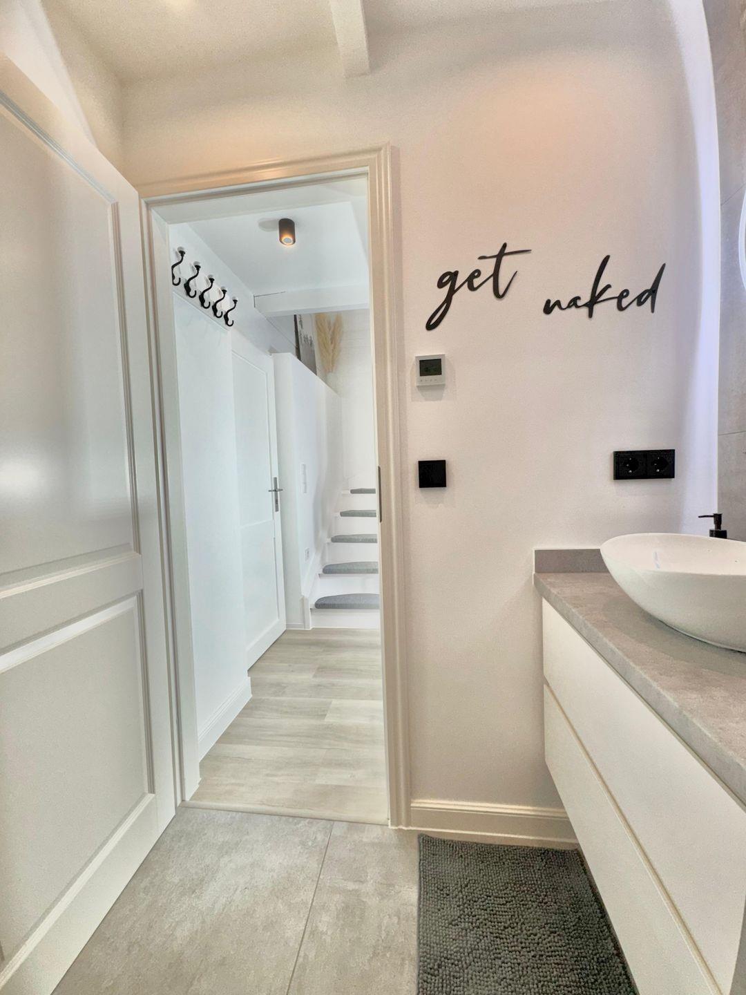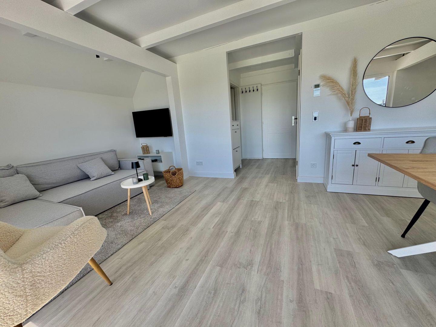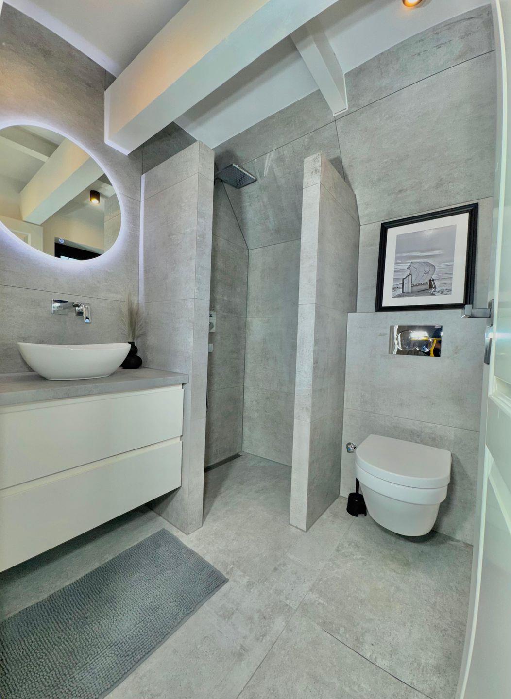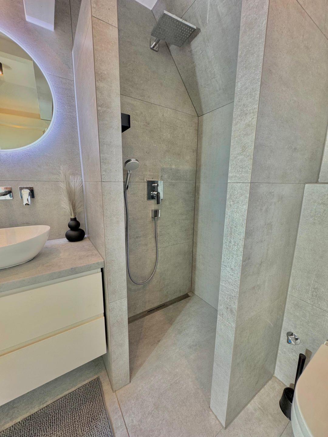 Das Badezimmer verfügt über eine bodengleiche Dusche mit Rainshower, ein Waschbecken und ein WC, alles in einem modernen Stil gehalten. Für eine angenehme Wohlfühlatmosphäre sorgt die Fußbodenheizung. Sie können hier nach einem Tag am Strand entspannen und neue Energie tanken.