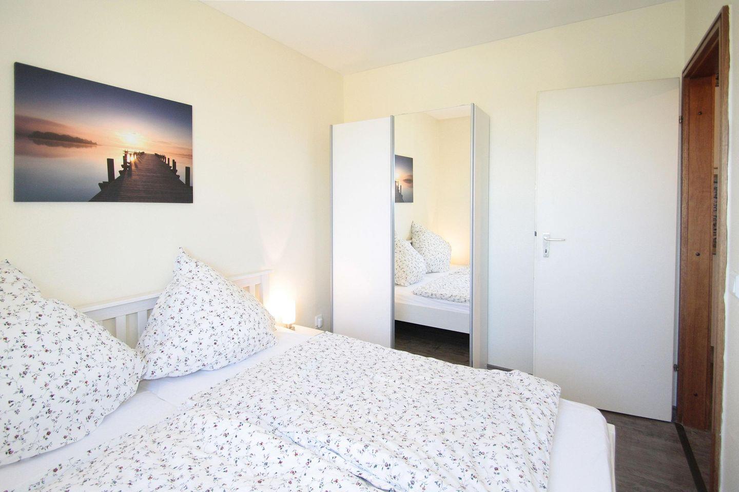 Das Schlafzimmer mit Doppelbett (180*200 cm) verfügt über einen weiteren Fernseher. Hier steht ein Kleiderschrank mit 2 Schiebetüren, eine davon mit großem Spiegel, für Ihre Urlaubsgarderobe bereit.