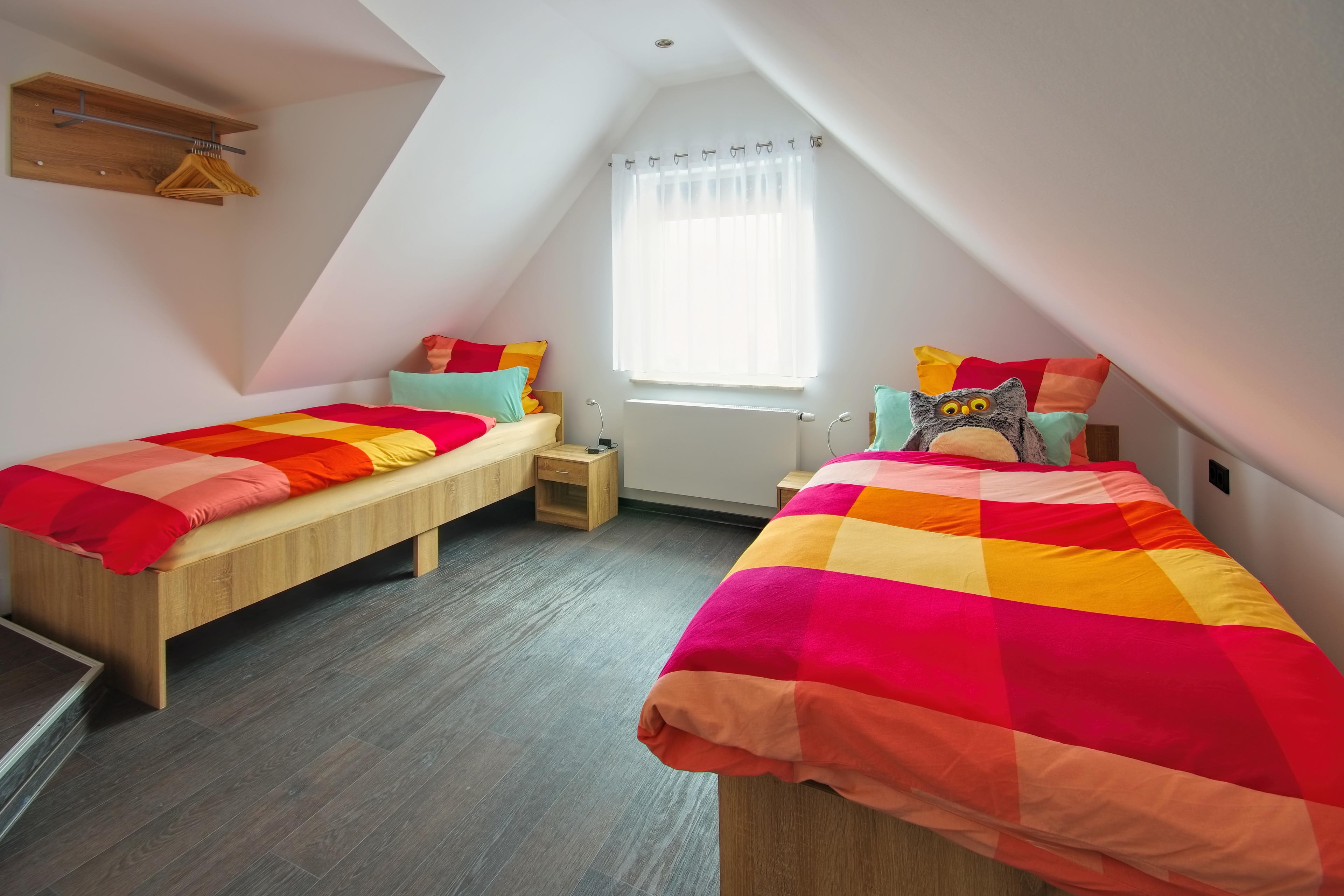 Schlafzimmer 2: Verdunklung durch Innenverdunklungsrollo, Gazefenster, Schrank, 2 Betten je 90 x 200 cm, können zusammengestellt werden