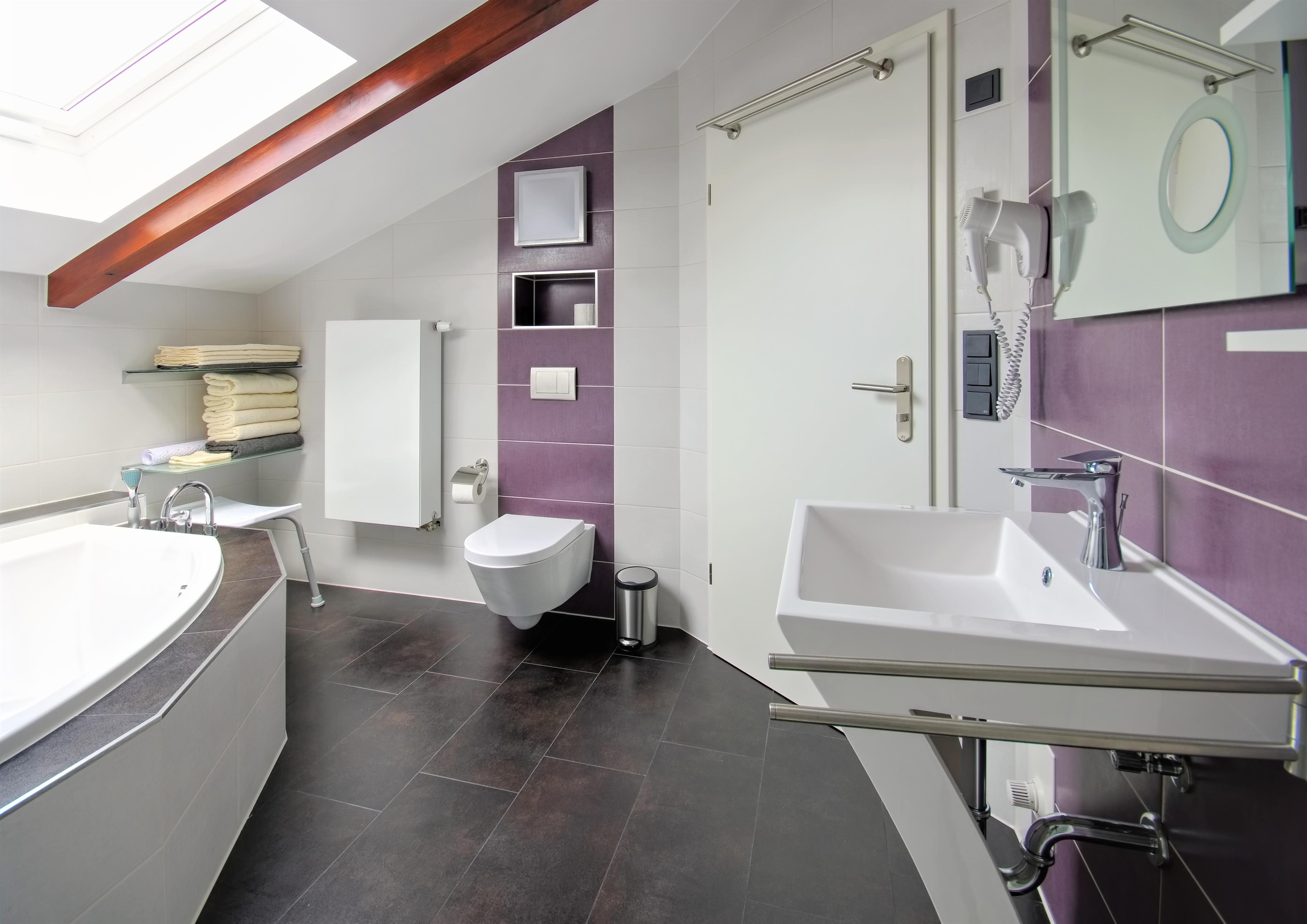 Bad: Dachfenster, Fußbodenheizung, Dusche 120 x 90 cm mit Regendusche, Badewanne für 2 Personen, Haartrockner, Kosmetikspiegel, Duschhocker