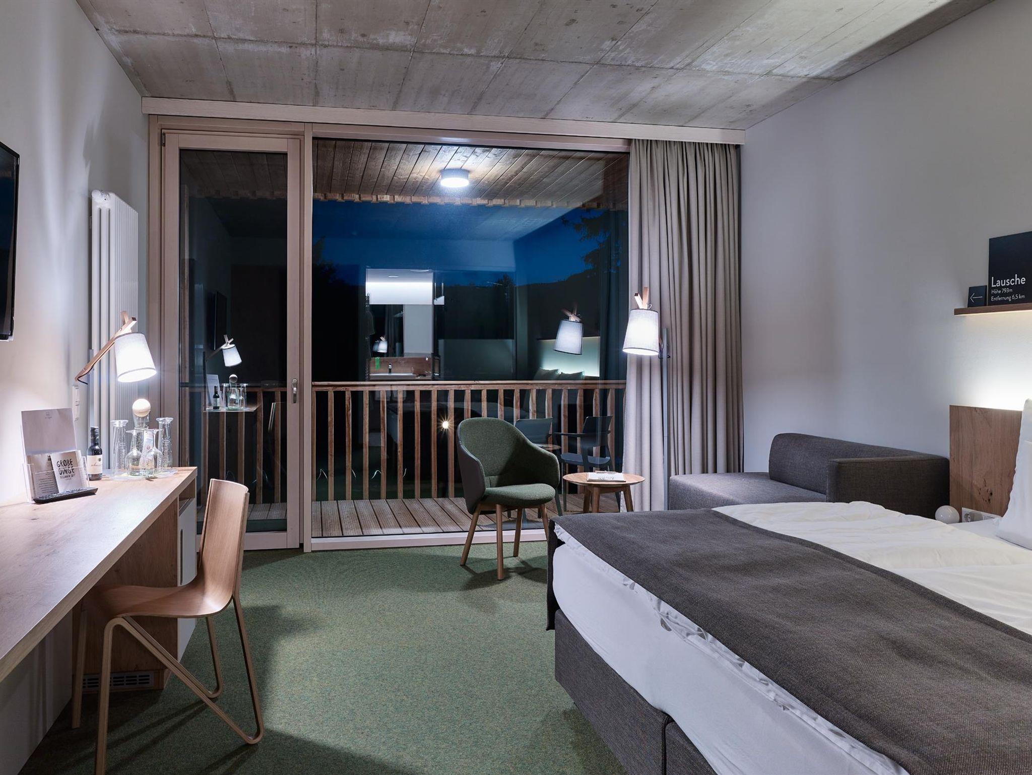 Sie übernachten in großzügigen Doppelzimmern mit Terrasse oder Balkon, Blick auf das Naturfreibad und das Zittauer Gebirge. Das Zimmer bietet Raum zur Erholung mit einem großen Doppelbett, kleiner Sitzecke, Schreibtisch und einem innenliegenden Badezimmer mit moderner Regendusche.