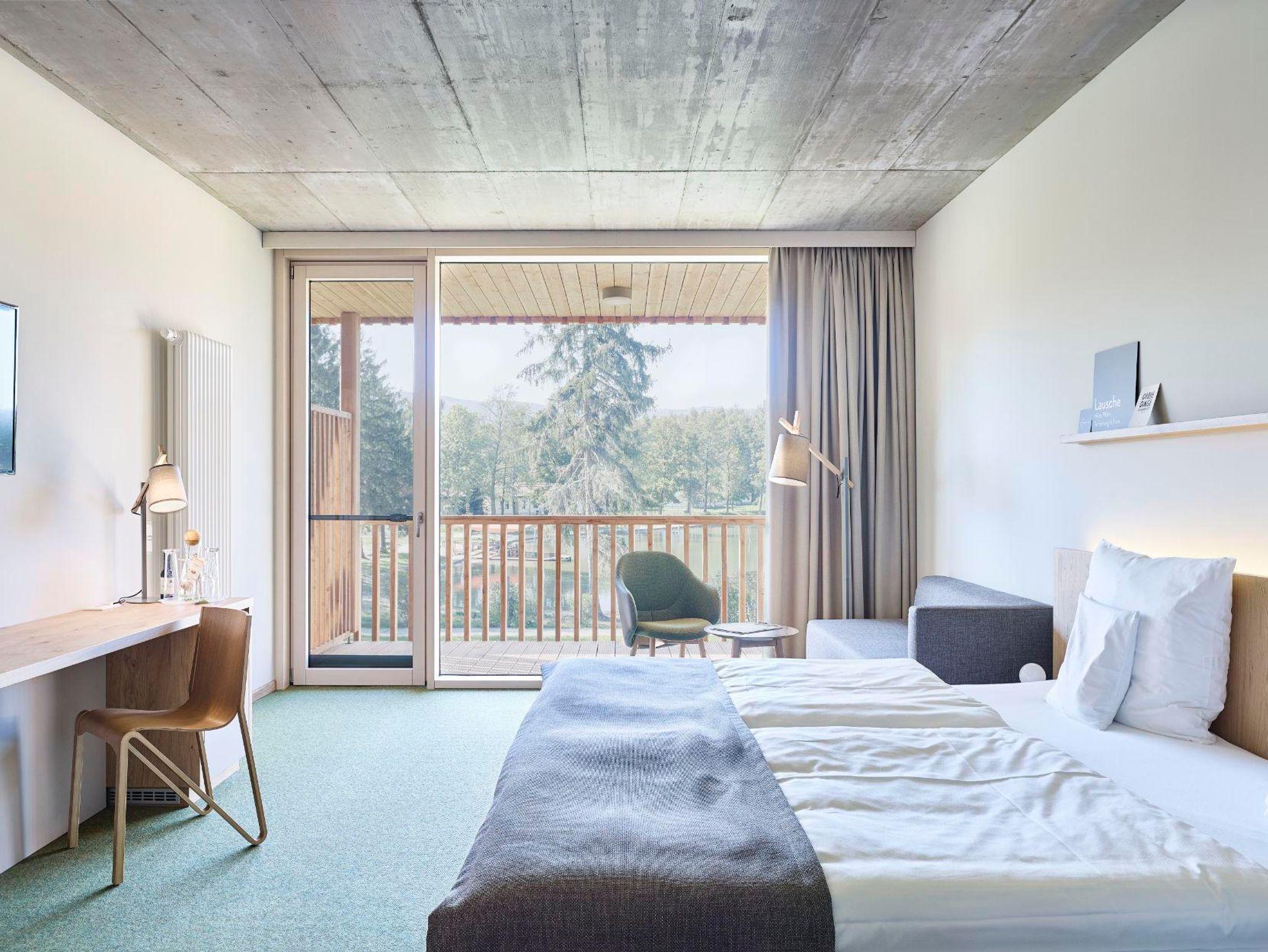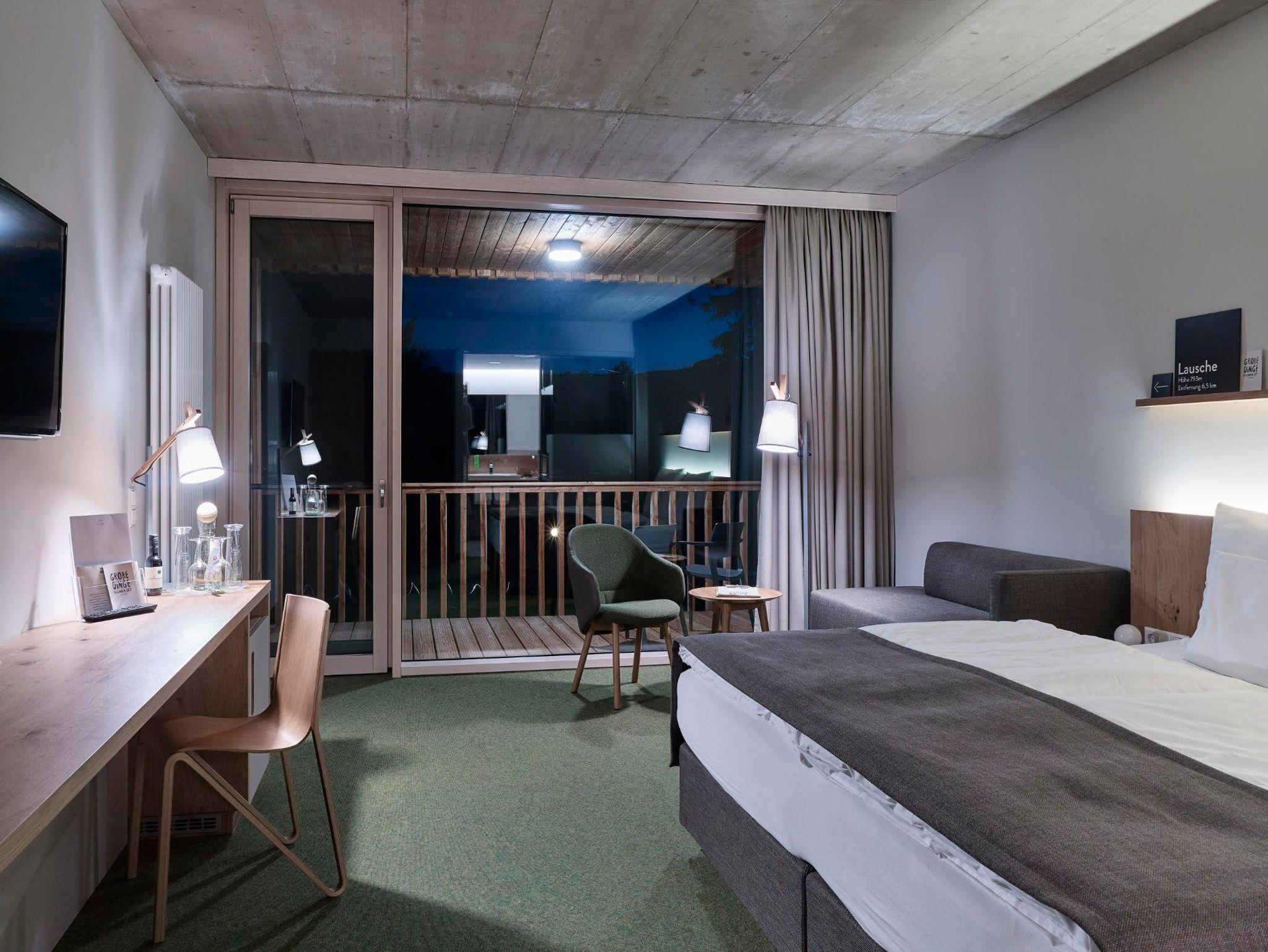 Sie übernachten in großzügigen Doppelzimmern mit Terrasse oder Balkon, Blick auf das Naturfreibad und das Zittauer Gebirge. Das Zimmer bietet Raum zur Erholung mit einem großen Doppelbett, kleiner Sitzecke, Schreibtisch und einem innenliegenden Badezimmer mit moderner Regendusche.