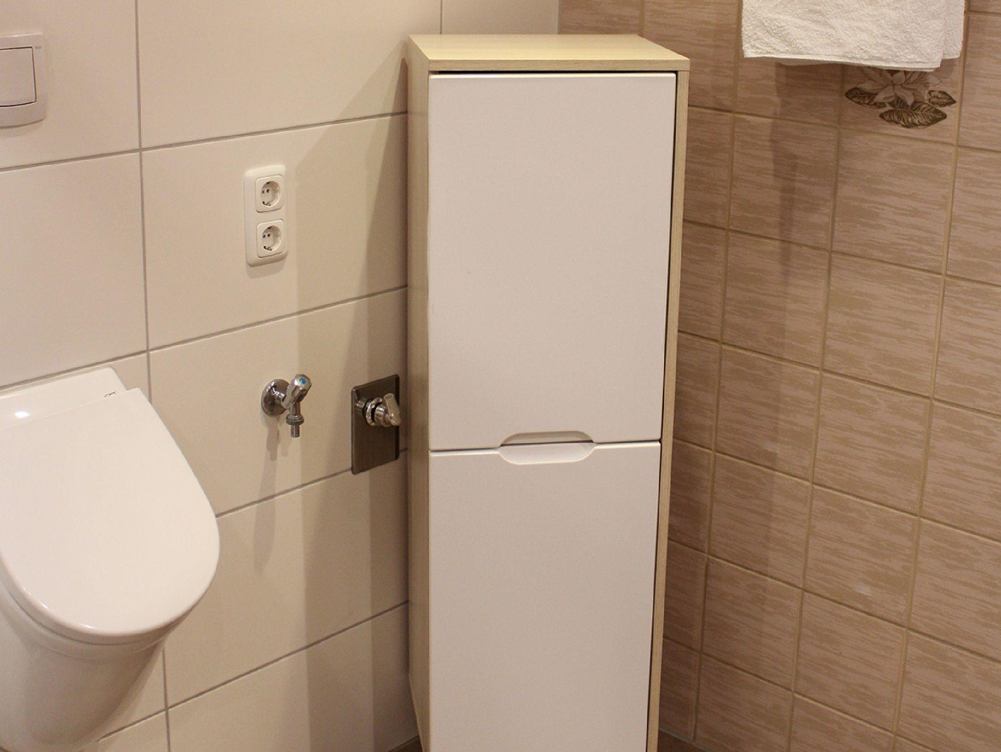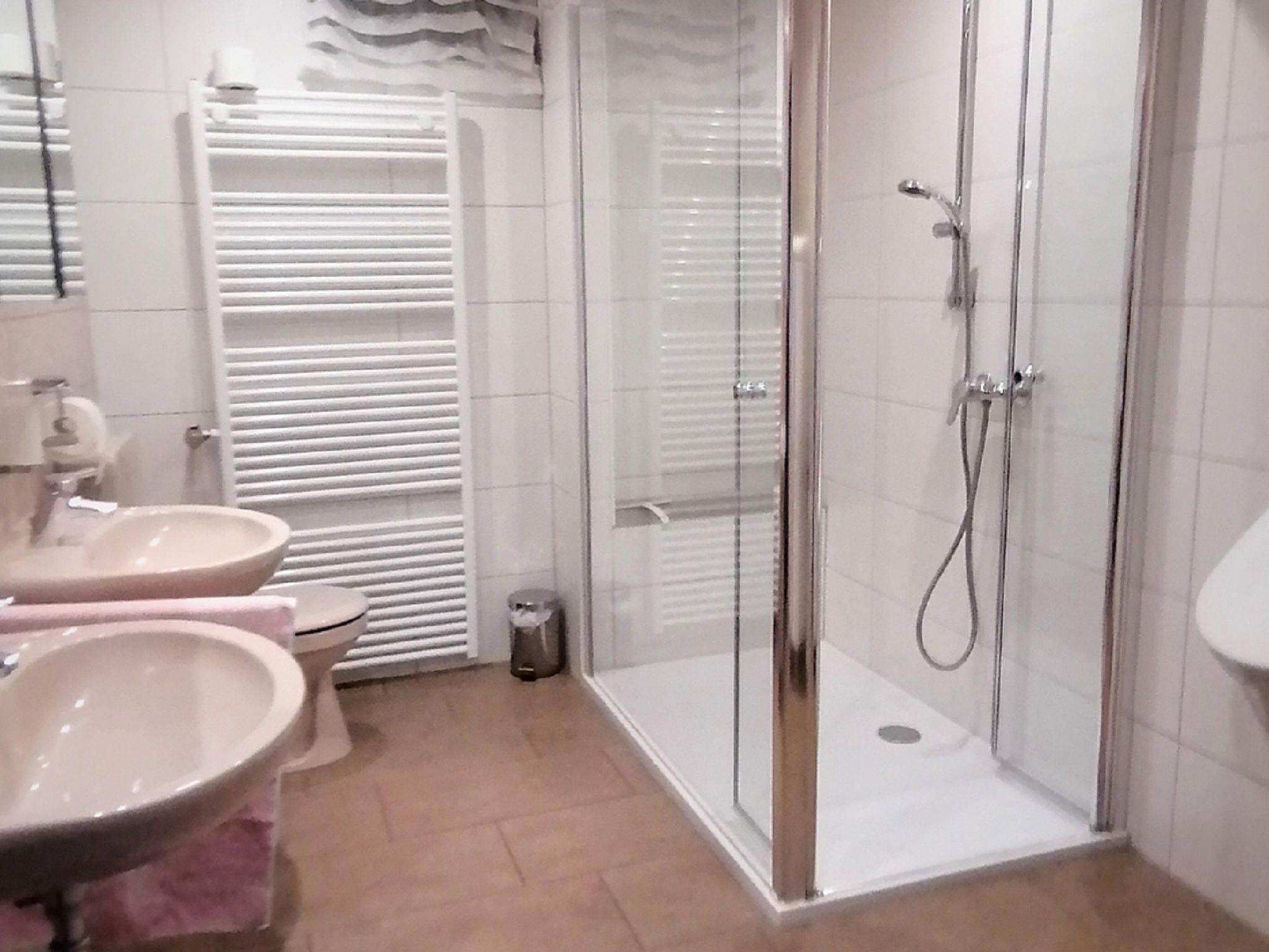 Das geräumige Badezimmer zur alleinigen Nutzung für die Gäste aus Zimmer Nr. 3 befindet sich direkt nebenan. Es ist barrierefrei und ist ausgestattet mit WC, Urinal, Glasdusche und 2 Waschbecken, Handtuchheizkörper, Föhn und Kosmetikspiegel