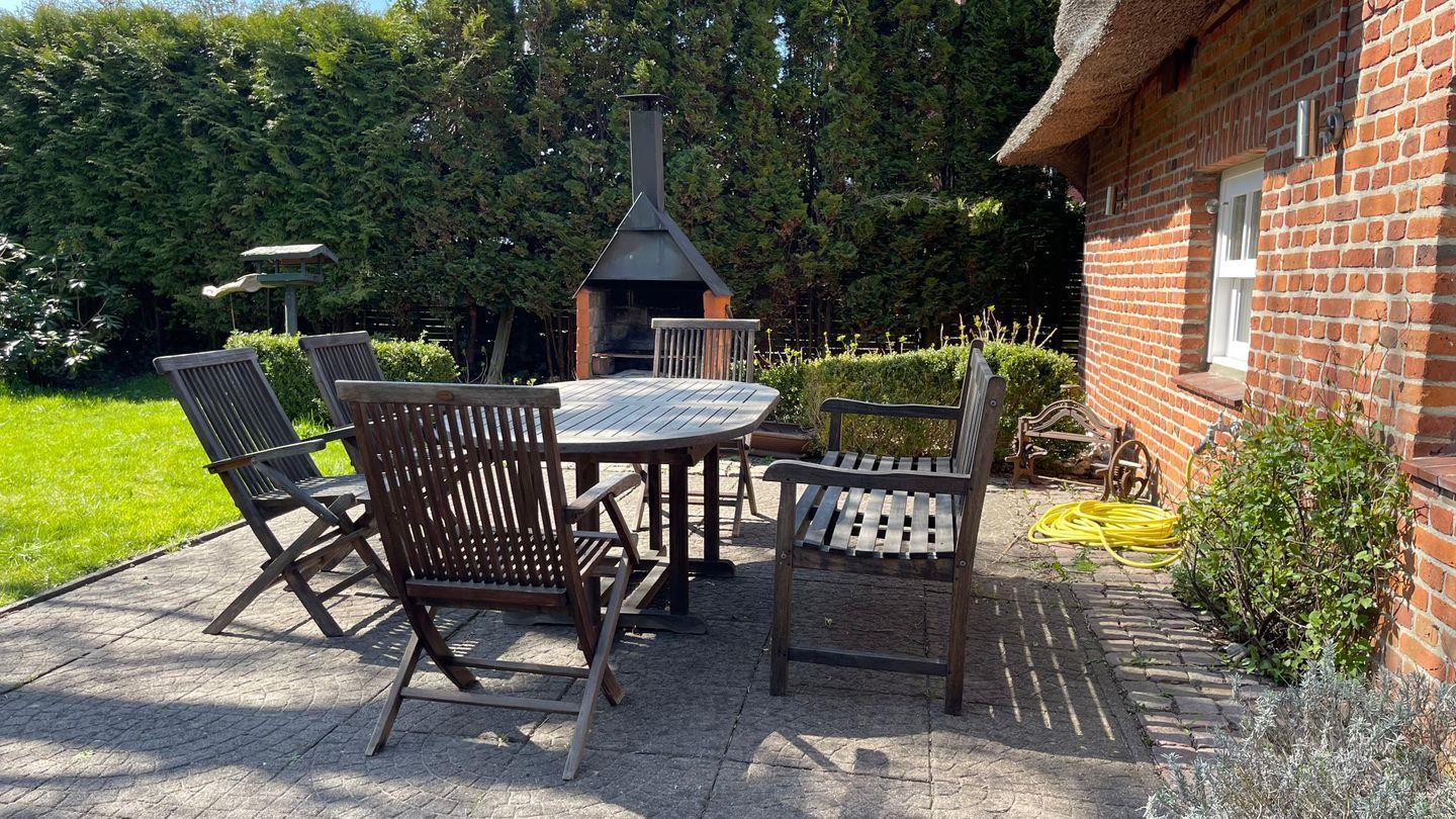 Der großzügige Gartenbereich bietet zu jeder Tageszeit Sitzgelegenheiten auf den 4 Terrassen, um die Sonne zu genießen. Der kleine, idyllische Gartenteich mit einer Wassertiefe von bis zu 50 cm ( nicht eingezäunt) fügt sich harmonisch in das Rasengrundstück ein. Gartenliegen laden zum Verweilen ein. Im reetgedeckten Außengebäude stehen Ihnen zusätzliche, abschließbare Abstellmöglichkeiten für Fahrräder usw. zur Verfügung. Ihre Autos dürfen Sie im Carport sicher unterstellen.