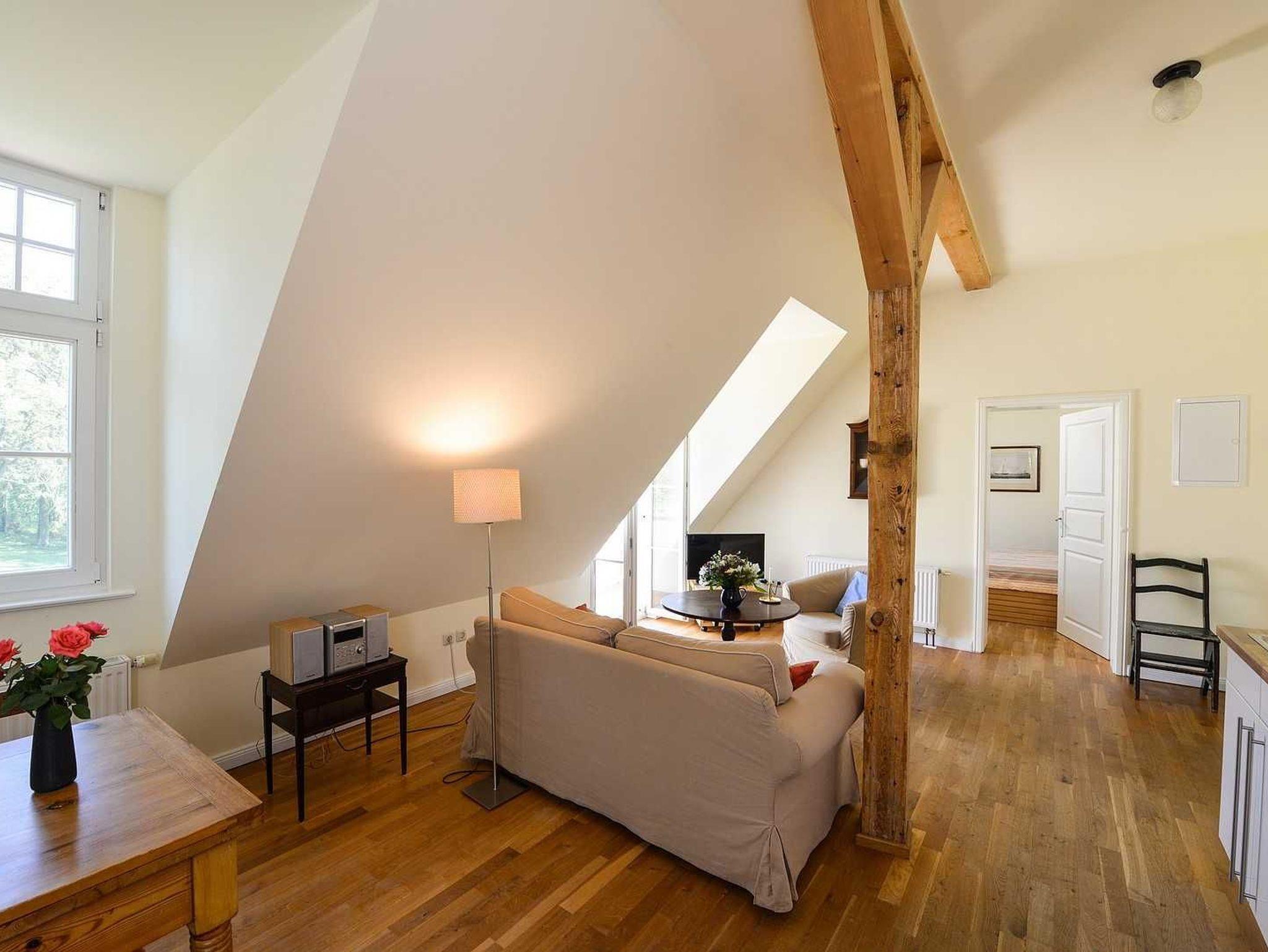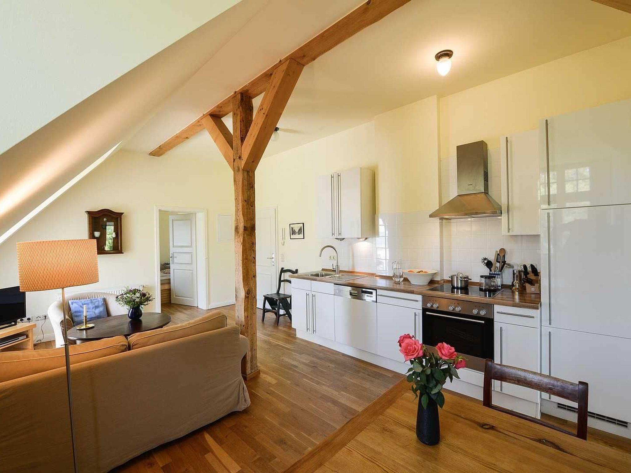 Die Ferienwohnung Nr. 6 befindet sich im zweiten Obergeschoss des Gutshauses. Die Wohnung für bis zu zwei Personen und in einer Größe von 54 m² ist hochwertig eingerichtet und besteht aus zwei Zimmern: Ein großes Wohnzimmer mit offener Küche (hochwertige Siemens-Geräte), ein großzügiges Schlafzimmer mit einem Doppelbett, einem großen Badezimmer mit Badewanne und Dusche. Die Böden der Ferienwohnung bestehen aus Eichen-Parkett. Vom Wohnzimmer und dem Balkon hat man einen sehr schönen Blick auf das Wasser und den Badesteg.