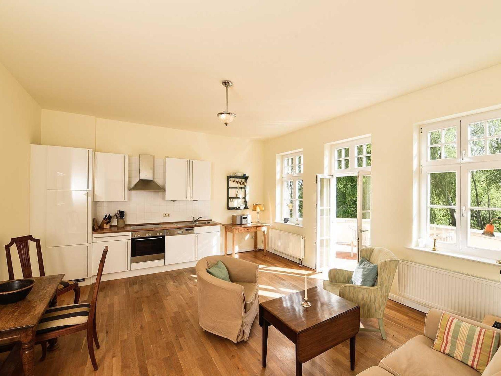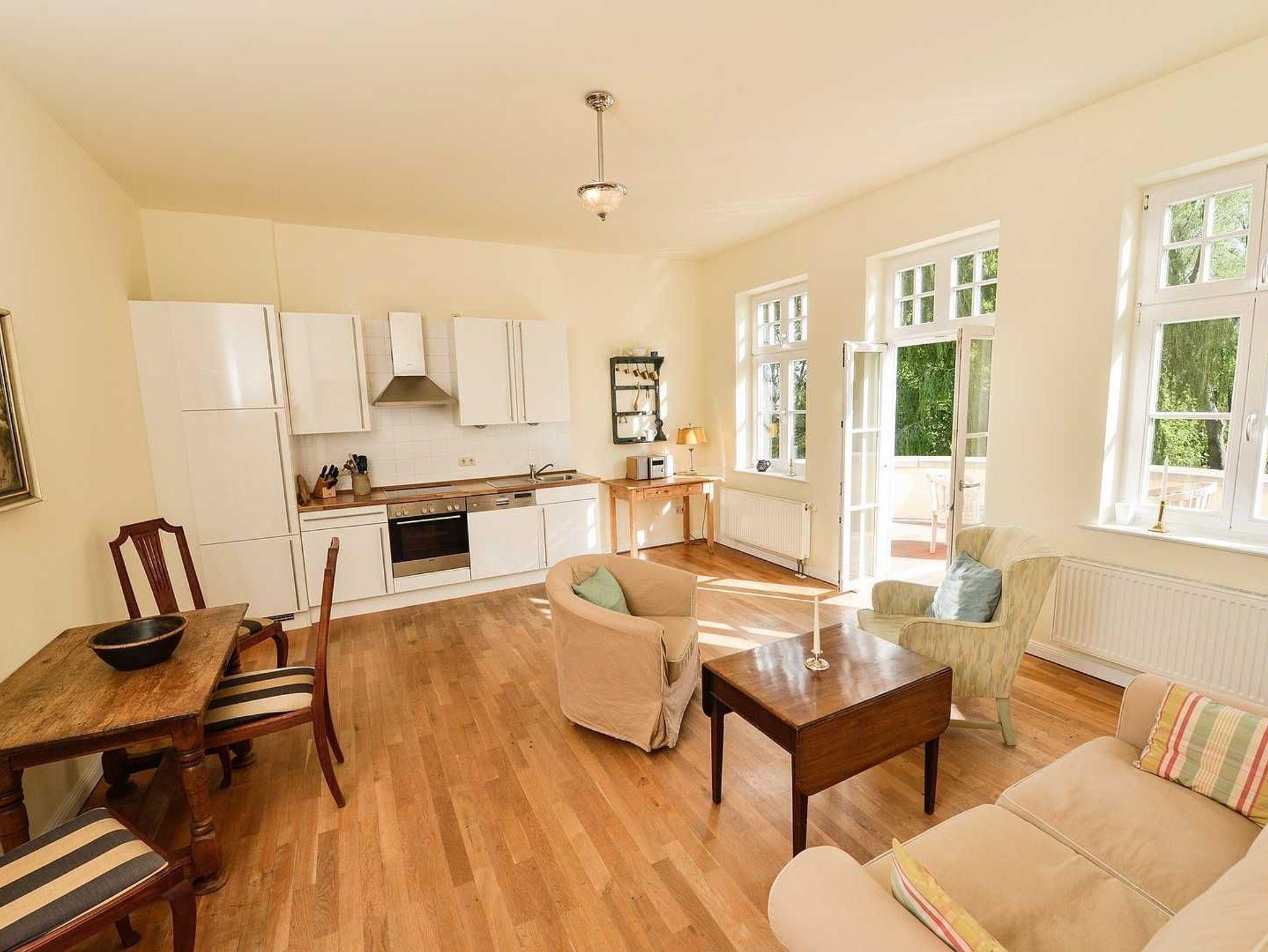 Die Ferienwohnung Nr. 7 befindet sich im zweiten Obergeschoss des Gutshauses. Die Wohnung für bis zu zwei Personen und in einer Größe von 57 m² ist gemütlich und mit Liebe zum Detail eingerichtet und besteht aus zwei Zimmern: Ein großes Wohnzimmer mit offener Küche (Siemens-Geräte), ein großzügiges Schlafzimmer mit einem Doppelbett, einem großen Badezimmer mit Badewanne. Die Böden der Ferienwohnung bestehen aus Eichen-Parkett. Vom Wohnzimmer hat man einen sehr schönen Blick auf das Wasser und den Badesteg.