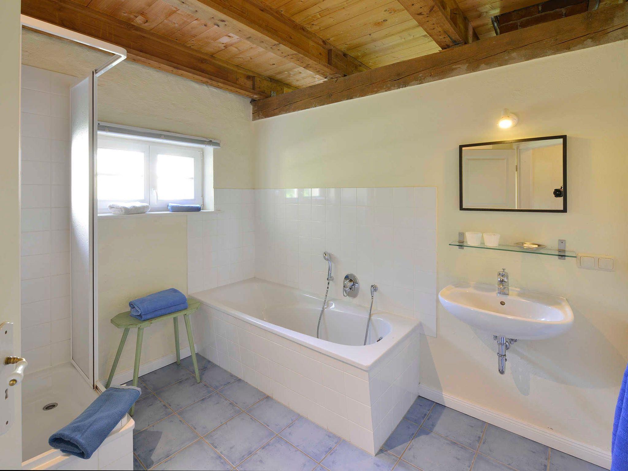Das frei stehende Ferienhaus Remise befindet sich neben dem Gutshaus und erstreckt sich über zwei Etagen, wobei das Obergeschoss über eine Holztreppe zu erreichen ist. Die Remise für bis zu sechs Personen und in einer Größe von 72 m² ist gemütlich und mit Liebe zum Detail eingerichtet und besteht aus vier Zimmern: Im Erdgeschoss ein großes Wohnzimmer mit offener Küche (Siemens-Geräte) und schönem Blick auf den Garten und das Wasser, ein Schlafzimmer mit zwei Einzelbetten und zwei Schlafzimmer mit einem Doppelbett, die drei Schlafzimmer alle im Obergeschoss. Die Remise hat ein Badezimmer mit Badewanne und Dusche sowie ein separates WC. Die Böden sind aus Eichenholz-Parkett. Im Wohnzimmer befindet sich ein Kaminofen.