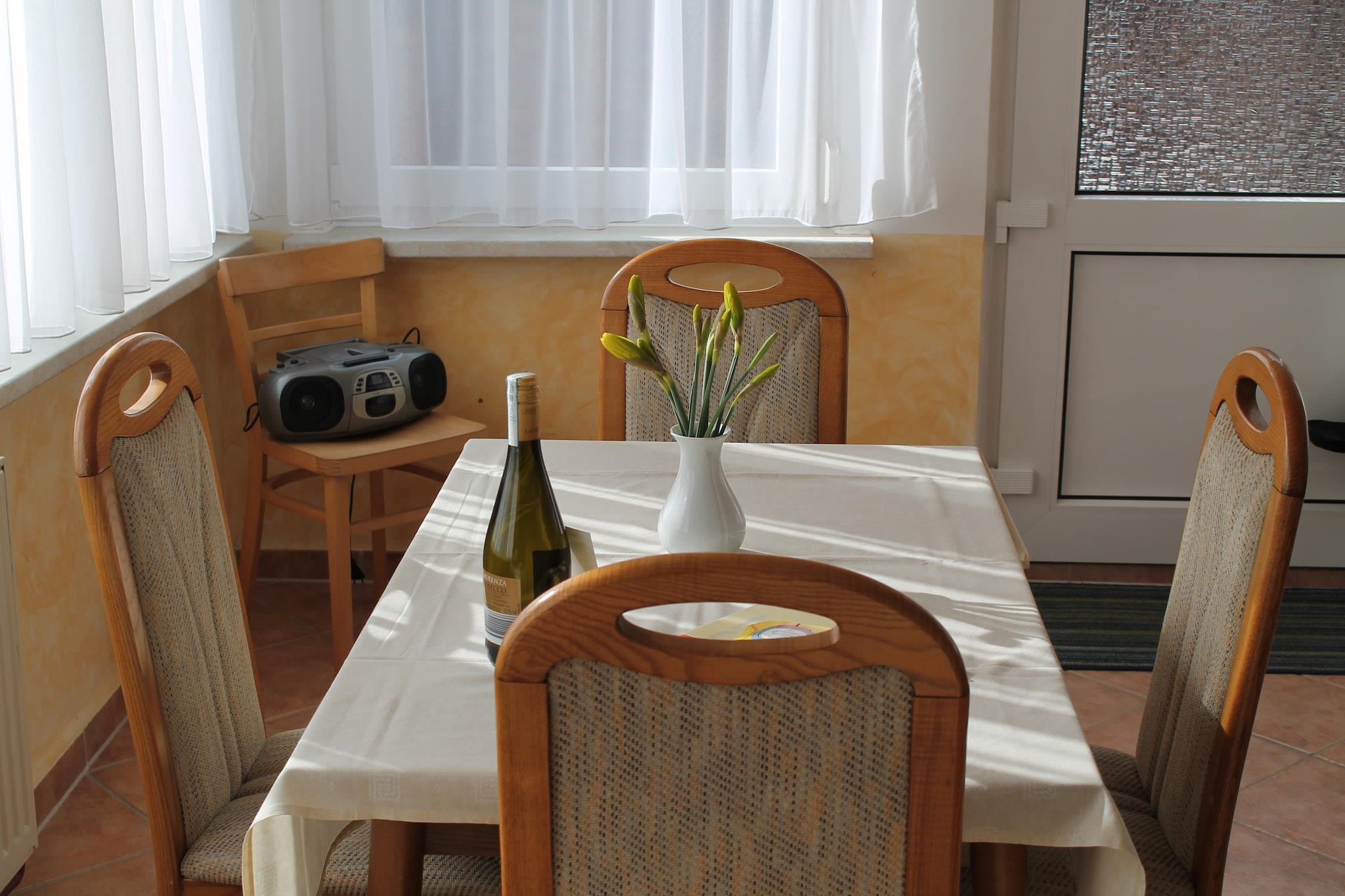 Parterre: (Wohnzimmer(TV(Satellit), Sitzecke, Radio), offene Küche(Esstisch(4 Personen), Wasserkocher, Toaster, Kochherd(4 Kochplatten), Dunstabzugshaube, Kaffeemaschine, Backofen, Mikrowelle, Kühlschrank), Schlafzimmer(Doppelbett), Schlafzimmer(Einzelbett, Einzelunterschiebebett, Etagenbett), Badezimmer(Dusche, Waschbecken, Toilette), Heizung, Kinderbett, Hochstuhl) Terrasse(überdacht), Garten, Gartenmöbel, Grill, Parkplatz