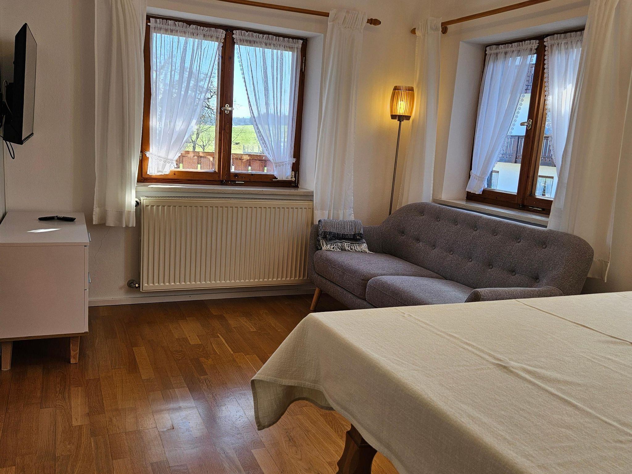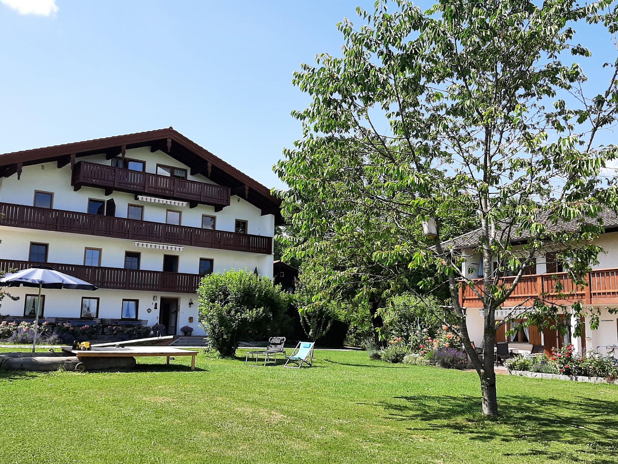 Die gemütliche Ferienwohnung liegt im 1. OG des Nebenhauses, sie misst 45qm und ist über eine Außentreppe zu erreichen. Sie verfügt über 1 Schlafzimmer mit Doppelbett, eine sehr gut ausgestattete Küche, ein Wohnzimmer mit Sat-TV und Essbereich, sowie über ein Bad mit Dusche und WC. Die Ferienwohnung ist außerdem mit W-Lan, Spülmaschine, Kaffeemaschine, Wasserkocher, Toaster, 4-Plattenherd, Dunstabzug, Backofen, Kühlschrank mit Gefrierfach und CD-Player ausgestattet. Allergikerbetten sind verfügbar. Vom großen möblierten Süd-OSt-Balkon haben Sie einen herrlichen Blick in die Chiemgauer Alpen und in den großen Garten. Bitte beachten Sie: Die Wohnung ist nur für 2 Personen ein Kinderbett oder ähnliches ist nicht möglich.