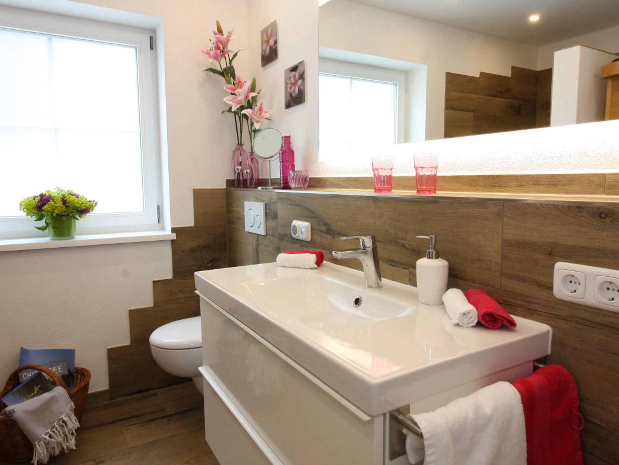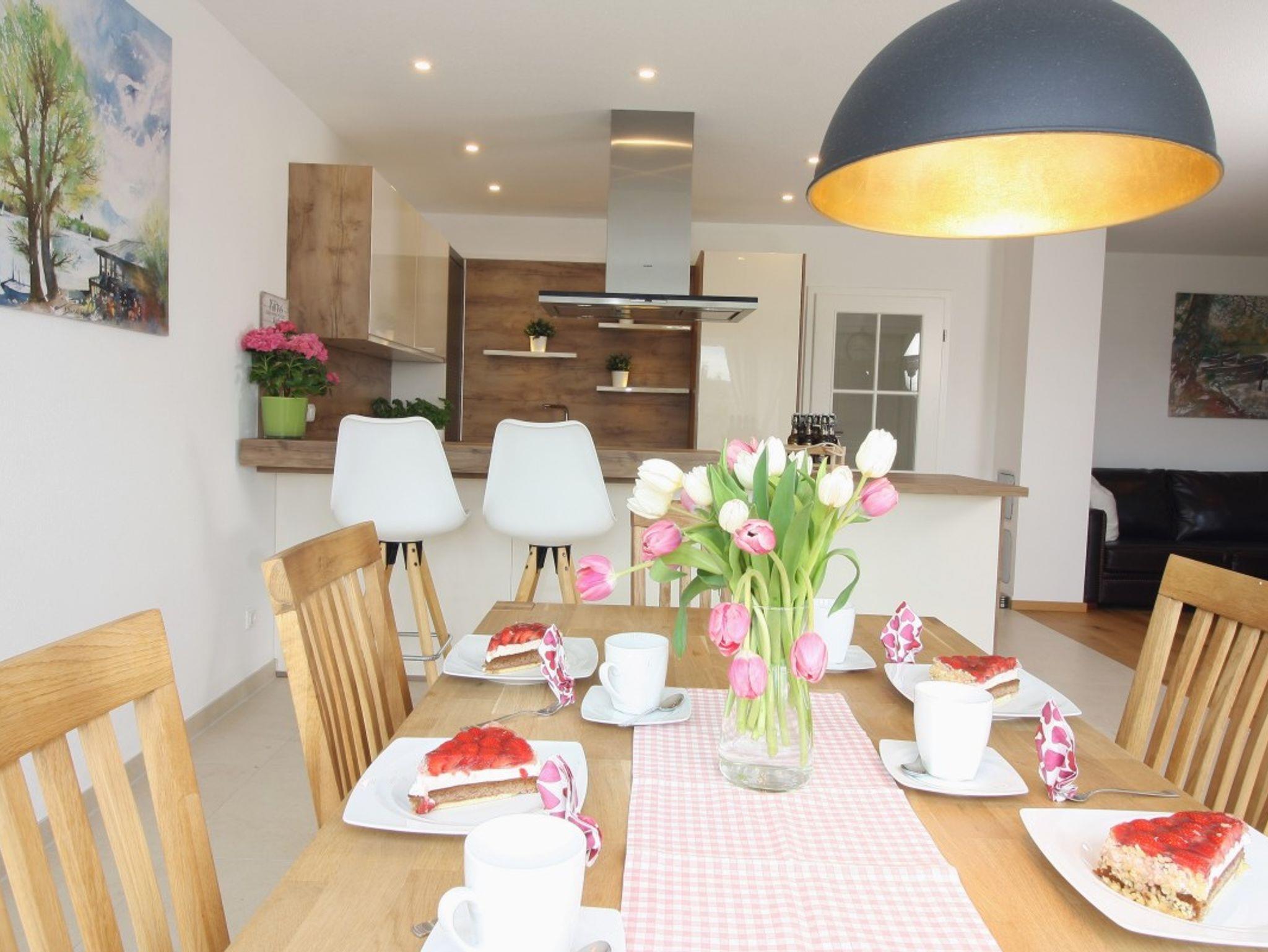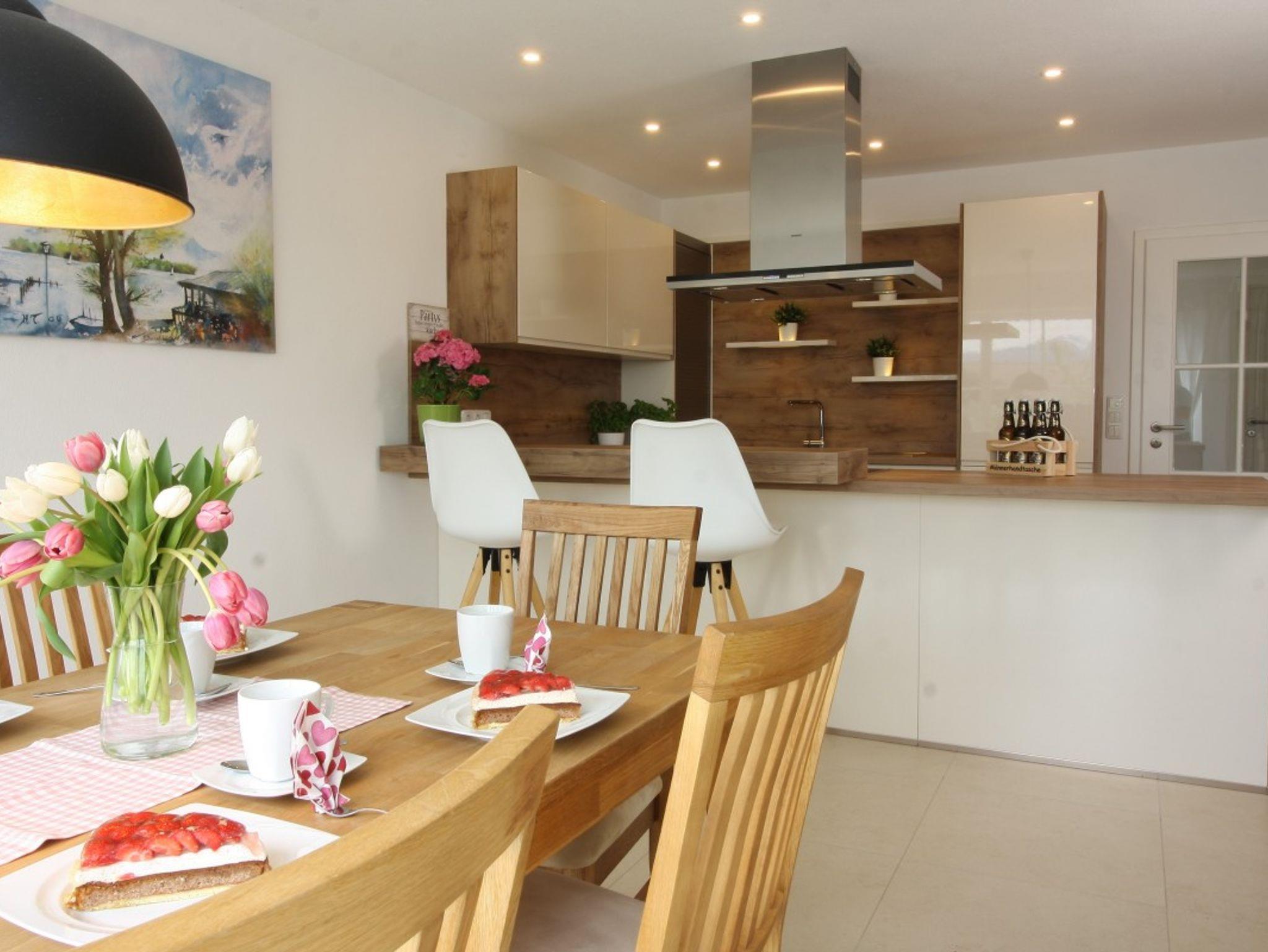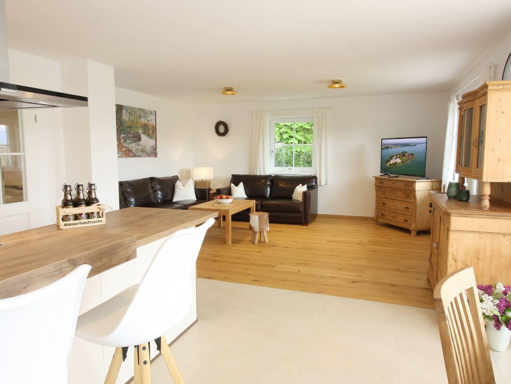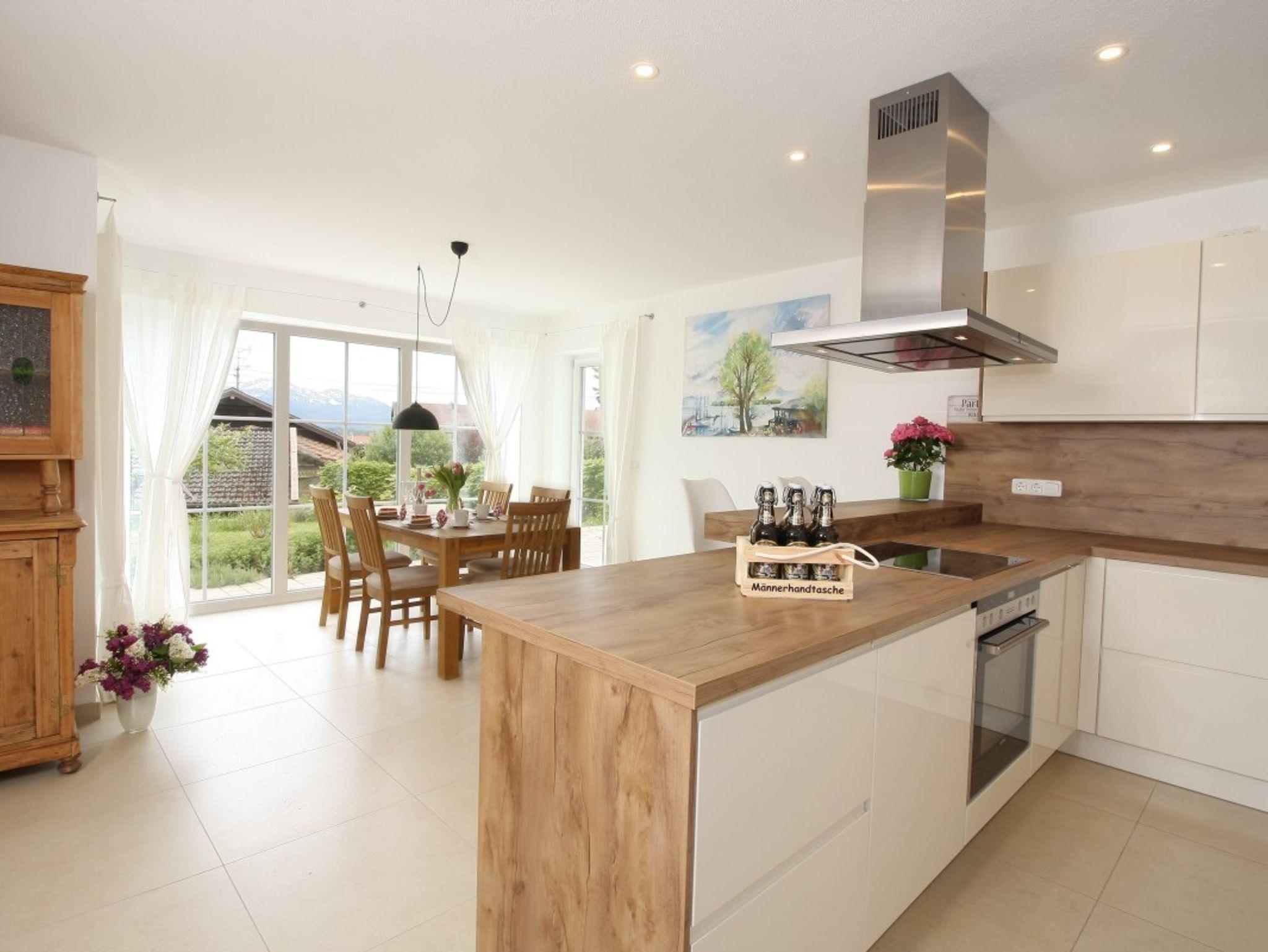 Die neu gebaute Ferienwohnung mit 130 qm bietet jeglichen Komfort. Ein großzügiger Wohnraum mit offener Küche die mit Spülmaschine, Induktion-Backofen, Kühlgefrierschrank, Kaffemaschine, Wasserkocher, Toaster, Kaffeepad Maschine ausgestattet ist. Ein großer Esstisch mit 5 Stühlen, ein gemütliches Ledersofa mit genügend Platz um Abends mal fernsehen zu können (natürlich in HD Qualität). Die Terrasse lädt zum draußen sitzen ein; von dort aus haben Sie einen wunderschönen Blick auf den See. Die beiden Schlafzimmer sind modern und pfiffig eingerichtet, in einem der beiden steht ein zweiter Fernseher. In den Bädern ist für Sie ein Föhn, eine Infrarot Wärmekabine und ein Radio vorhanden. Waschmaschine/Trocker sind im separaten Raum für alle Gäste des Hauses Chiemsee Blick zugänglich.
