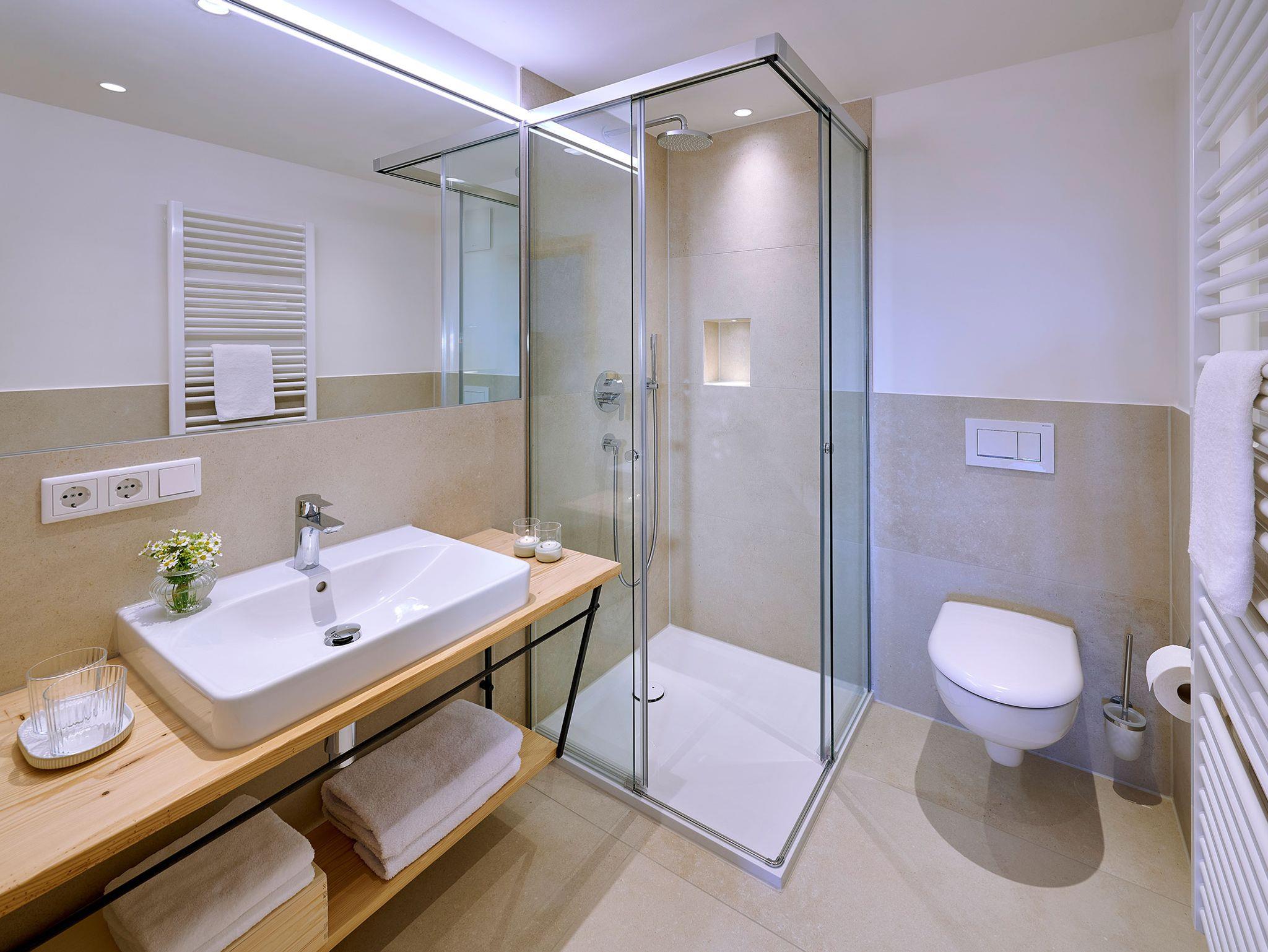 • 1 Badezimmer mit Regendusche, WC, Waschtisch, Föhn, beheizbarem Handtuchtrockner, Badradio, Pflegeprodukten und Schminkspiegel