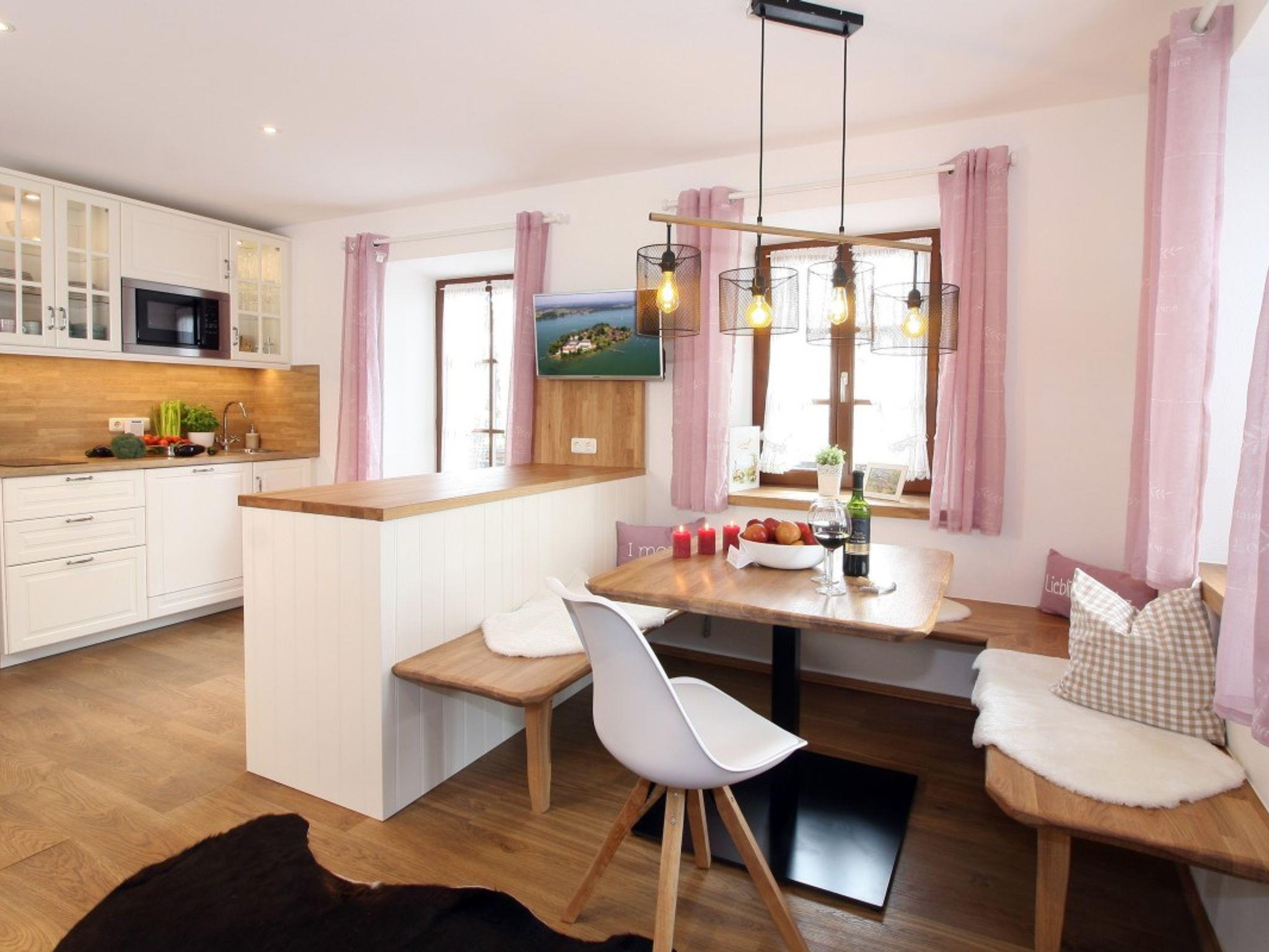 Die geräumige Ferienwohnung befindet sich im 1. OG, ist im gemütlichen Landhausstil hochwertig eingerichtet und hat einen eigenen Zugang zum Balkon mit herrlichem Blick auf Ufer, See und Berge.