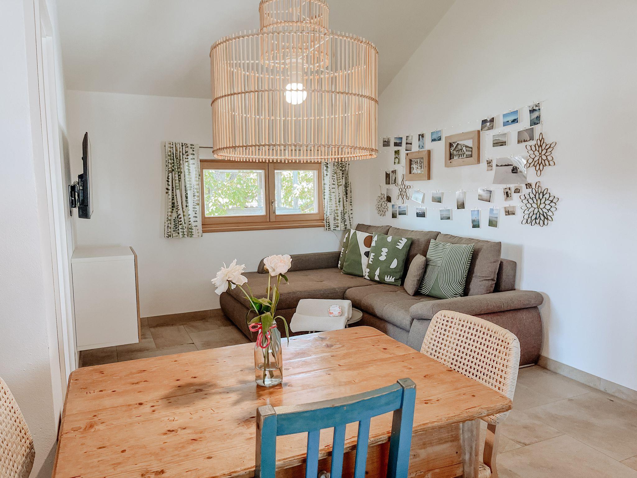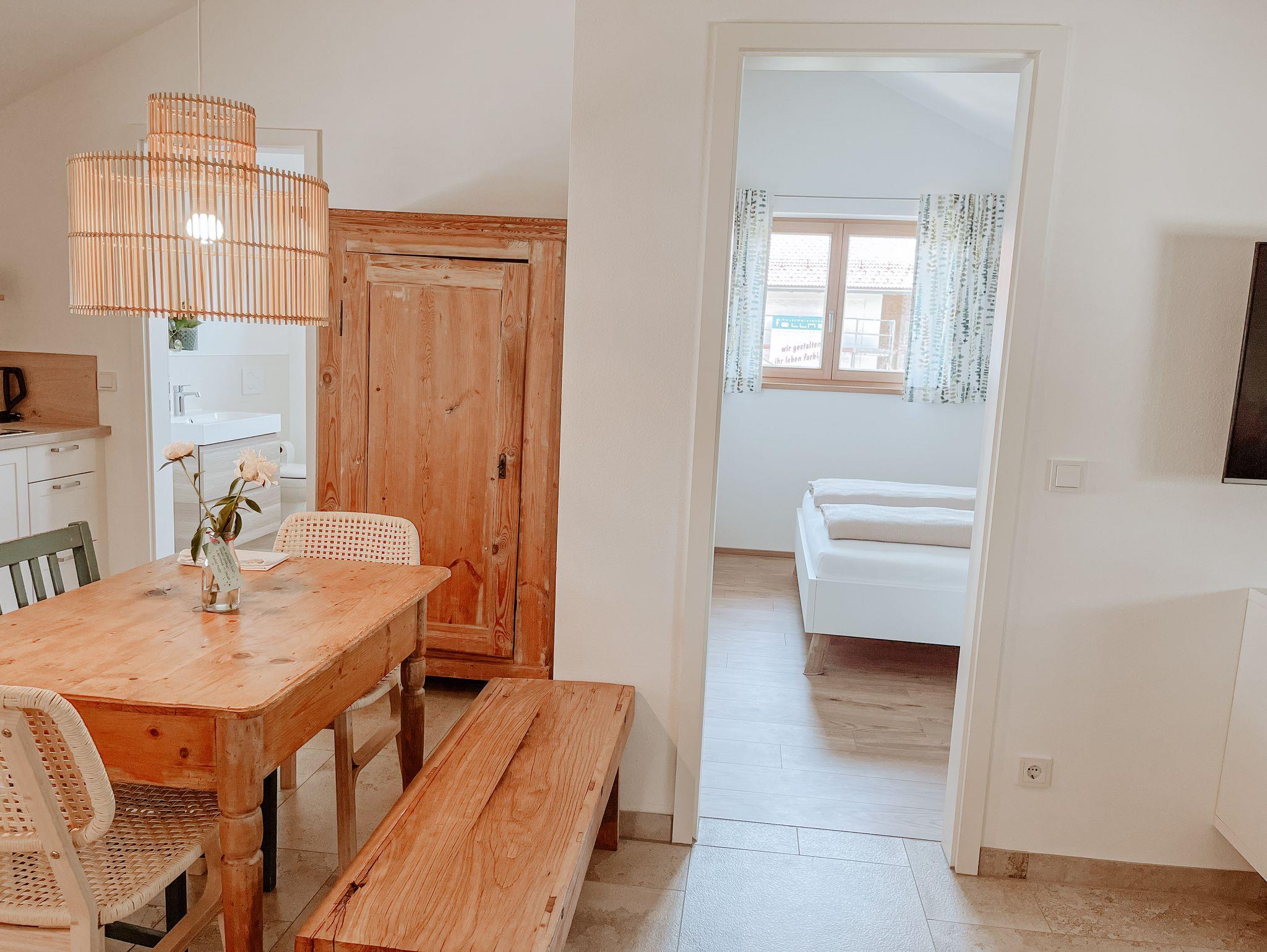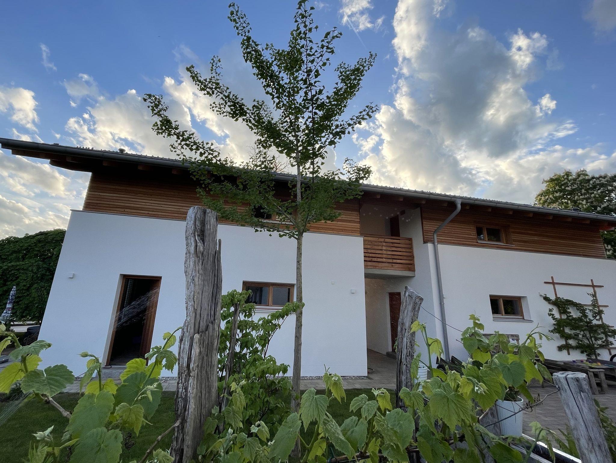 Neubau mit moderner Ausstattung über Außentreppe erreichbar. Separater Eingang. Die Wohnung verfügt über ein Schlafzimmer mit einem Doppelbett mit 180 x 200 cm, ein Bad und eine voll ausgestattete Küche mit Esstisch und einem gemütlichen Bereich mit Couch zum Entspannen. Privatparkplätze, Mitbenutzung der Terrasse im Garten, Obstgarten, WLAN, Fernseher, keine Hunde. Kinder auf Anfrage.
