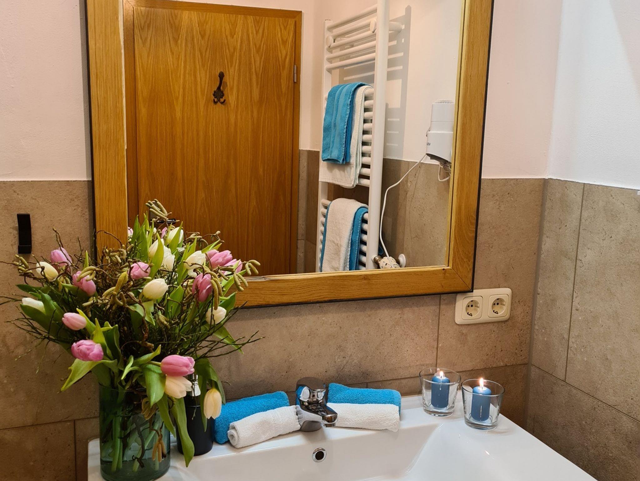 Die komplett renovierte Ferienwohnung Elisabeth hat 45 qm, bietet Platz für 1 bis 2 Personen und besteht aus einem Wohnraum mit Küche und Essecke, einem separaten Schlafzimmer und Dusche mit WC. WLAN ist natürlich kostenfrei verfügbar.
