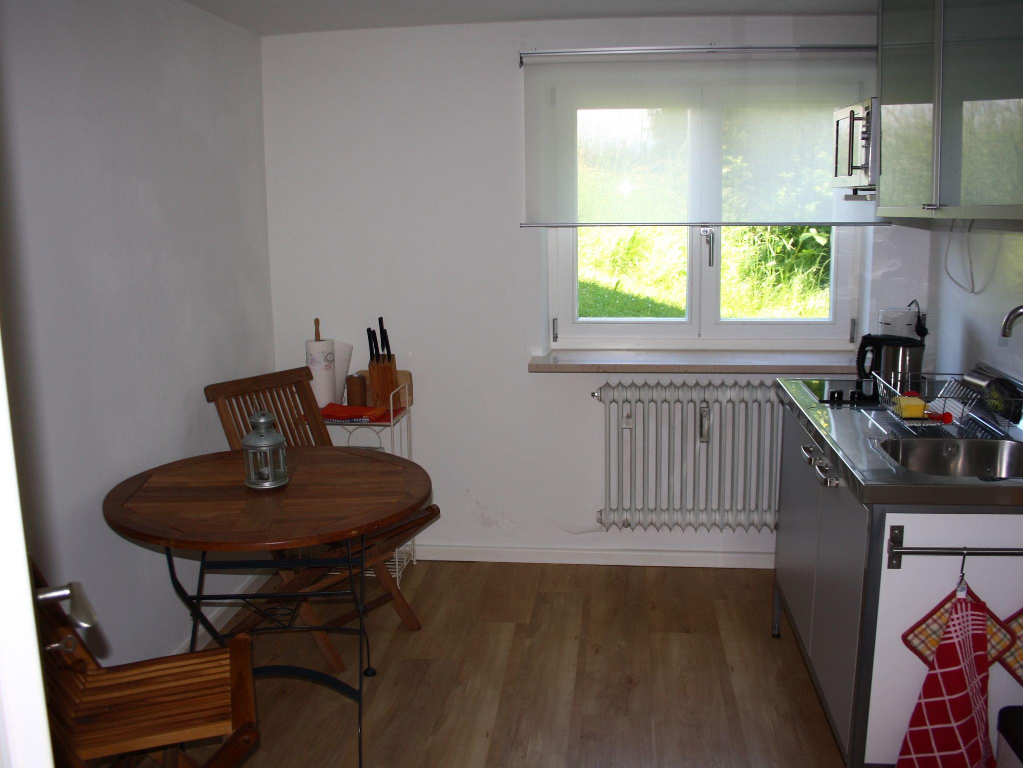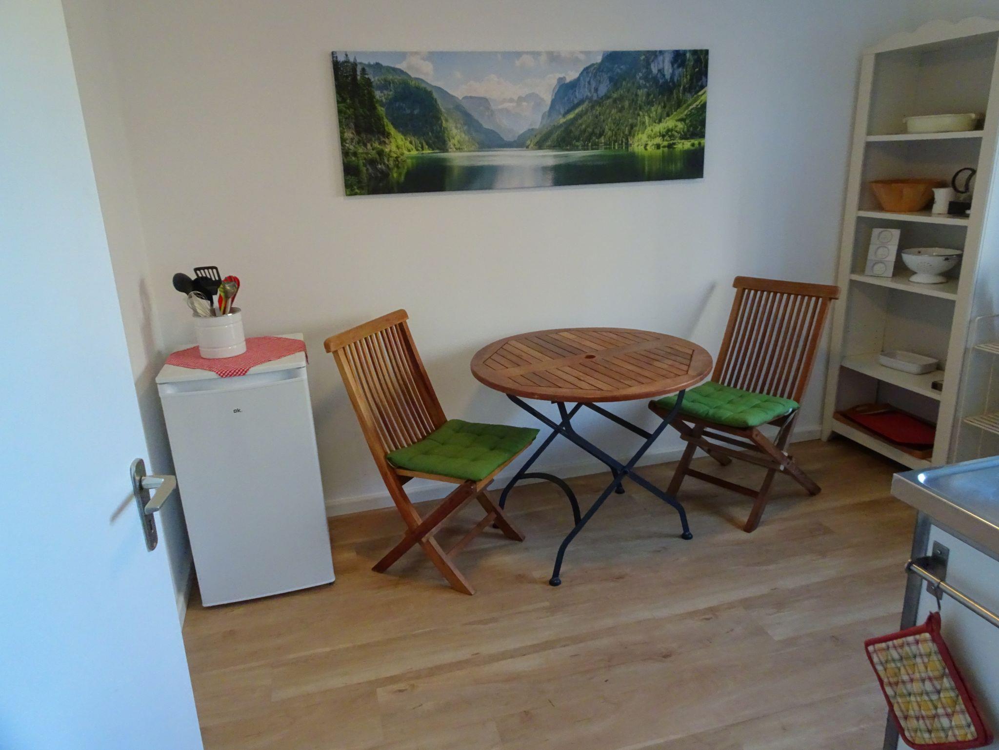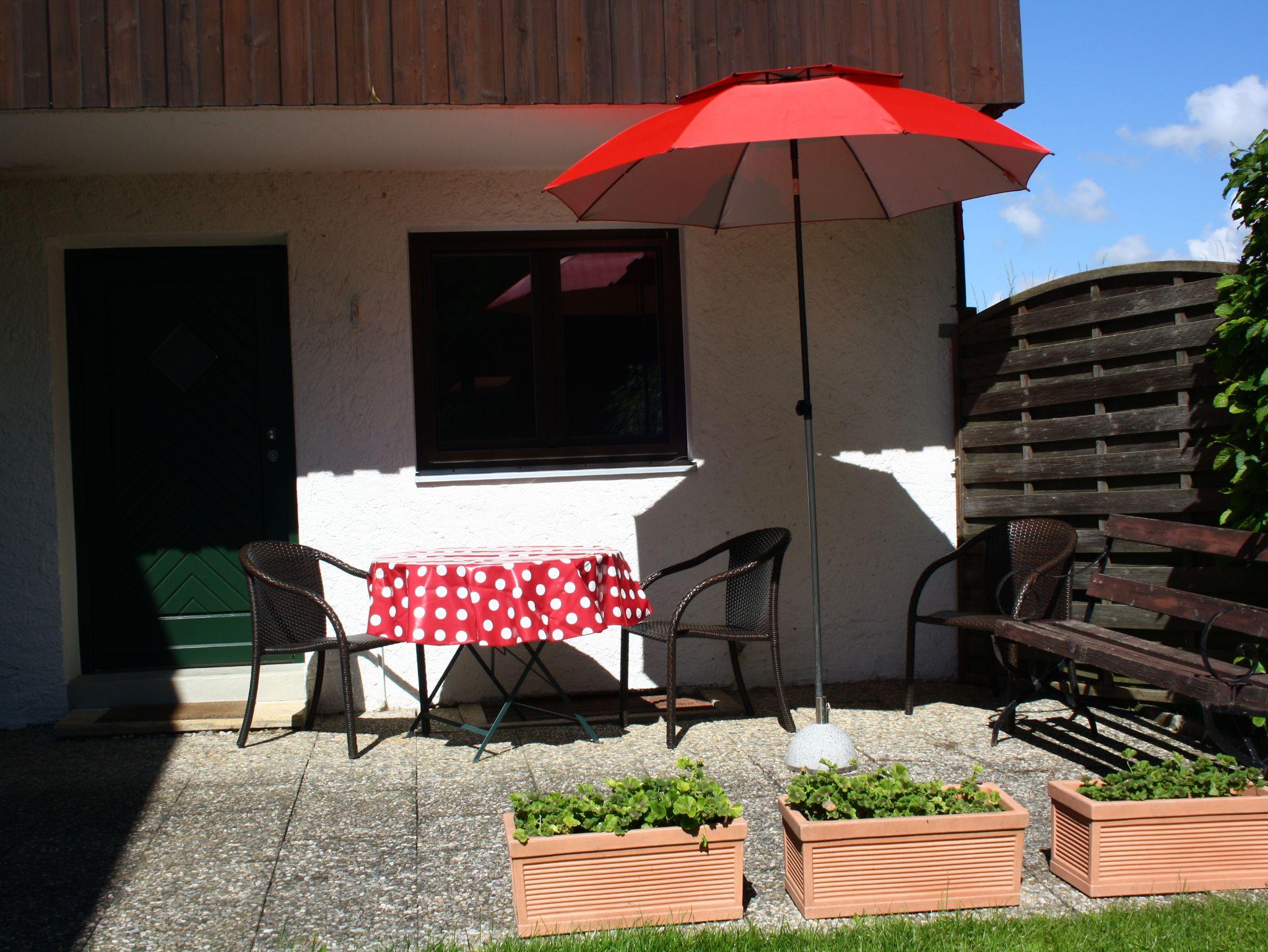 Dieses Appartement befindet sich im Erdgeschoss vom Zuhäusl (steht direkt neben dem Haupthaus). Ihnen stehen zur Verfügung: 1 Wohn-, Schlafraum mit Schlafsofa (160 cm x 200 cm); 1 kleine Küche mit Essecke, 2 Herdplatten, 1 Kombigerät mit Mikrowelle/Backofen/Grill, Kühlschrank und alles was in einer Küche gebraucht wird; Fernseher und CD-Anlage mit Radio; 1 kleines Duschbad mit Waschbecken und WC.