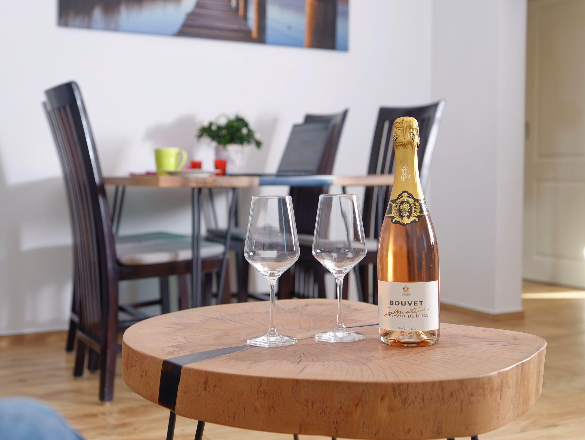2 separate Schlafzimmer, ein Doppelbett, zwei Einzelbetten und Schlafcouch im Wohnzimmer, Bettwäsche, Bügelmöglichkeit, Heizung. 2 Bäder mit WC und einmal Dusche, einmal Badewanne, Babyhochstuhl, Handtücher und Föhn. Wohnzimmer mit Essecke, Sitzgruppe, TV, W-LAN. Küche, Geschirrspüler, Ceranherd und Backofen, Kühlschrank mit separater Tiefkühleinheit. Balkon mit Balkonmöbeln und zusätzlicher Terrasse mit Gartenmöbeln, Grillen auf der Terrasse nach Absprache erlaubt, Nichtraucherwohnung, Waschmaschine vorhanden, Hunde erlaubt, Stellplatz Auto / Trockener Stellplatz für Motorräder / Fahrräder + Stellplatz für einen Motorradhänger kann gerne gestellt werden.