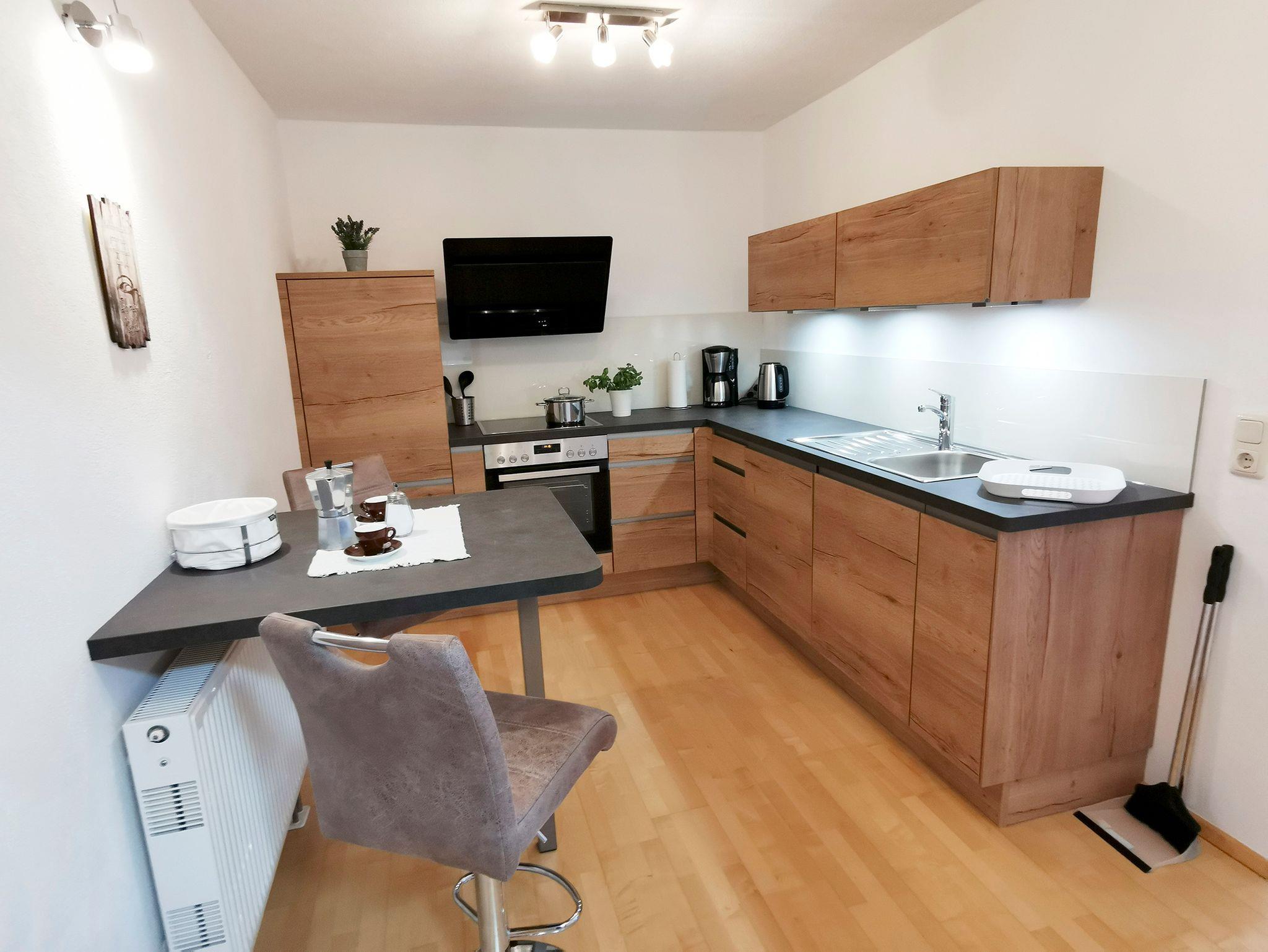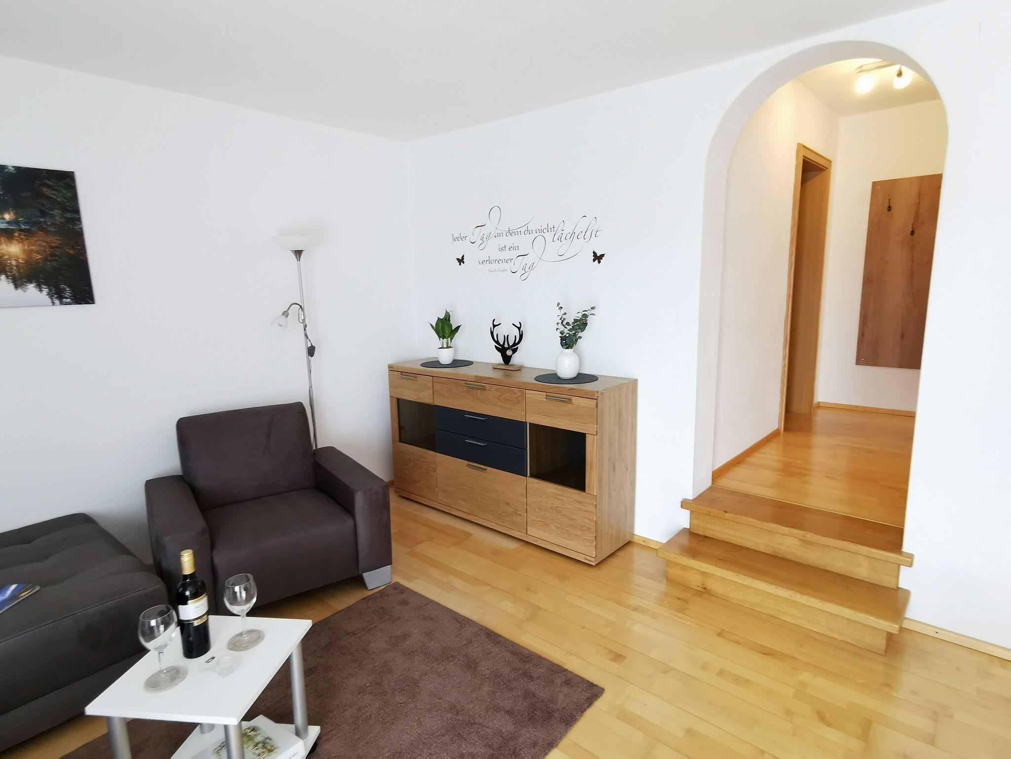 Die Grundfläche der Ferienwohnung beträgt 60 qm und sie befindet sich im ersten Obergeschoss des Bauernhauses mit Ausrichtung nach Süden.Sie verfügt über eine moderne Küche mit Spülmaschine, ein Wohn-Esszimmer mit großer Lümmelcouch, ein separates Schlafzimmer, ein Bad mit DU/WC, sowie ein zusätzliches separates WC. WLAN, ein Flachbild-TV und Kaffeemaschine, Toaster, Backofen, großes Gefrierfach, Wasserkocher, Fön und Bettwäsche sind ebenfalls vorhanden.Ein Südbalkon mit Bestuhlung, Tisch und Sonnenschirm sorgt für zusätzlichen Komfort und Entspannung.