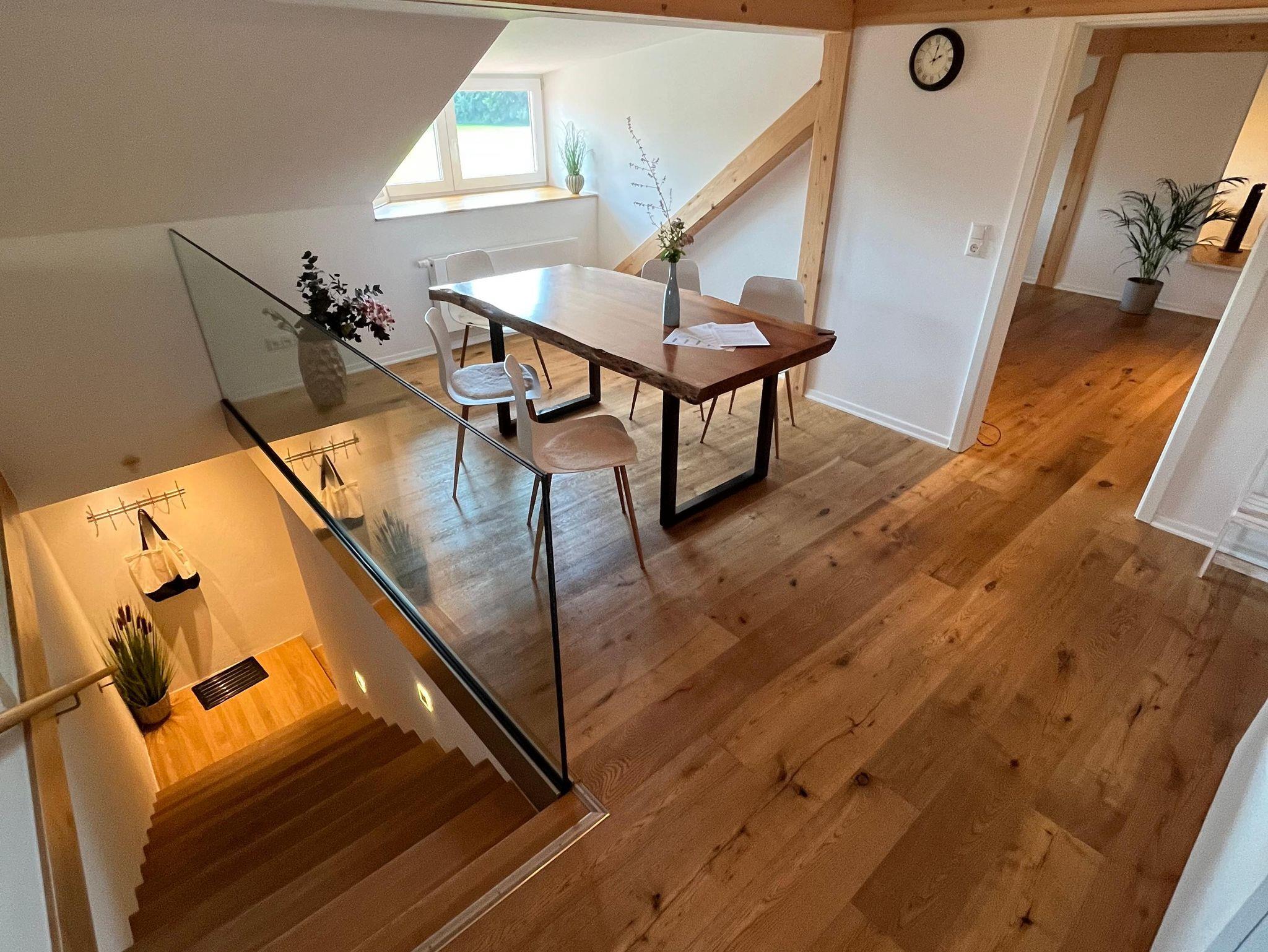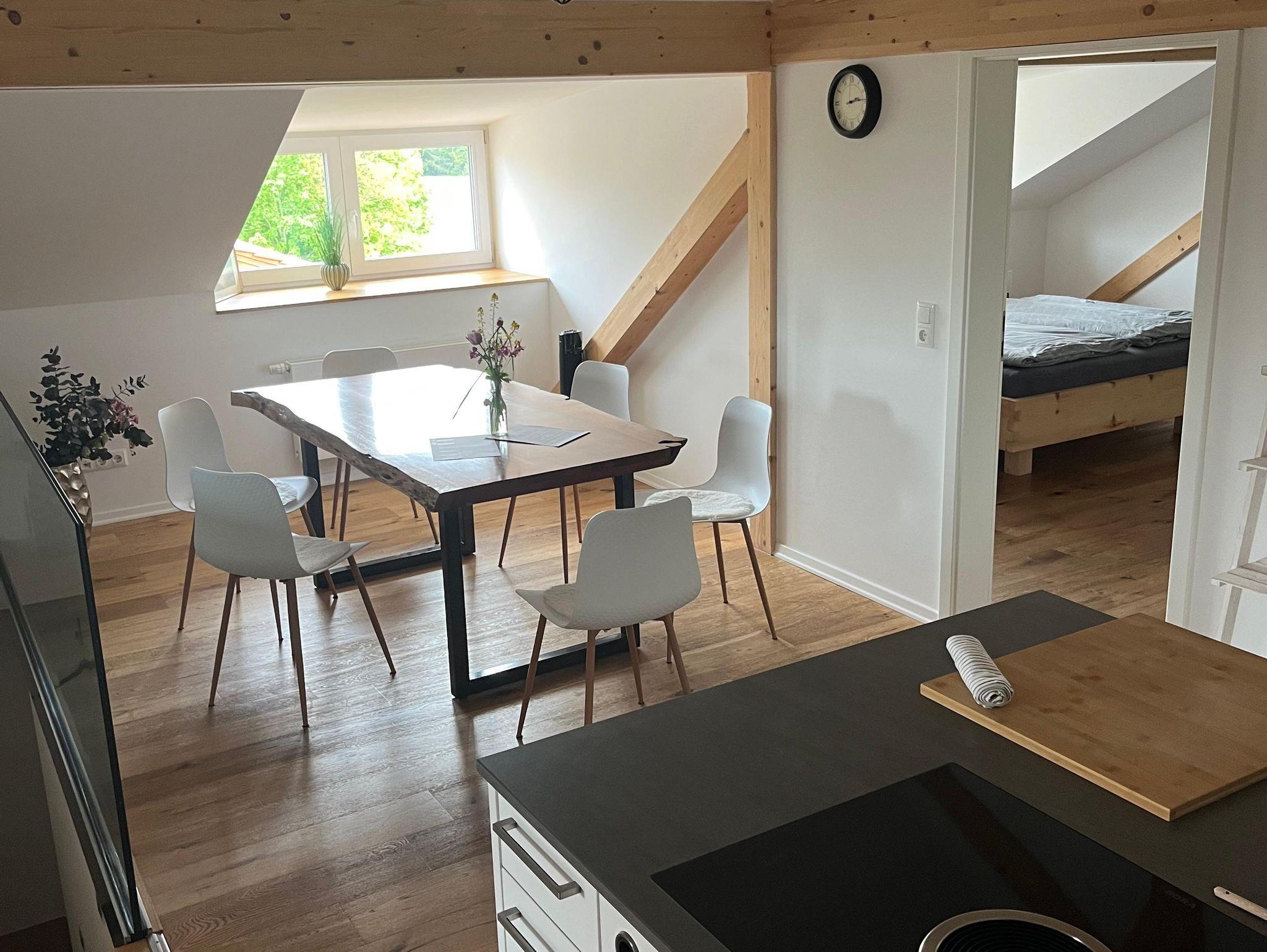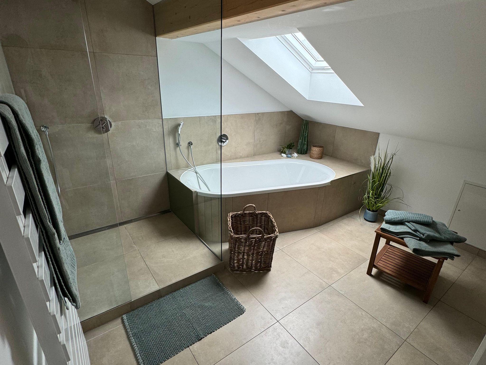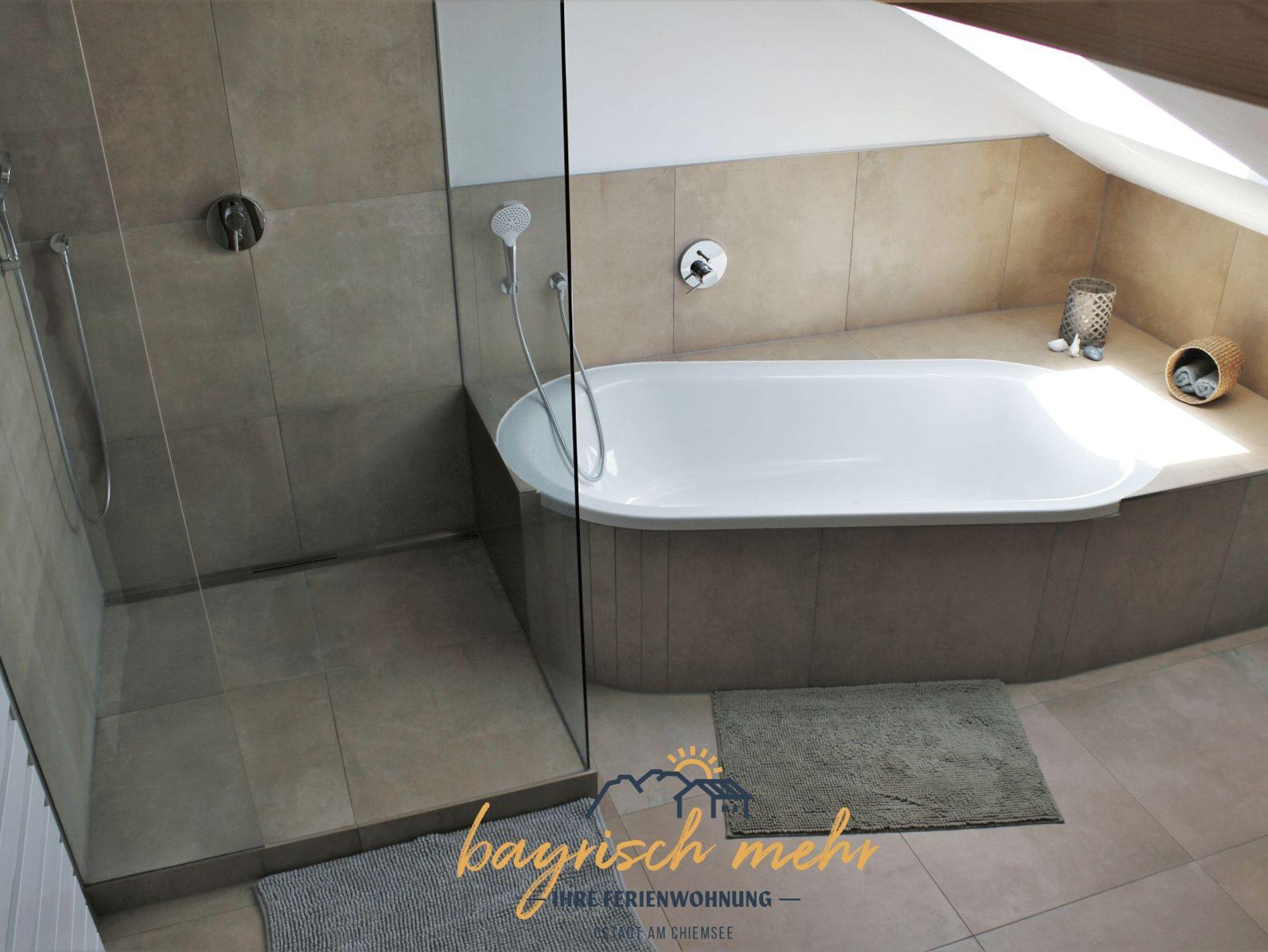 Neue Ferienwohnung - grundsaniert 2021! Die Ferienwohnung mit ihren geräumigen 85 m² ist in ein Wohnzimmer, Küche mit Essbereich, zwei Schlafzimmer und Badezimmer aufgeteilt. Außerdem gibt es einen Süd-Balkon mit Blick auf den See, von der man die Morgensonne genießen kann. Das Wohnzimmer ist zur Seeseite mit direktem Zugang zum Balkon gelegen. Ein großes Sofa mit Flachbildfernseher laden zum gemütlichen Verweilen ein. Unsere Küche ist komplett ausgestattet. Die Essecke im Küchenbereich bietet genügend Platz für die ganze Familie. Von dort erblickt man unseren Hausberg, die Kampenwand. Die Nächte verbringen Sie in unseren zwei Schlafzimmern in einem Zirbenbett. Ein Zustellbett für Kinder stellen wir auf Anfrage gerne bereit. Das großzügige und moderne Badezimmer verfügt über eine Badewanne und Regenwalddusche.