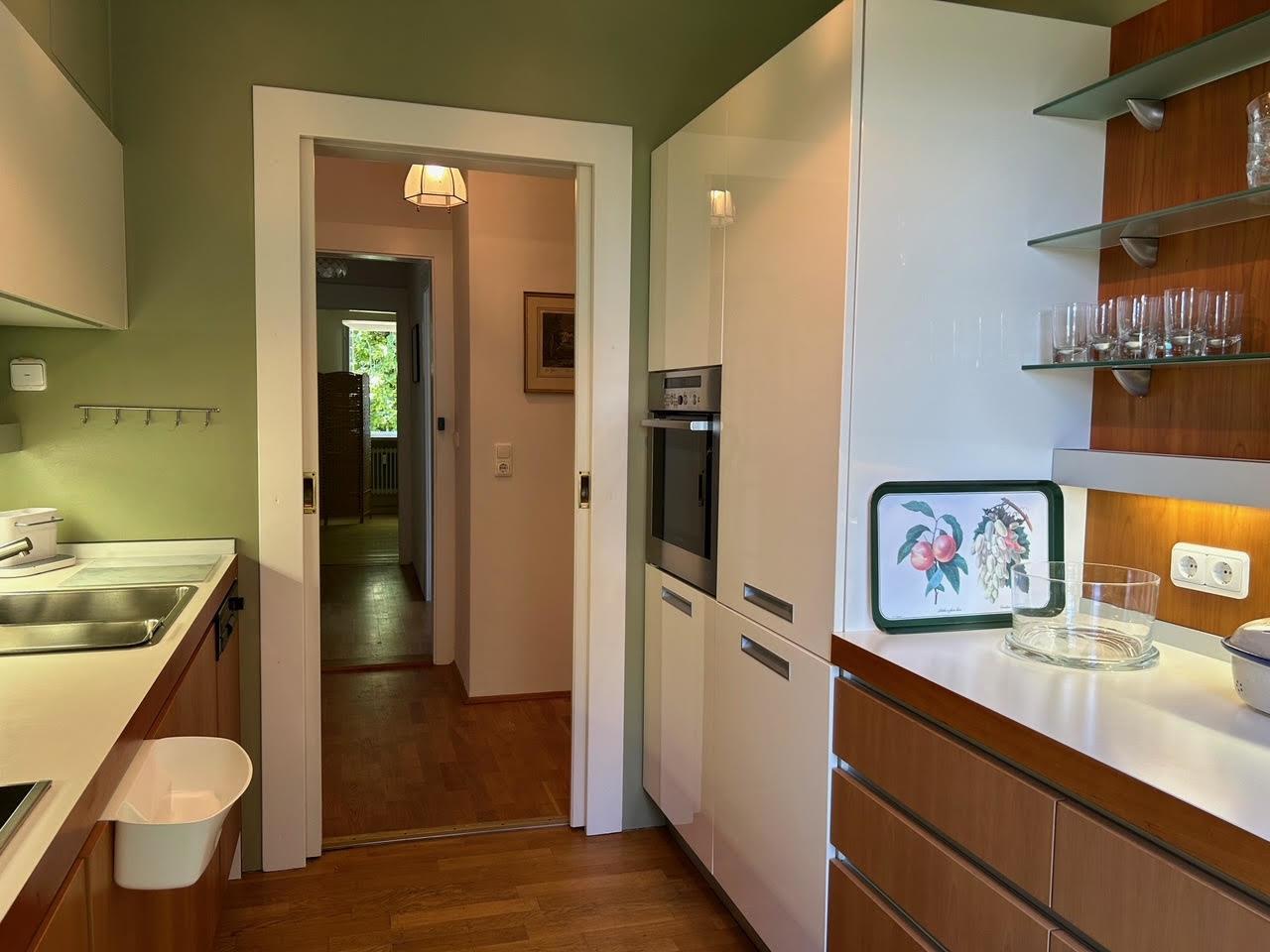 Die Wohnung verfügt über ein großzügiges Badezimmer mit Badewanne, Dusche, Bidet und einem original viktorianischen Waschbecken. Die voll ausgestattete Küche mit Geschirrspüler, Herd, Kühlschrank und Ofen/Mikrowelle lässt keine Wünsche offen.