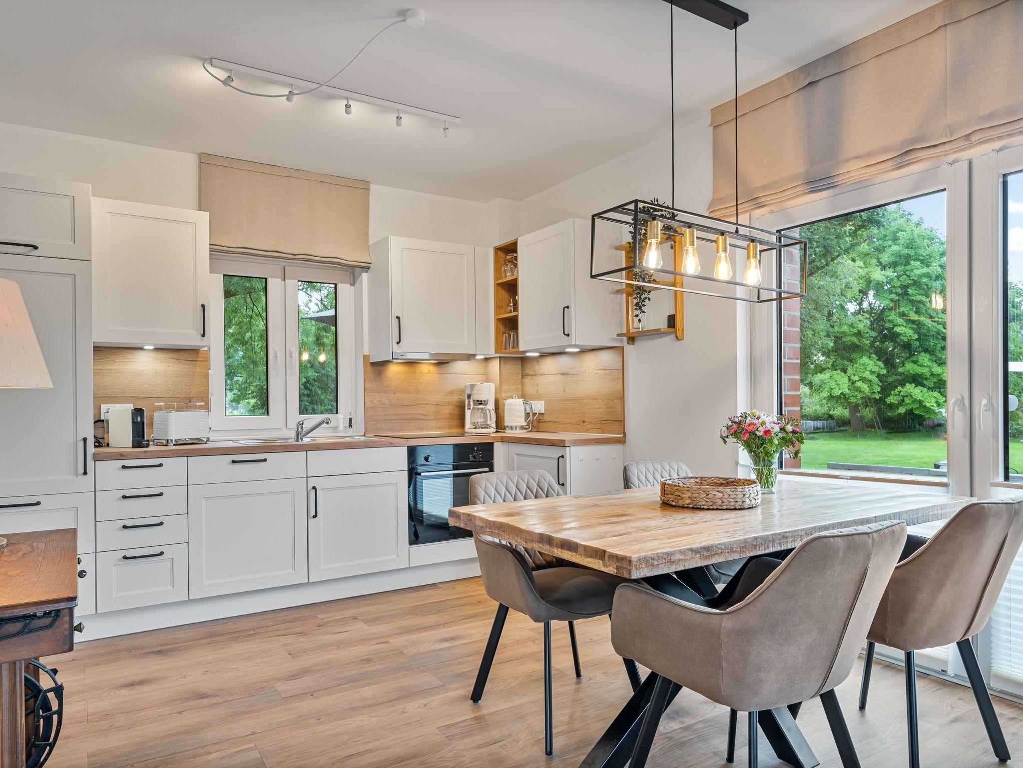 • Wohnraum mit offener Küche, Smart-TV, Radio, Terrassentür, Fenster und Terrassentüren sind ausgestattet mit Plissees und Rolläden