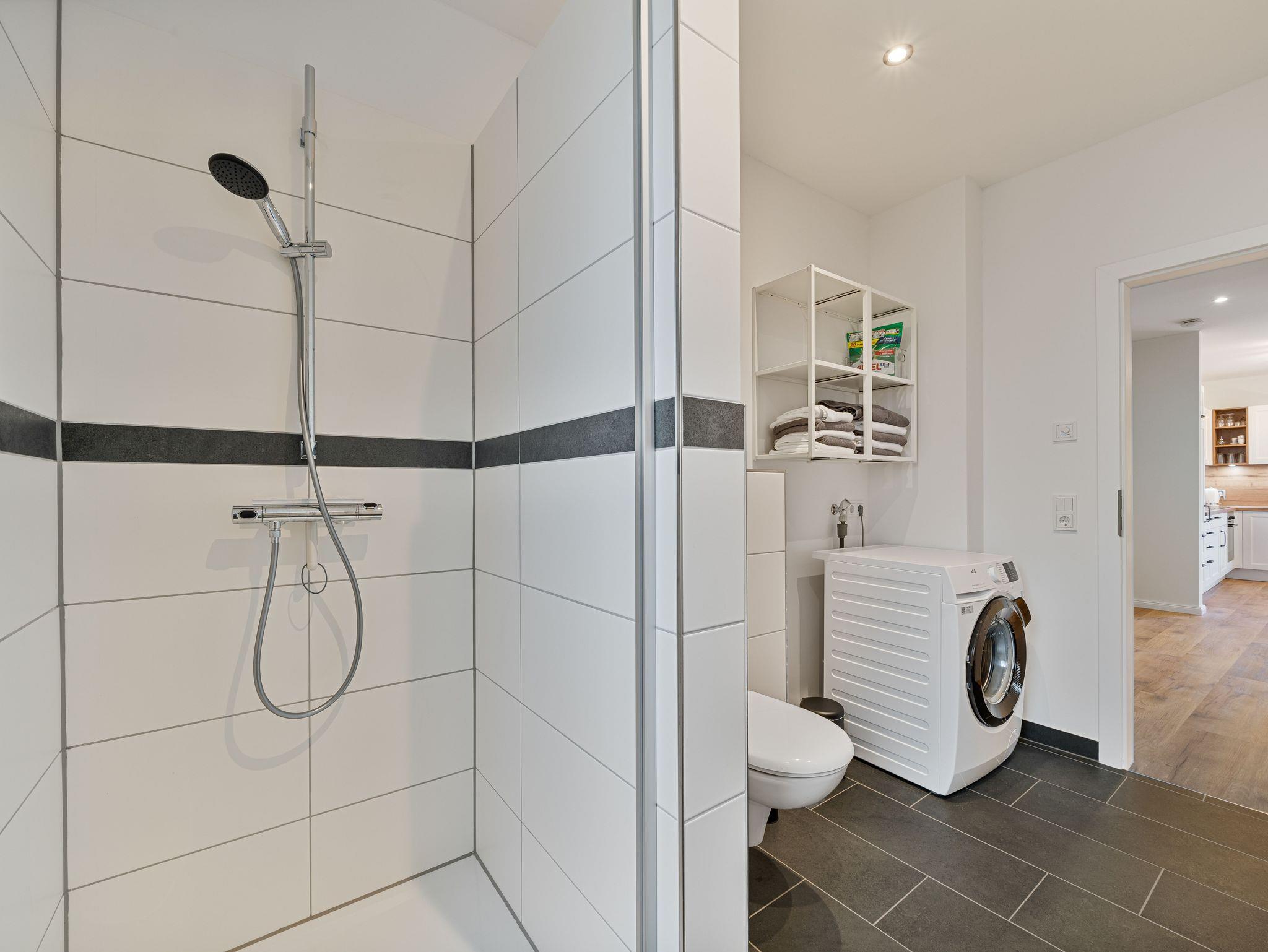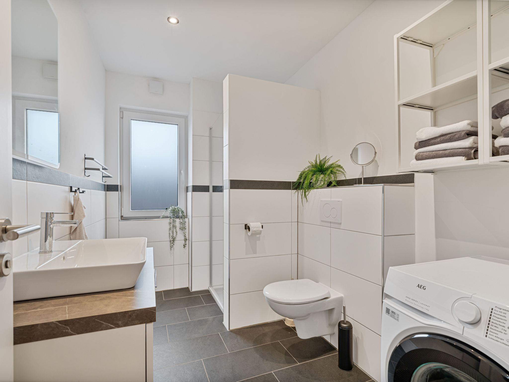 • 1 Badezimmer mit Dusche, WC, Waschtisch, Haartrockner, Handseife, Waschmaschine