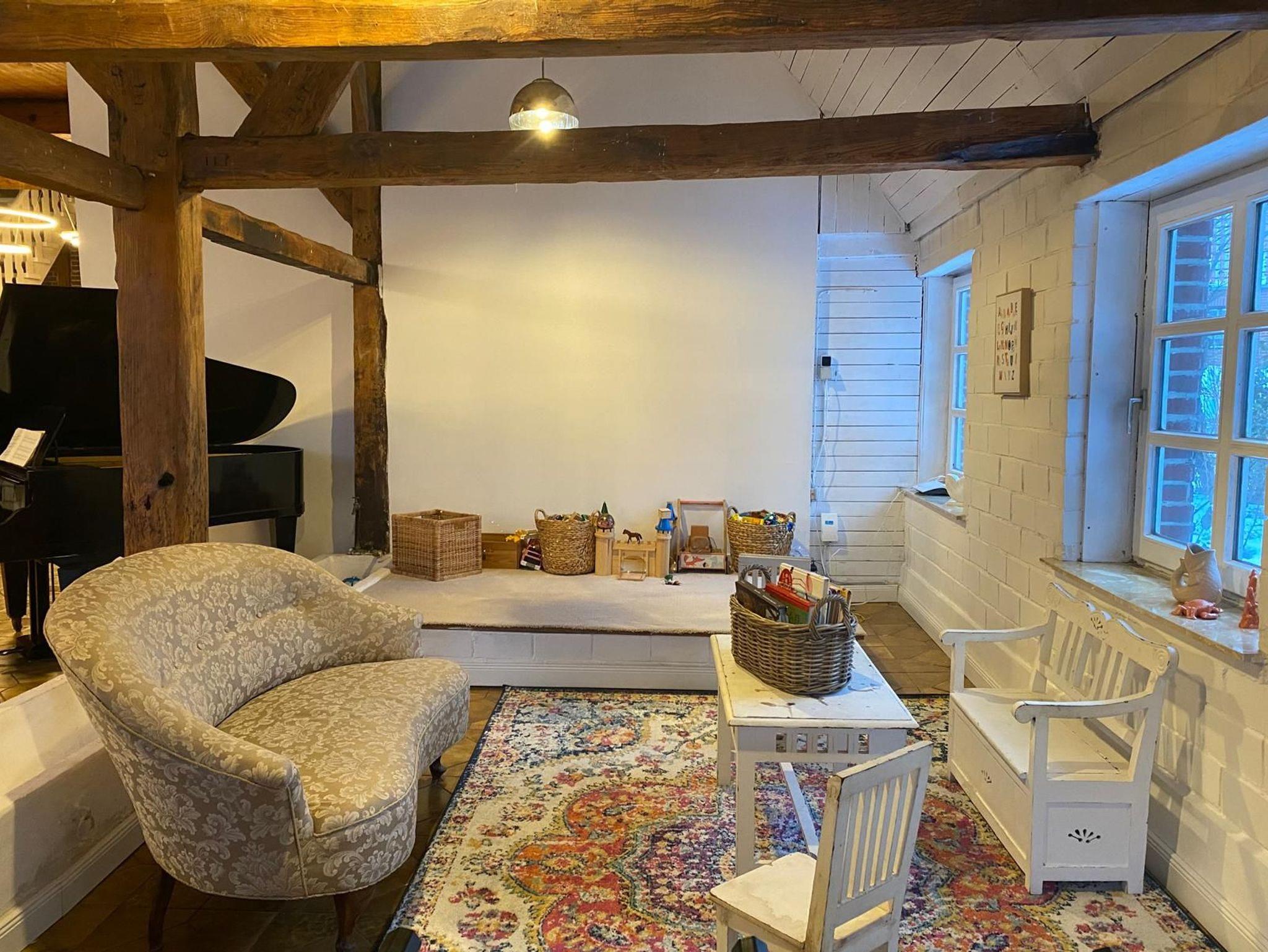 Musizieren Sie am Flügel, spielen Sie Dart oder Tischkicker, schaukeln Sie gemütlich oder genießen Sie die behagliche Atmosphäre des flackernden Kaminfeuers.