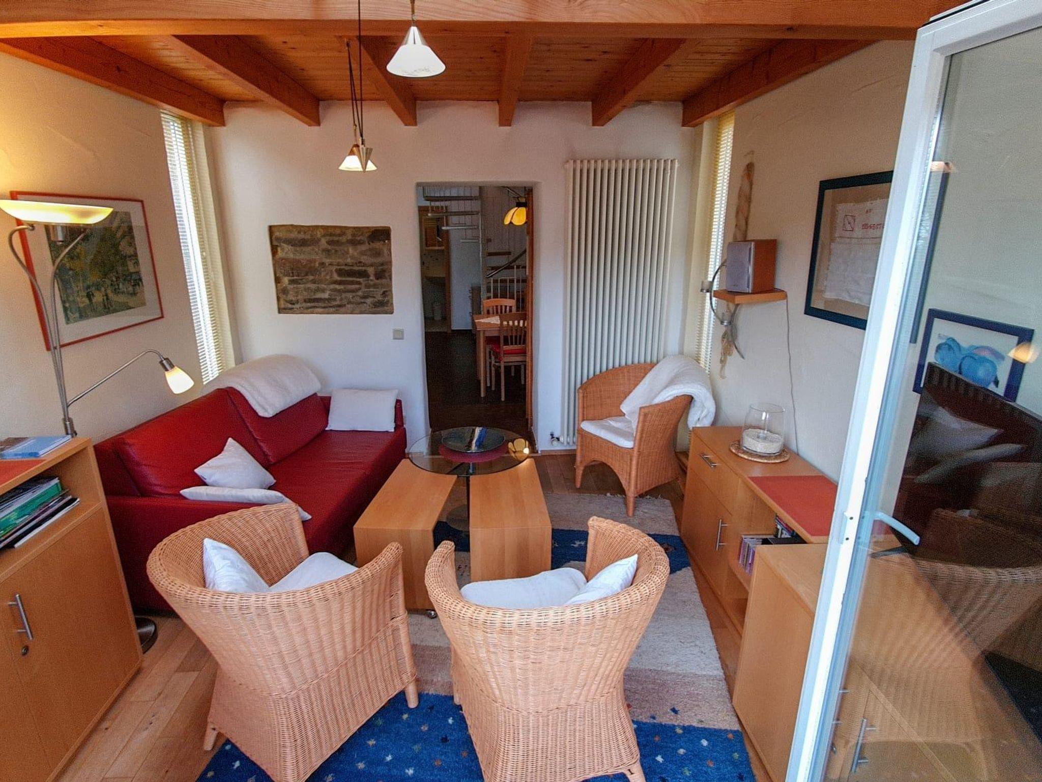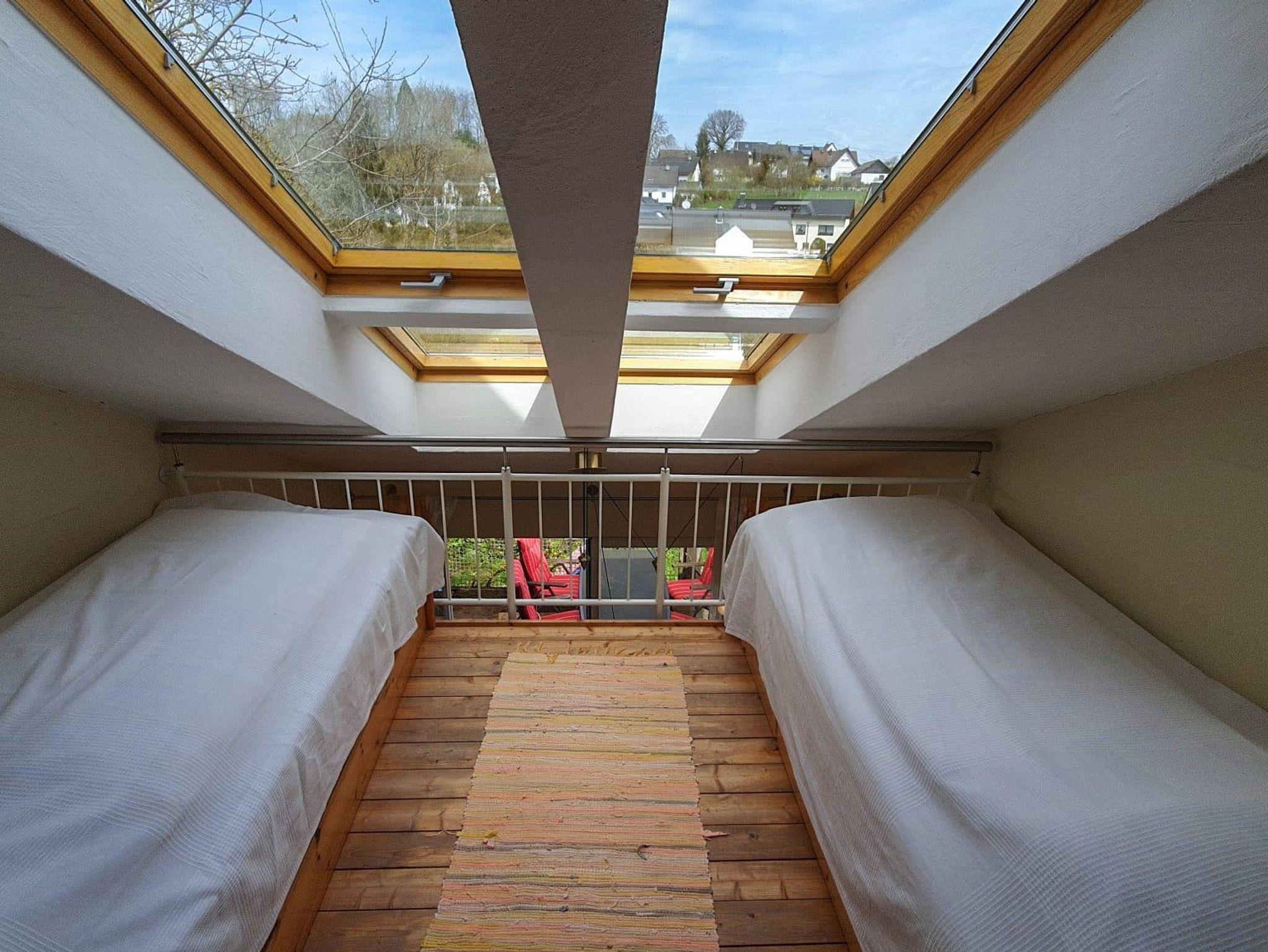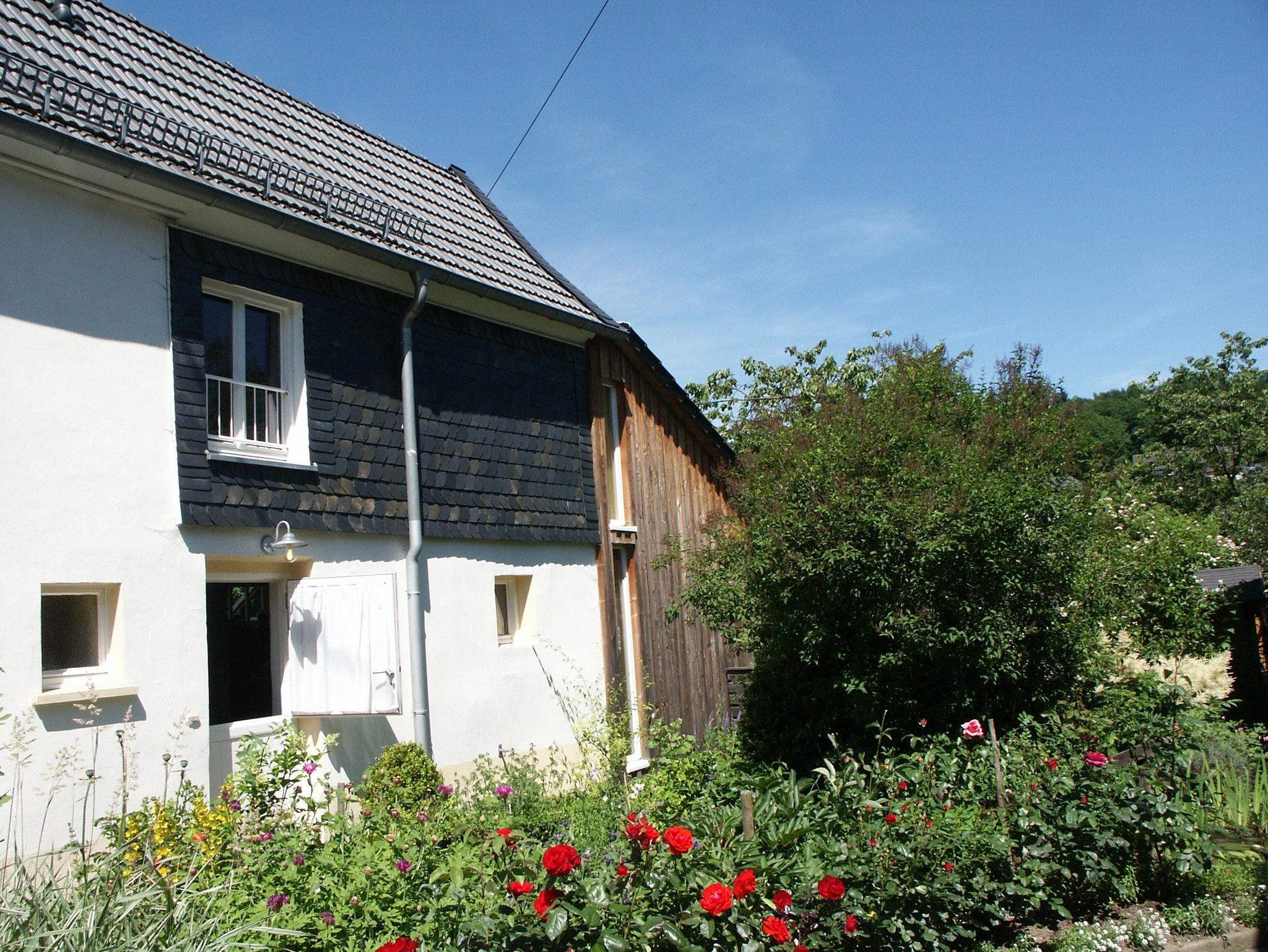 Urlaub genießen, den Naturpark Bergisches Land entdecken und im Anbau eines 300 Jahre alten Denkmals gemütlich und komfortabel wohnen. Zur Ferienwohnung gehören ein Stellplatz, ein kleiner Bauerngarten und eine große Terrasse mit wunderschönem Blick auf die Obstwiese. Die voll ausgestattete Küche verführt zum Kochen und Backen. Eine gemütliche Sitzgruppe lädt im Wohnzimmer zum Entspannen ein. Historische Fachwerkbalken, Bruchsteinwände und ein offener Raum bis in den Dachfirst zeugen von der Geschichte des Hauses. Die alten Baustoffe Lehm, Holz und Kork schaffen ein Raumklima, in dem sich auch Allergiker wohl fühlen. Neben dem Bad führt eine bequeme Wendeltreppe ins Obergeschoss. Eine Sitzecke lädt ein zum Schmökern, Spielen und Malen. Auf der Empore über dem Wohnzimmer kann man von den zwei Einzelbetten 90x200 cm weit über das Tal und in den Sternenhimmel sehen. Das Alter des Gebäudes wird in dem kuscheligen Schlafzimmer mit Doppelbett 180x200 cm noch einmal ganz besonders spürbar.