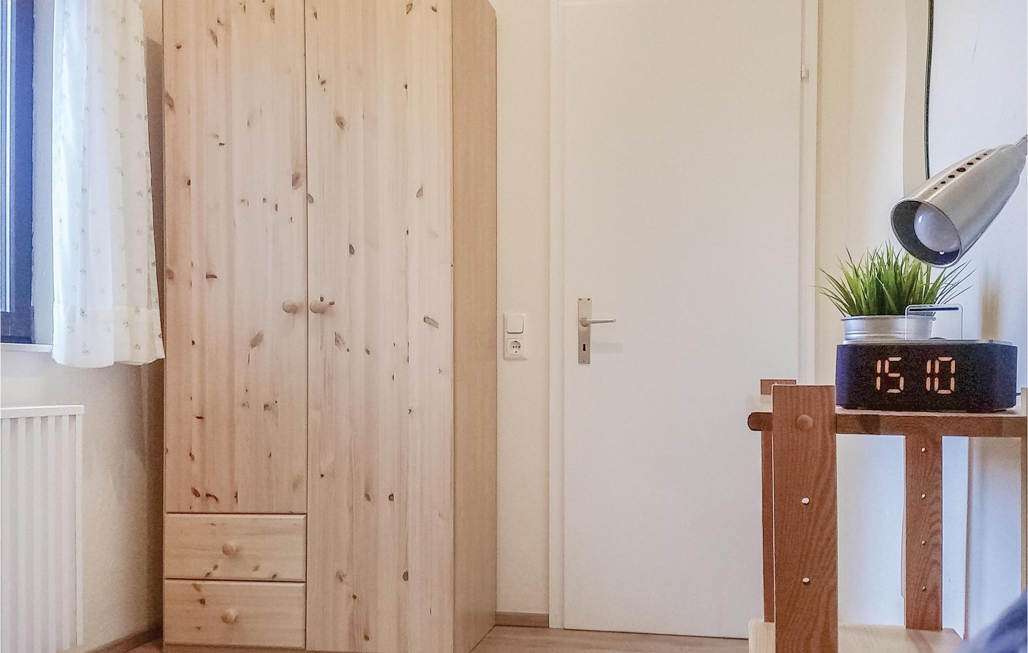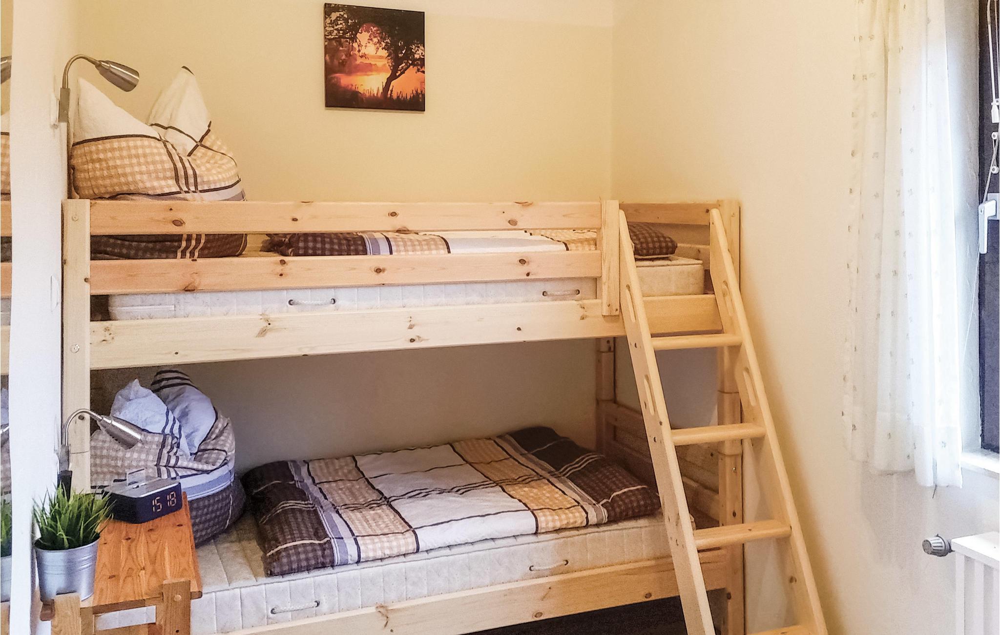Das Haus verfügt über zwei neu eingerichtet Schlafzimmer. Passend zum Konzept „Waldblick“ wurden beide Räume in einer gemütlichen Holzoptik gehalten. Im ersten Zimmer wartet auf unsere Gäste ein Doppelbett mit höhenverstellbarem Lattenrost. Im zweiten Schlafzimmer steht ein maßgefertigtes Etagenbett. Das von unseren Gästen geliebte Etagenbett besteht aus zwei sehr bequemen Einzelbetten, die je 0,9m x 2,0m sind. Zur Ausstattung gehören Radiowecker und sogar ein Smartphone iHome Wecker. Bei Bedarf kann zusätzlich im Wohnbereich eine komfortable Schlafcouch und ein Zustellbett genutzt werden. Die Betten sind auf Wunsch frisch bezogen, wenn Sie anreisen.