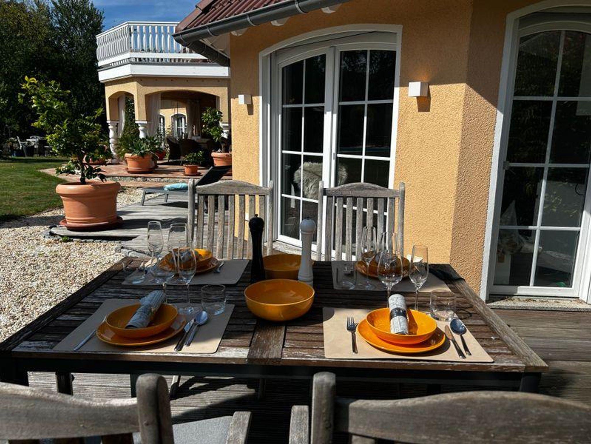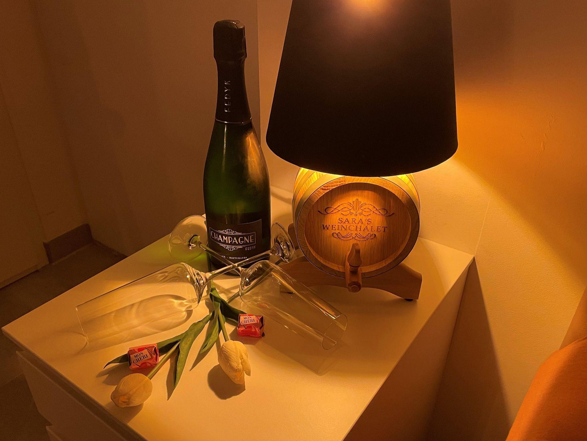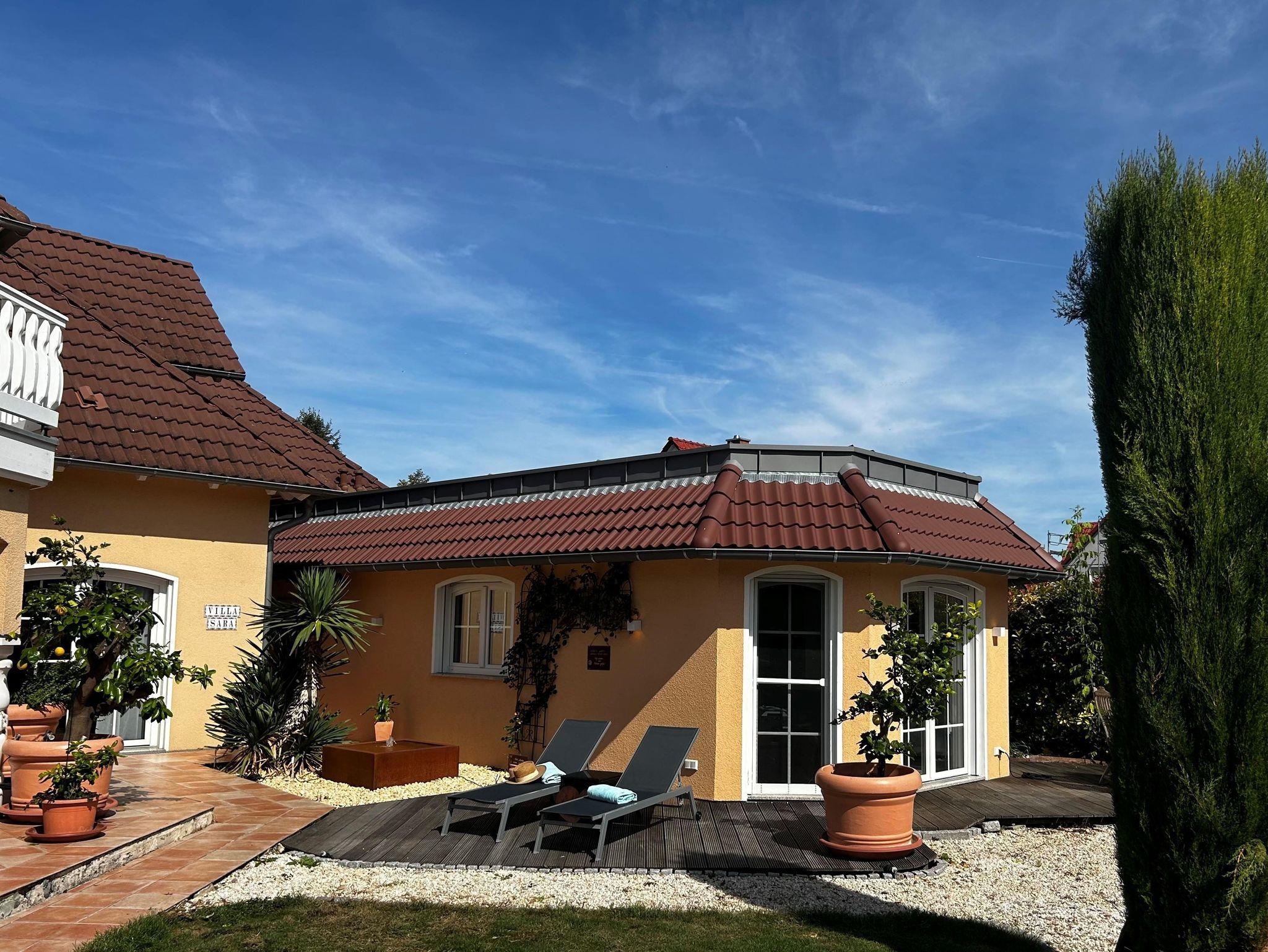 Saras Weinchalet mit 55 qm, lichtdurchflutet, ebenerdig und barrierefrei, ermöglicht 2-4 Personen einen exklusiven Aufenthalt mit bester Ausstattung und einer eigenen Terrasse mit Blick über den großen Garten und den großen Außen Pool.
