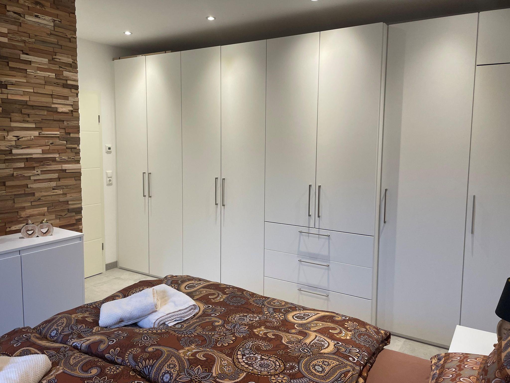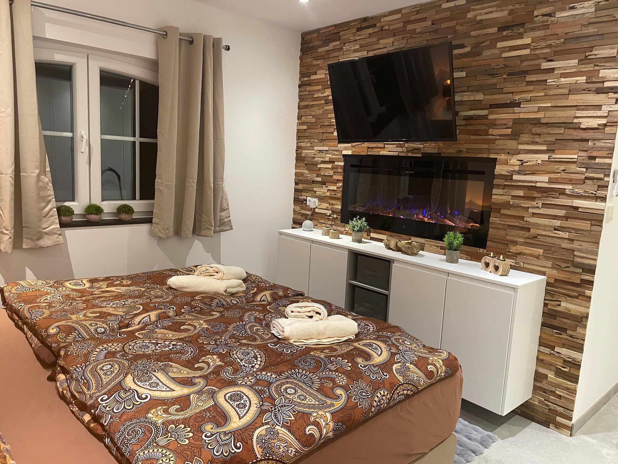 Das Schlafzimmer mit einem hochwertigen Boxspring-Doppelbett (180x200), geschmackvolle, abgestimmte Qualitäts-Bettwaren, einem großen Elektro-Kamin, TV Anlage und reichlich Platz in Schränken, um persönliche Dinge zu verstauen, machen das Schlafen und den Aufenthalt zu einer Erholung.