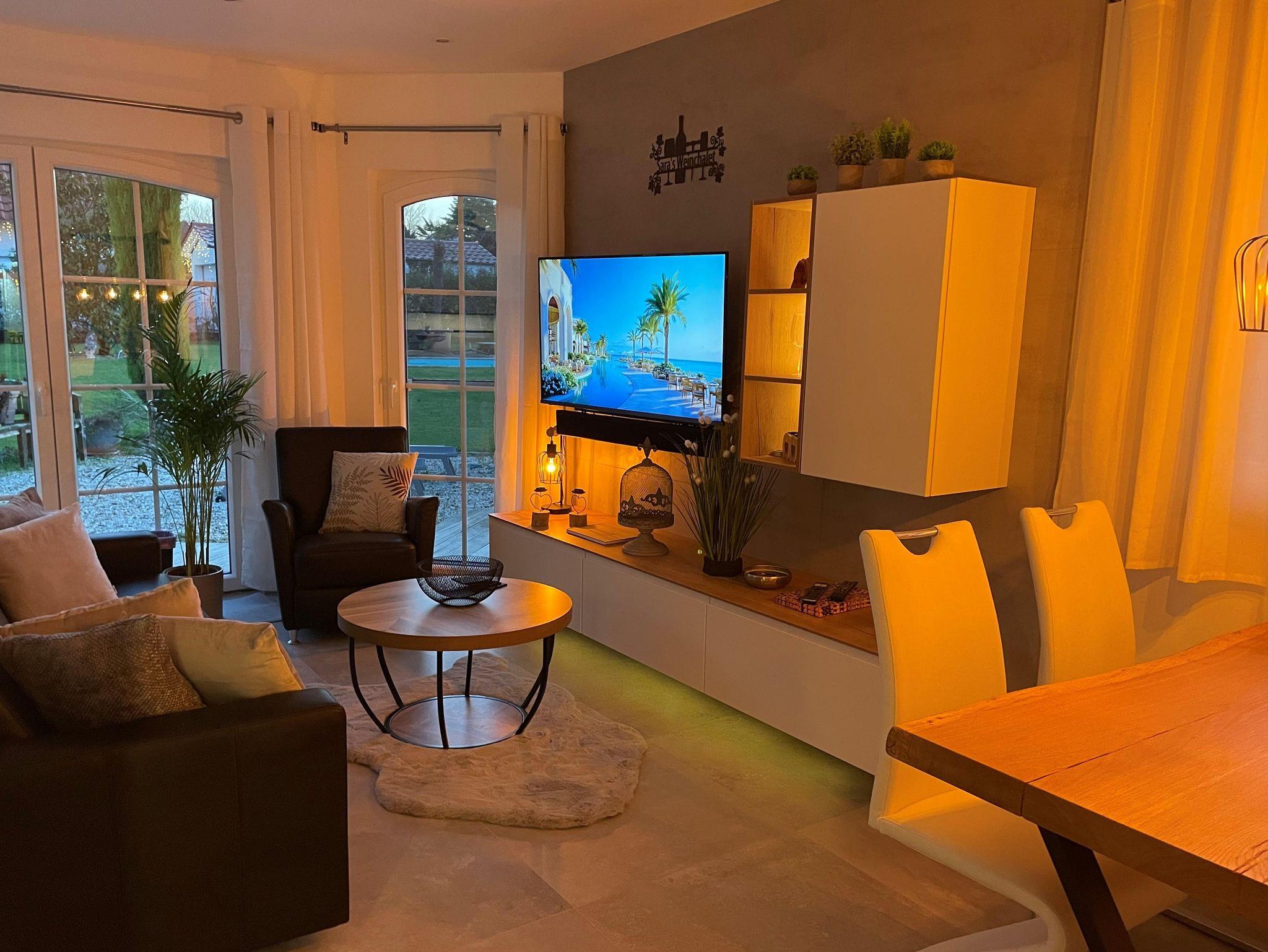 Das angrenzende Wohn-Esszimmer mit integrierter Küche runden das Angebot ab. Das Wohnzimmer verfügt über eine exklusive Leder-Couch, super gemütlich zum Sitzen und Genießen, die sich (bei Belegung mit 4 Personen) im Handumdrehen zu einem weiteren vollwertigen Schlafplatz umwandeln lässt. Die Schlafcouch verfügt über einen Lattenrost und gute Matratzen (160 x 200), was mehr ist als nur eine Schlafcouch. Auch hier lässt es sich wunderbar schlafen und träumen mit Blick über den beleuchteten Garten. Im Wohnzimmer befindet sich eine High Tech TV Anlage, die Dolby Sourround Kino ermöglicht, für Popcorn und Getränke dazu müsst Ihr selbst sorgen.