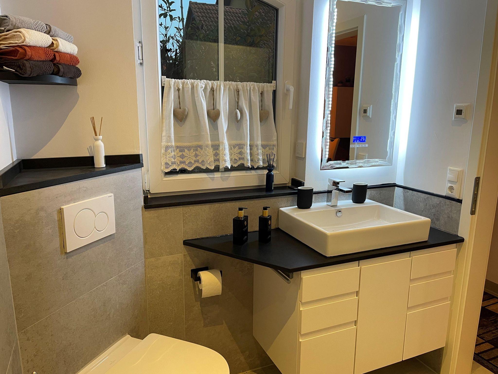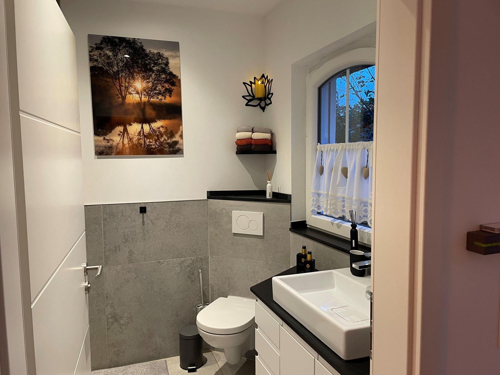 Das Bad - mit tollen Kuschel-Handtüchern und ein paar schönen Extras bietet Euch Wellness pur. Es gibt eine ebenerdige breite Dusche, einen Waschtisch, beleuchteten Spiegel und ein WC, Handseife, Fön, Duft-Aromen, Toilettenpapier etc inklusive.