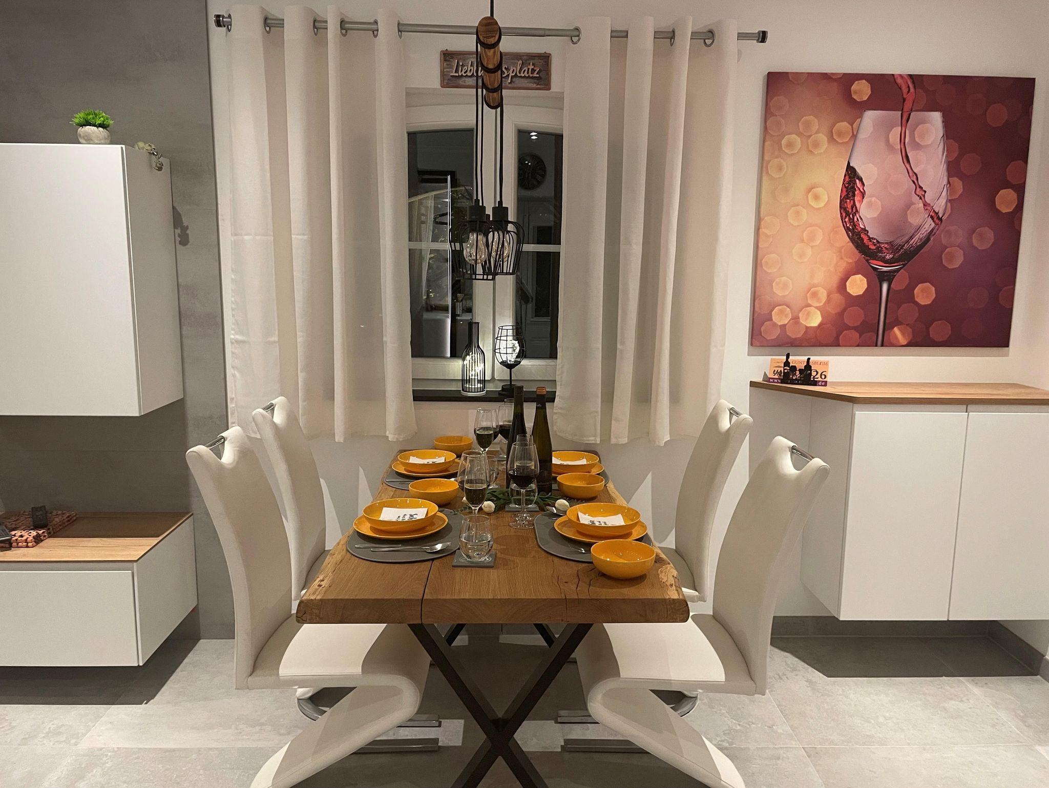 Das Esszimmer verfügt über einen Naturholztisch in wunderschöner Form und vier bequemen Schwingsesseln - hier lässt es sich wunderbar speisen, erzählen oder auch eines der vorhandenen Gesellschaftsspiele spielen.