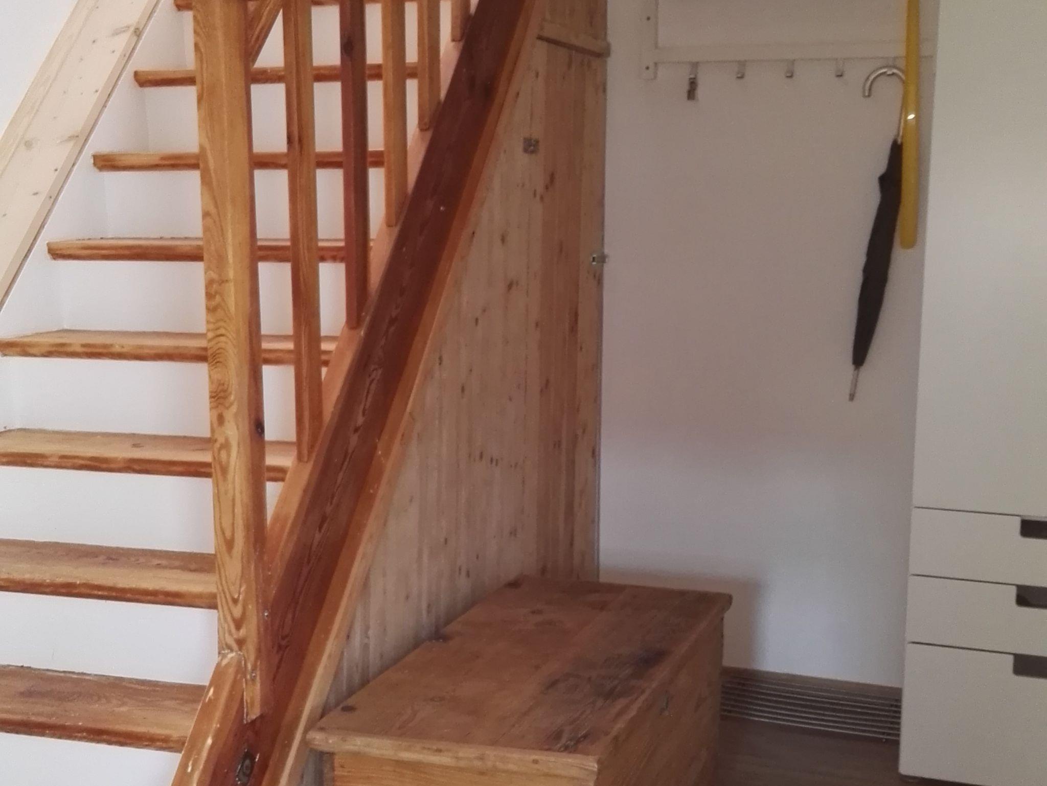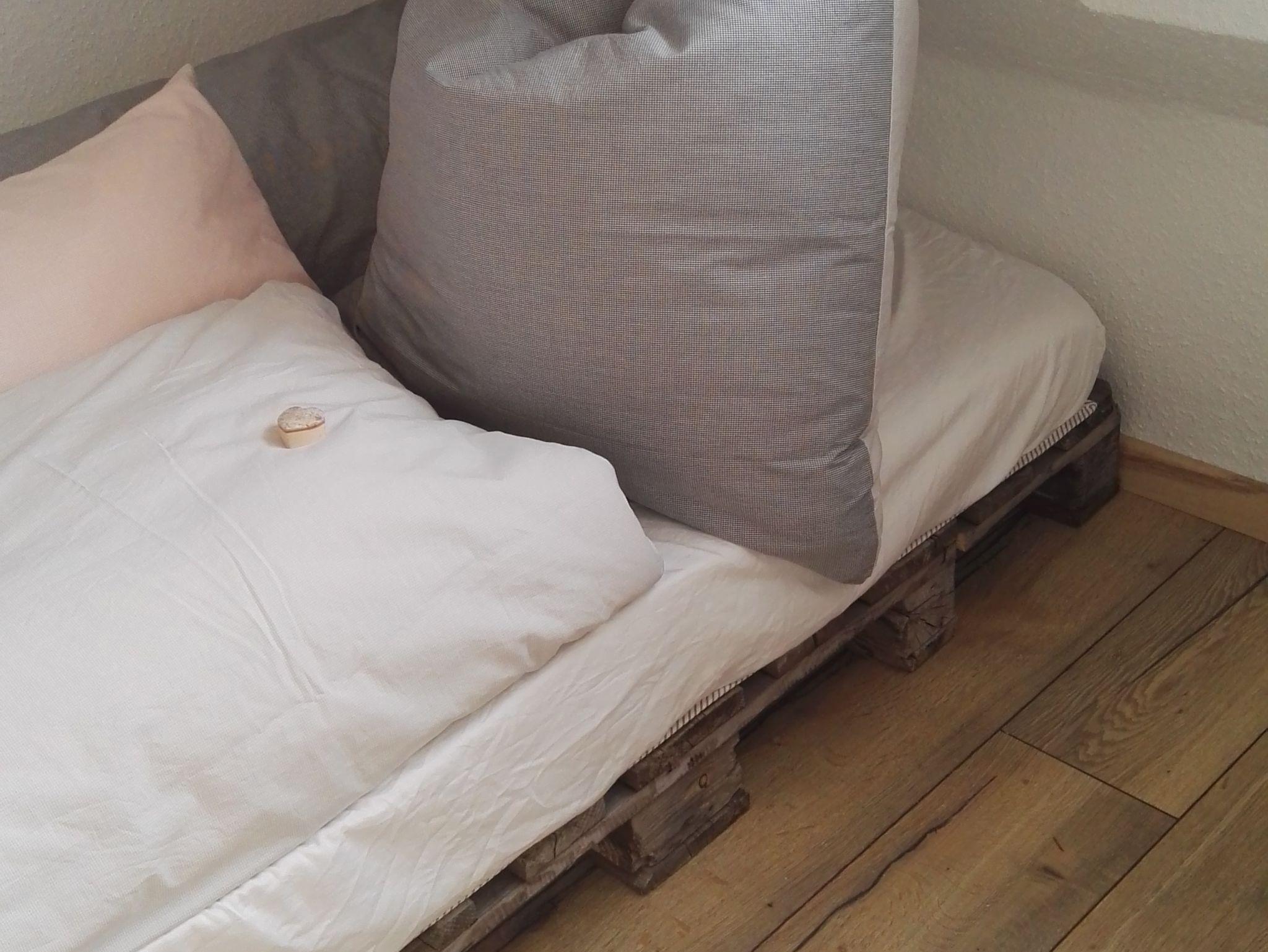 Über eine Holztreppe (Achtung Original-Treppe: kurze Trittstufen + Holz verursacht leichte Geräusche) erreichen Sie das Obergeschoss mit einem kleinen, aber feinen Kinderzimmer (ca. 6 m²). Dort steht „jungen und auch kleinsten Besuchern“ ein selbstgebautes Palettenbett (120 x 190 cm) zur Verfügung, was zum Schlafen aber auch tagsüber zum Lesen oder entspannen einlädt. Natürlich dürfen hier auch zwei Erwachsene träumen (falls Ihnen die Liegefläche zu knapp ist: ein Futonbett ist -auf Wunsch- zum Palettenbett zustellbar, so dass sich eine Liegefläche von 199 x 190 cm ergibt). Es befindet sich in diesem Zimmerchen kein Schrank.
