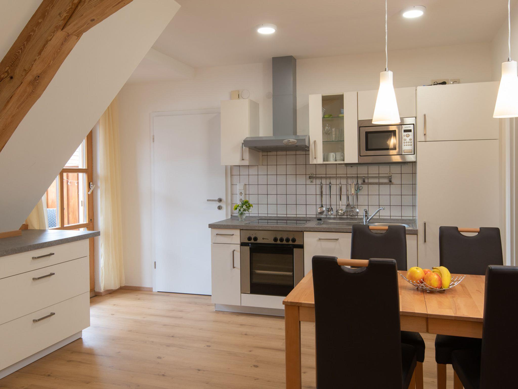 Ferienwohnung Nr. 5 hat 62 qm, ist mit 4 Sternen (DTV) bewertet, wurde 2023 neu renoviert und bietet Platz für 4 - 5 Personen. Elternschlafzimmer mit 1 Doppelbett ( 200x200 ) sowie Kindergitterbett. Kinderzimmer mit 2 Einzelbetten (je 90x190). Die komplett ausgestattete Küche mit Geschirrspüler, Kühlschrank inkl. Gefrierfach, Ceranfeld, Backofen, Mikrowelle, Wasserkocher, Eierkocher, Toaster und Kaffeemaschine mit Mahlwerk lässt keine Wünsche offen. Essplatz und Sofa sowie Flachbild -TV mit Kabelanschluß. Überdachten Balkon mit direkten Blick zum Storchennest.