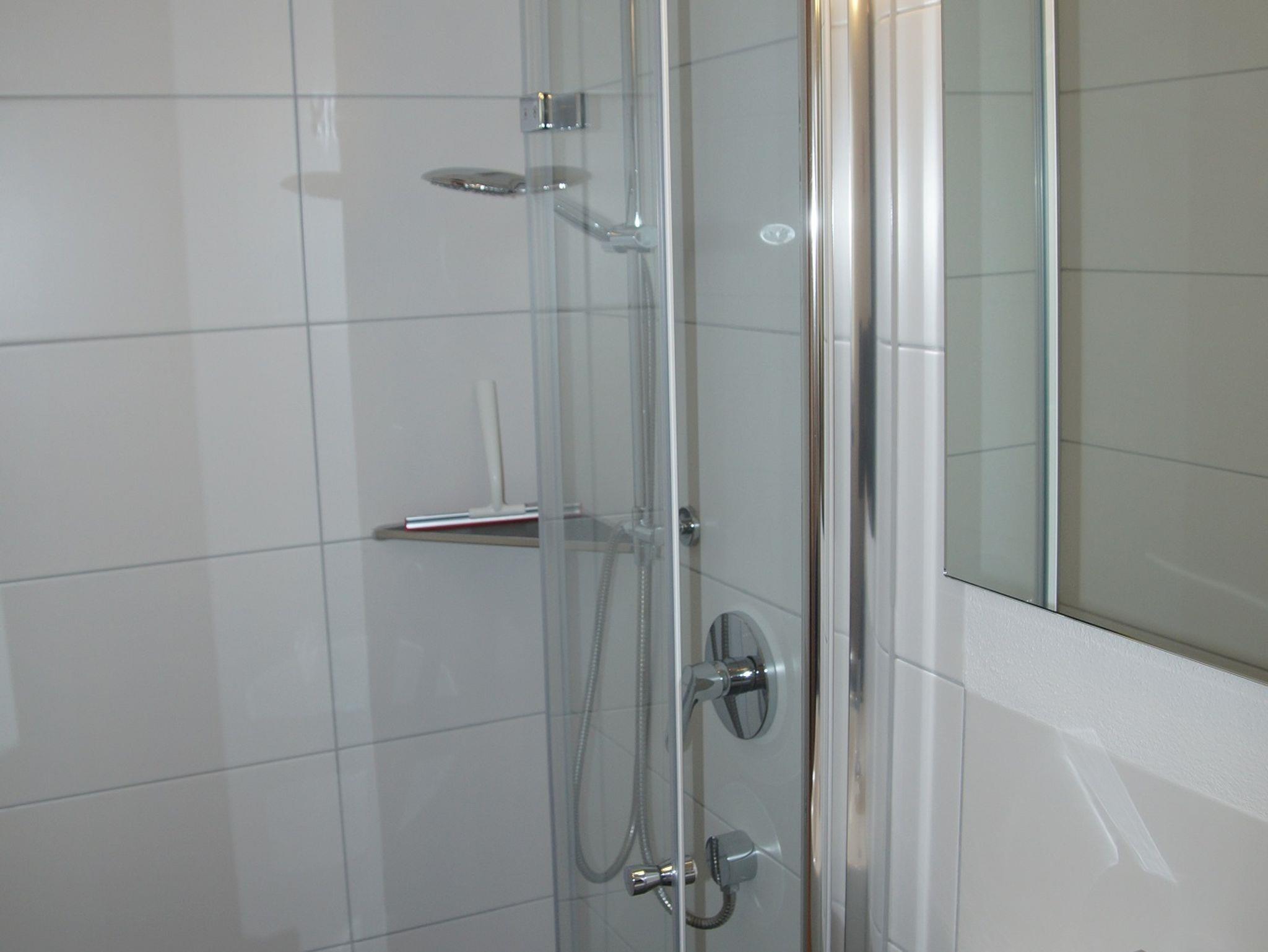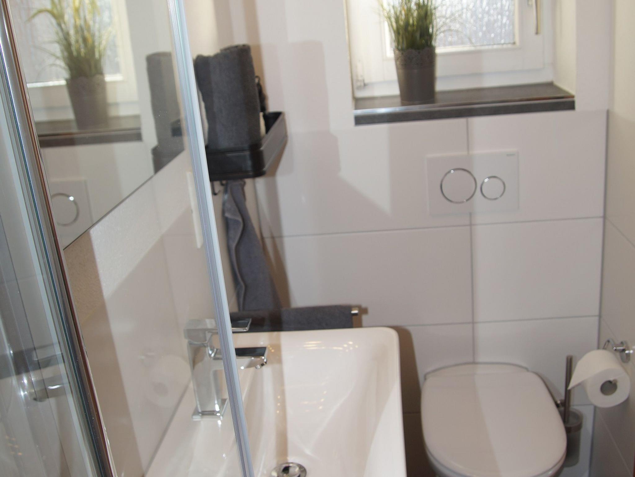 Toilettenraum mit Dusche, Waschbecken und WC. Zugang zum Balkon vom Flur.