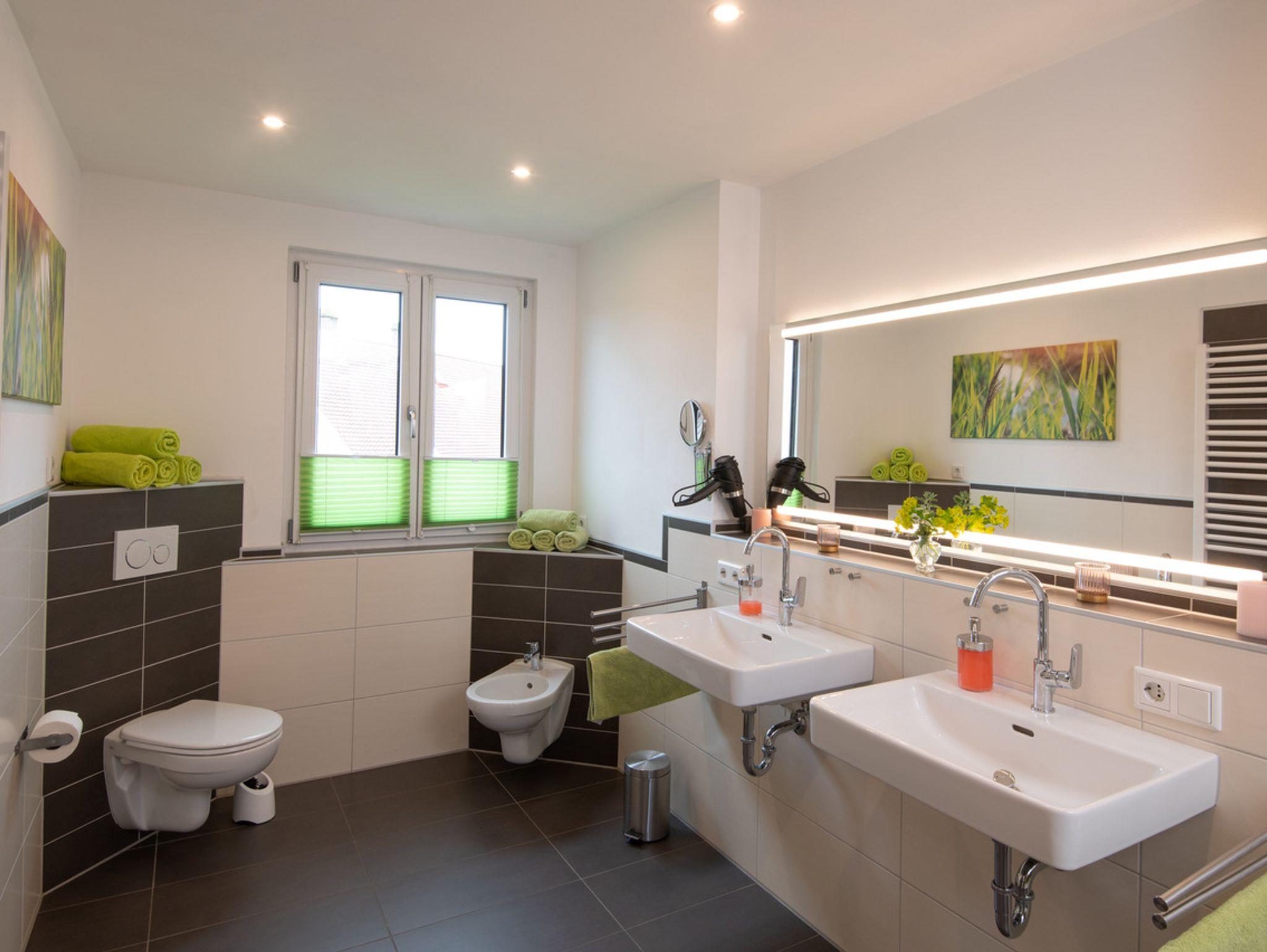 Großes Bad mit Fenster, Doppelwaschbecken, Handtuchtrockner, Föhn, Wc, Bidet, großen Spiegel und ebenerdiger Dusche. An allen Fenstern Aussenrollos und in Schlafräumen Fliegengitter.