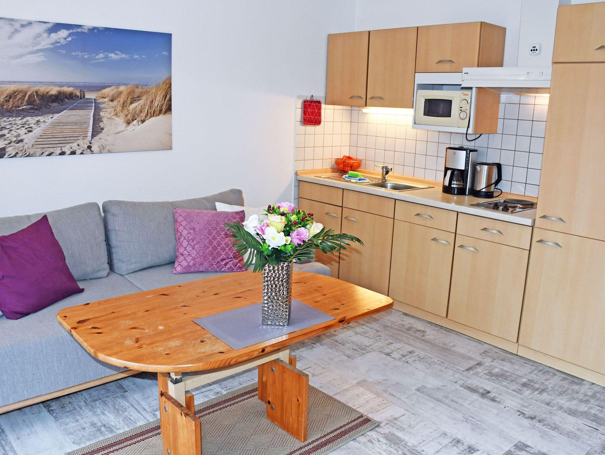 Im Wohn- und Schlafraum mit großer Fensterfront (die über Jalousien zu verdunkeln ist) und Zugang zur Terrasse, befinden sich eine bequeme Schlafcouch mit Tisch und ein modernes Flachbild-TV-Gerät. Die Schlafcouch kann für 2 Gäste aufgebettet werden. Ein Kleinkind bis 3 Jahre kann zusätzlich in einem Kinderbett schlafen.